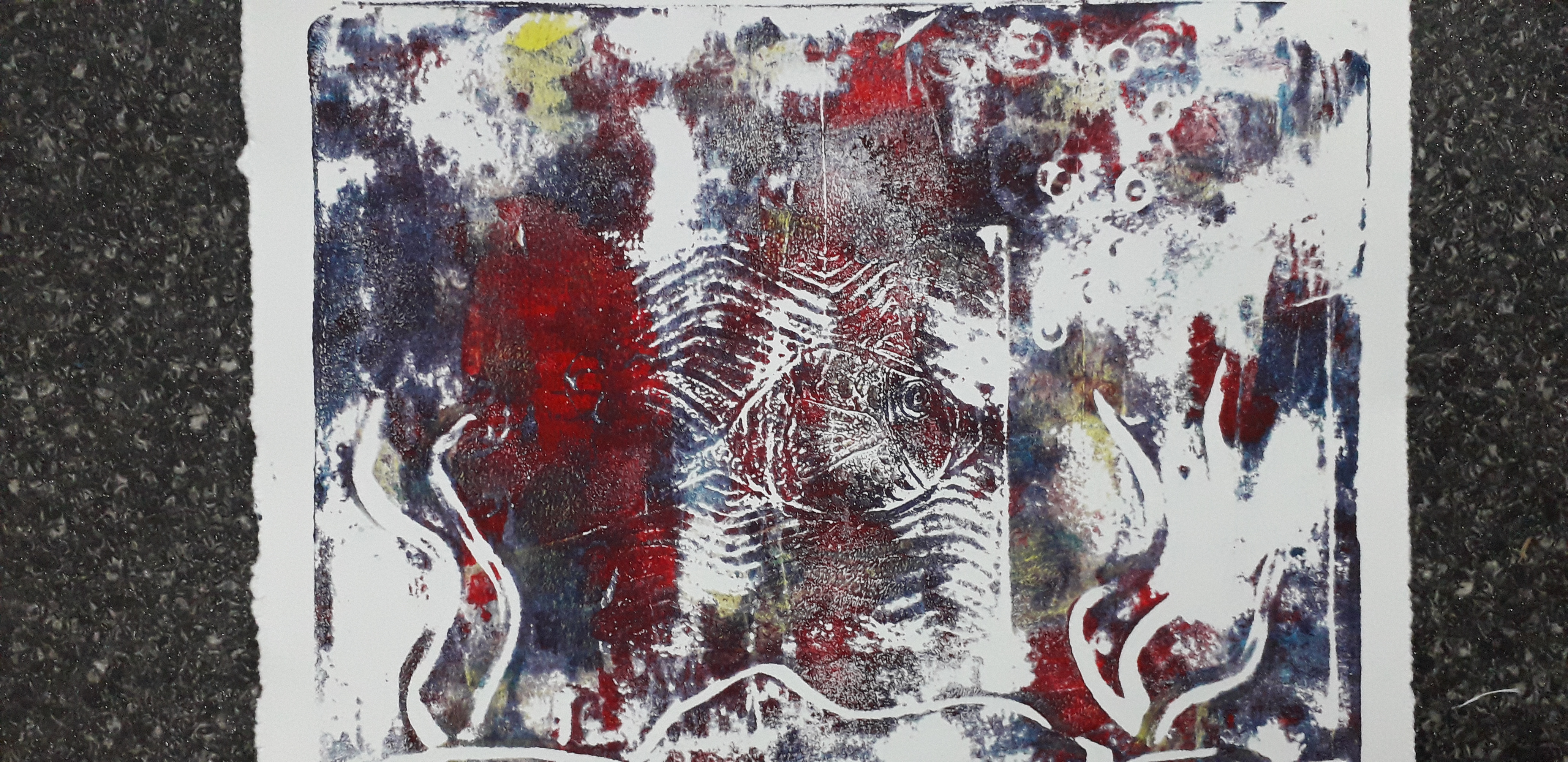 Fish lino cut pushed on to plate and new image pulled on watercolour paper.