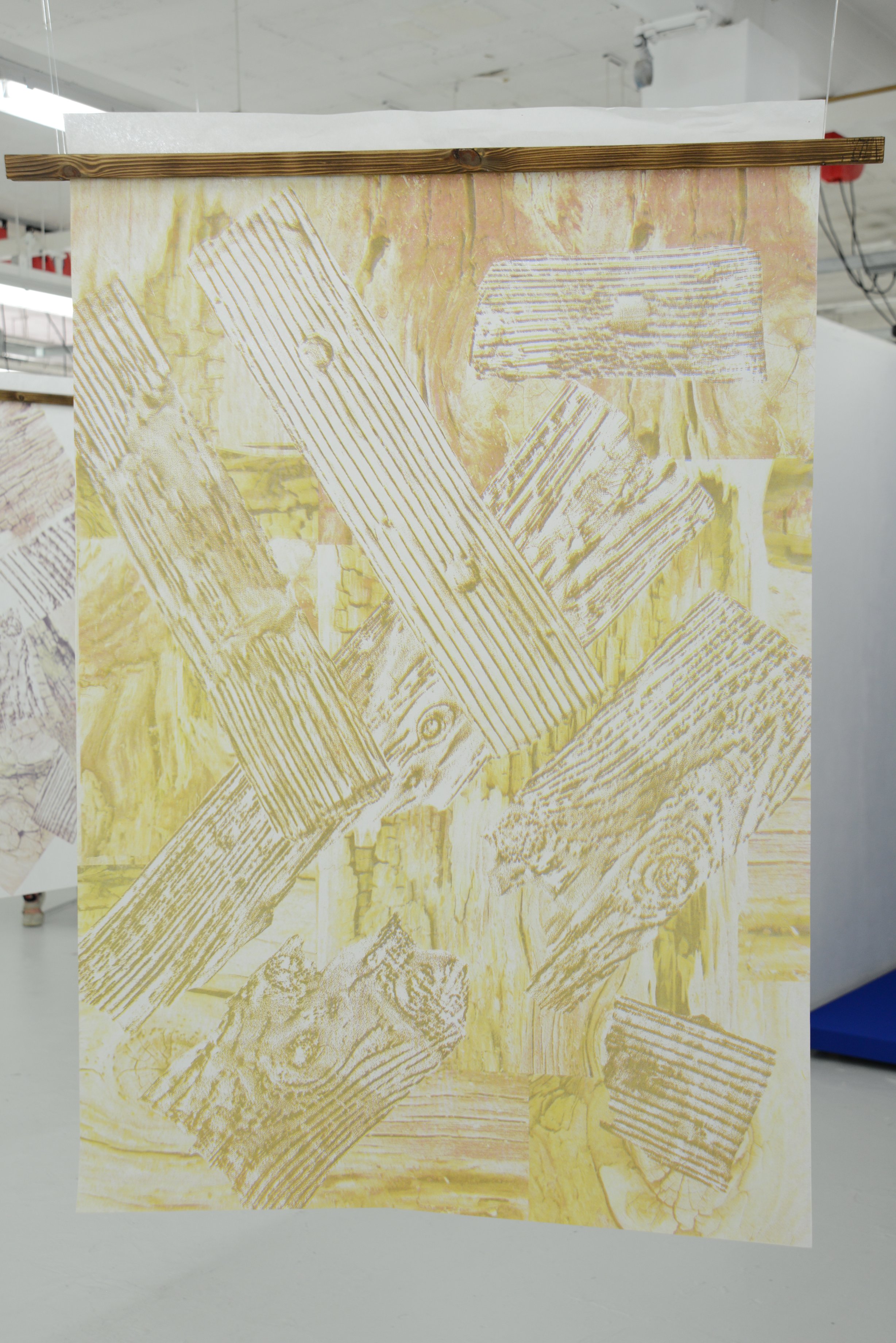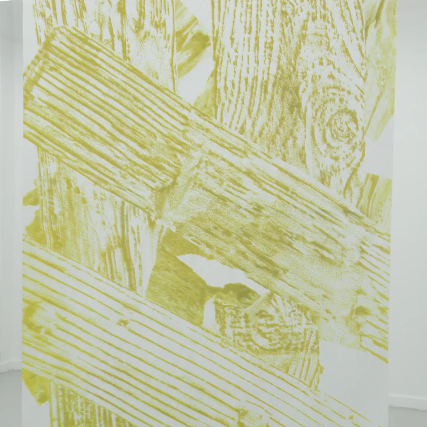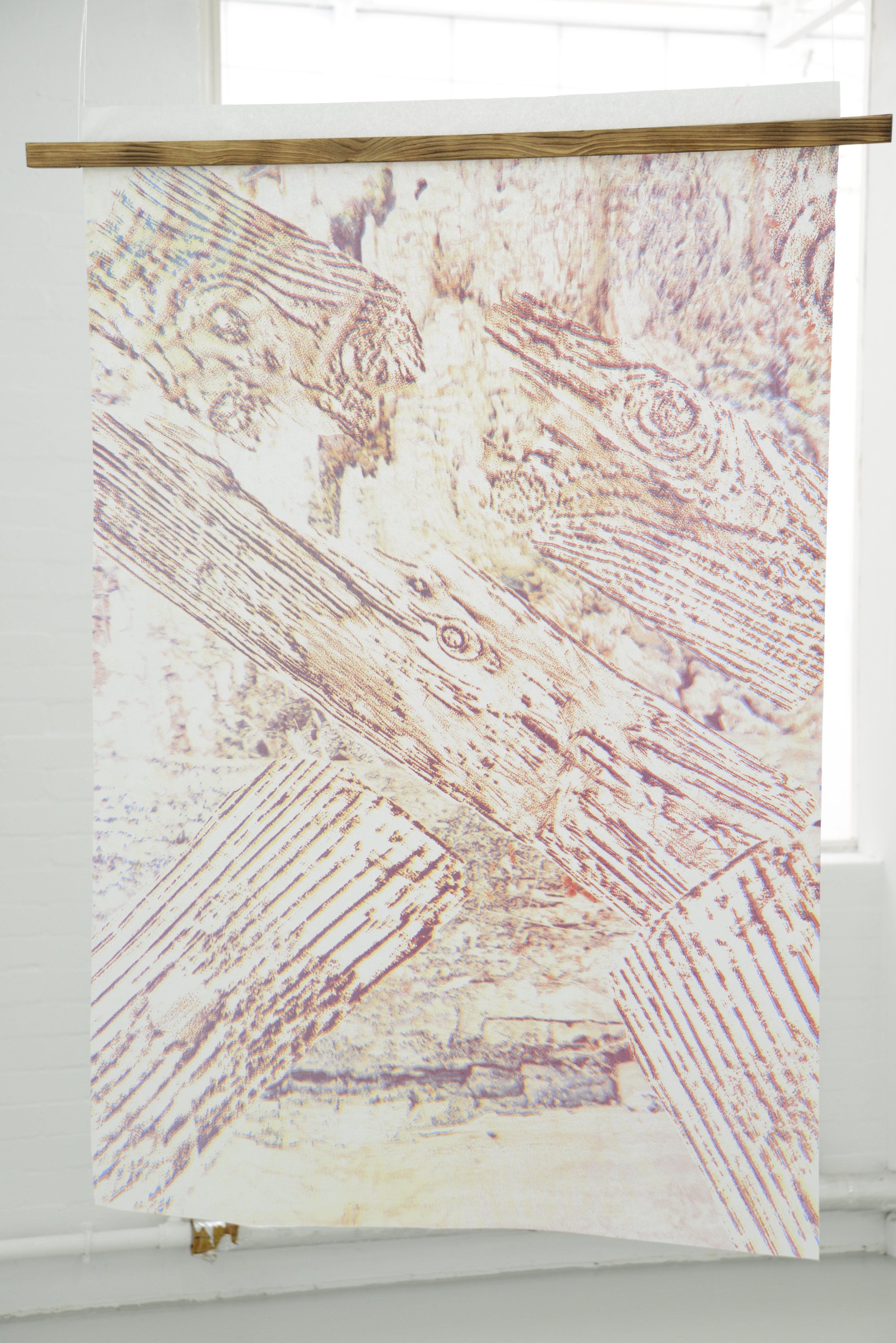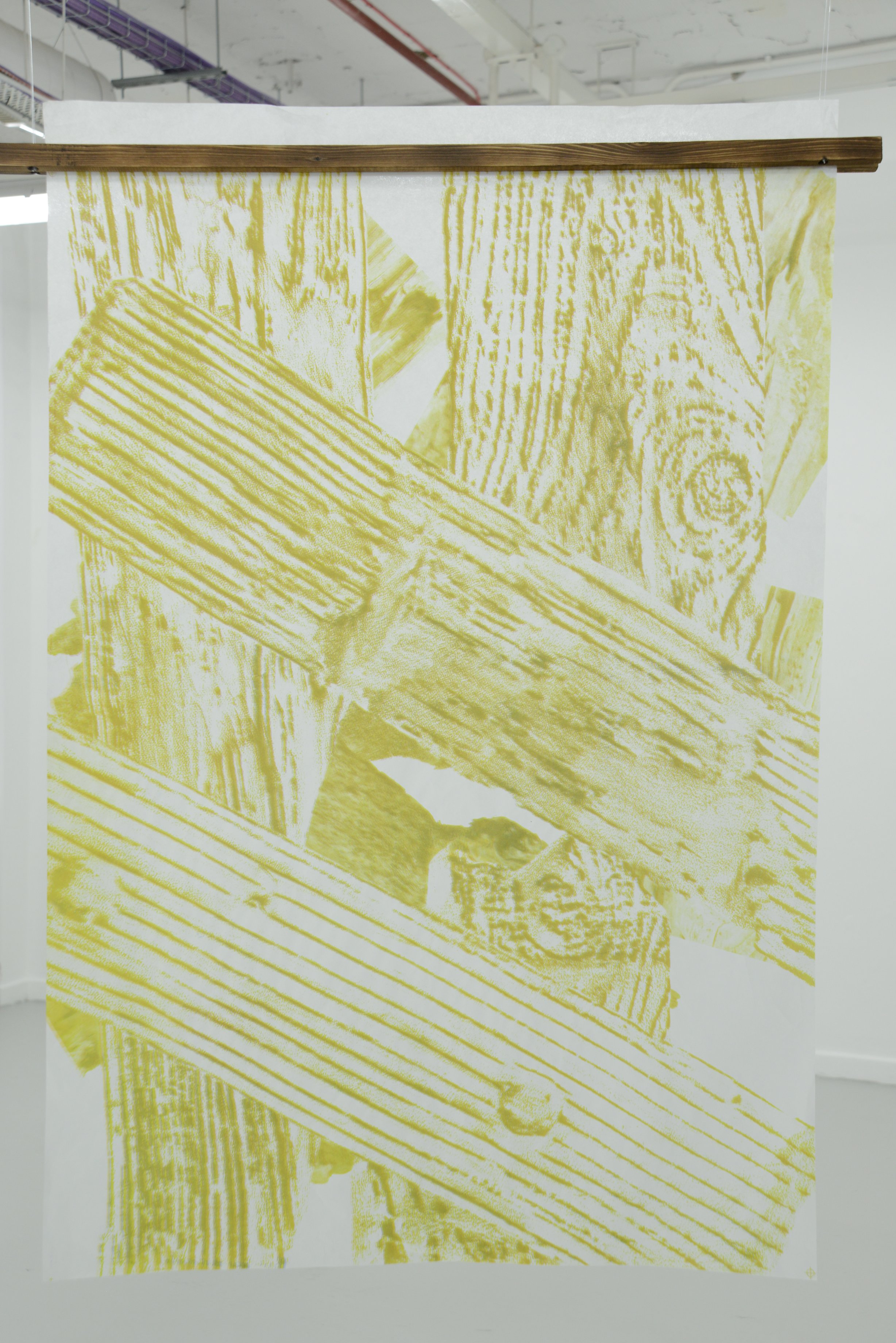 The artwork is made up of images of fence wood screen printed onto both sides of Kozo (Japanese paper) then suspended so it can be viewed from both sides.