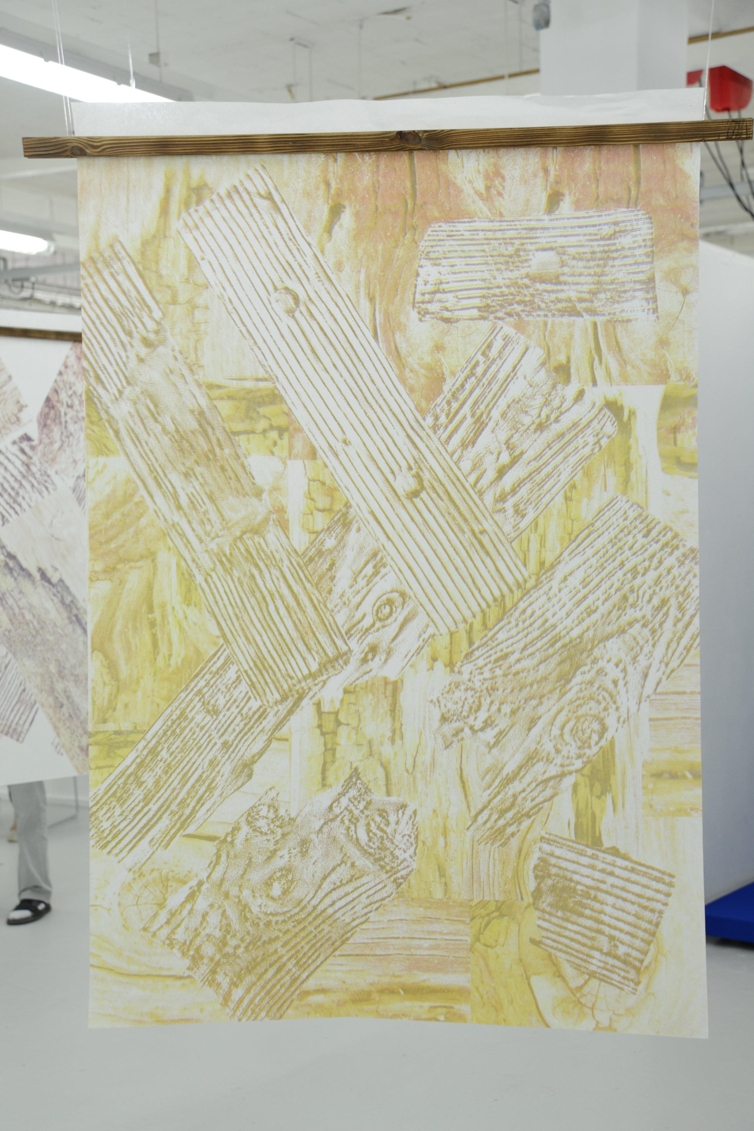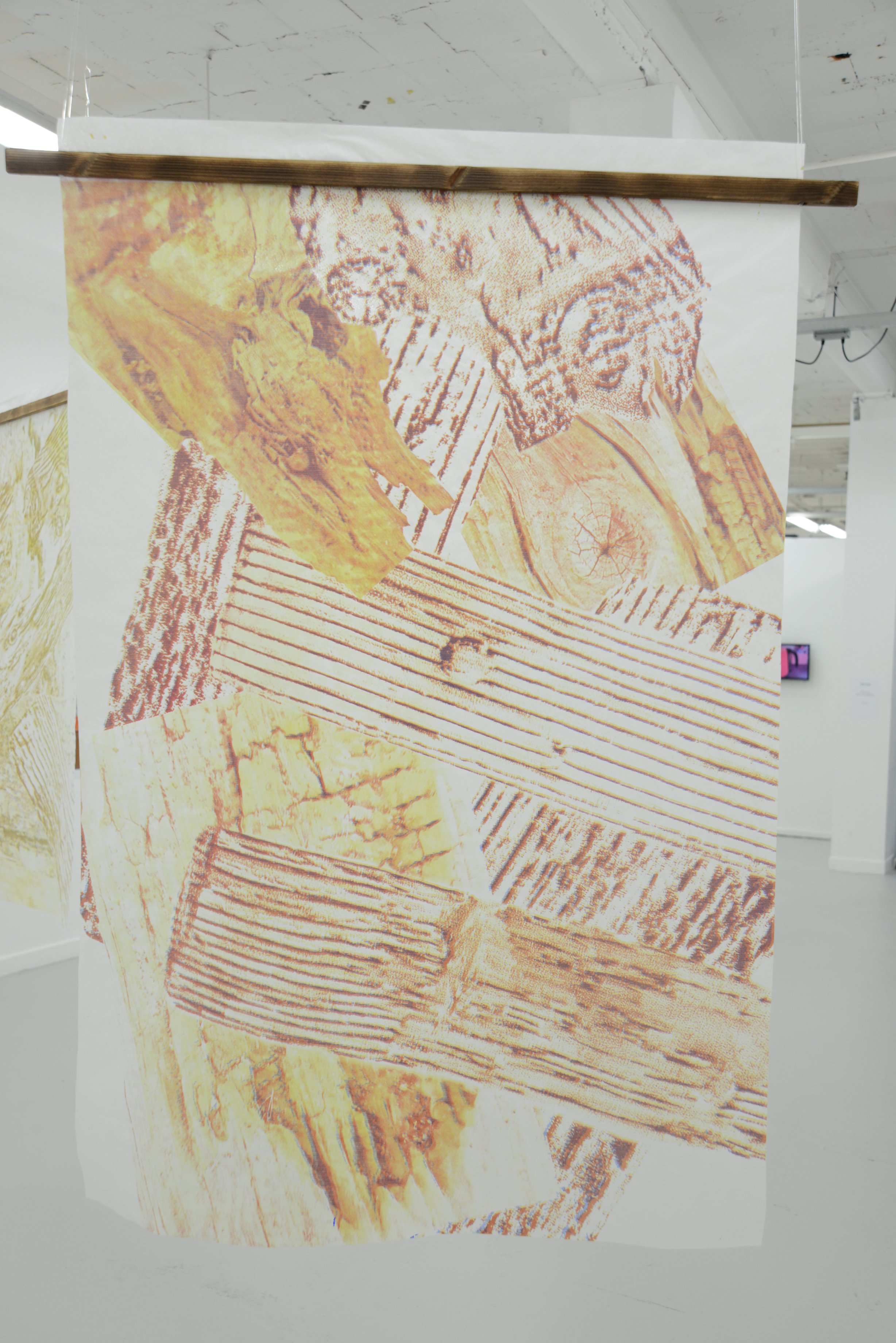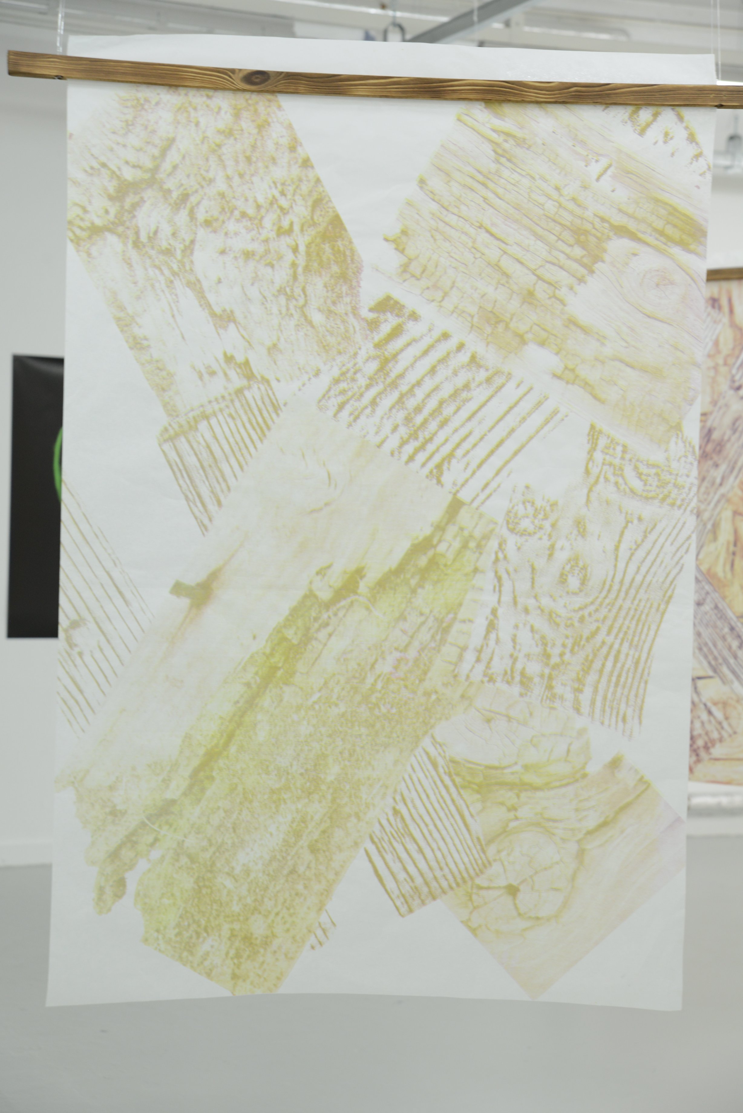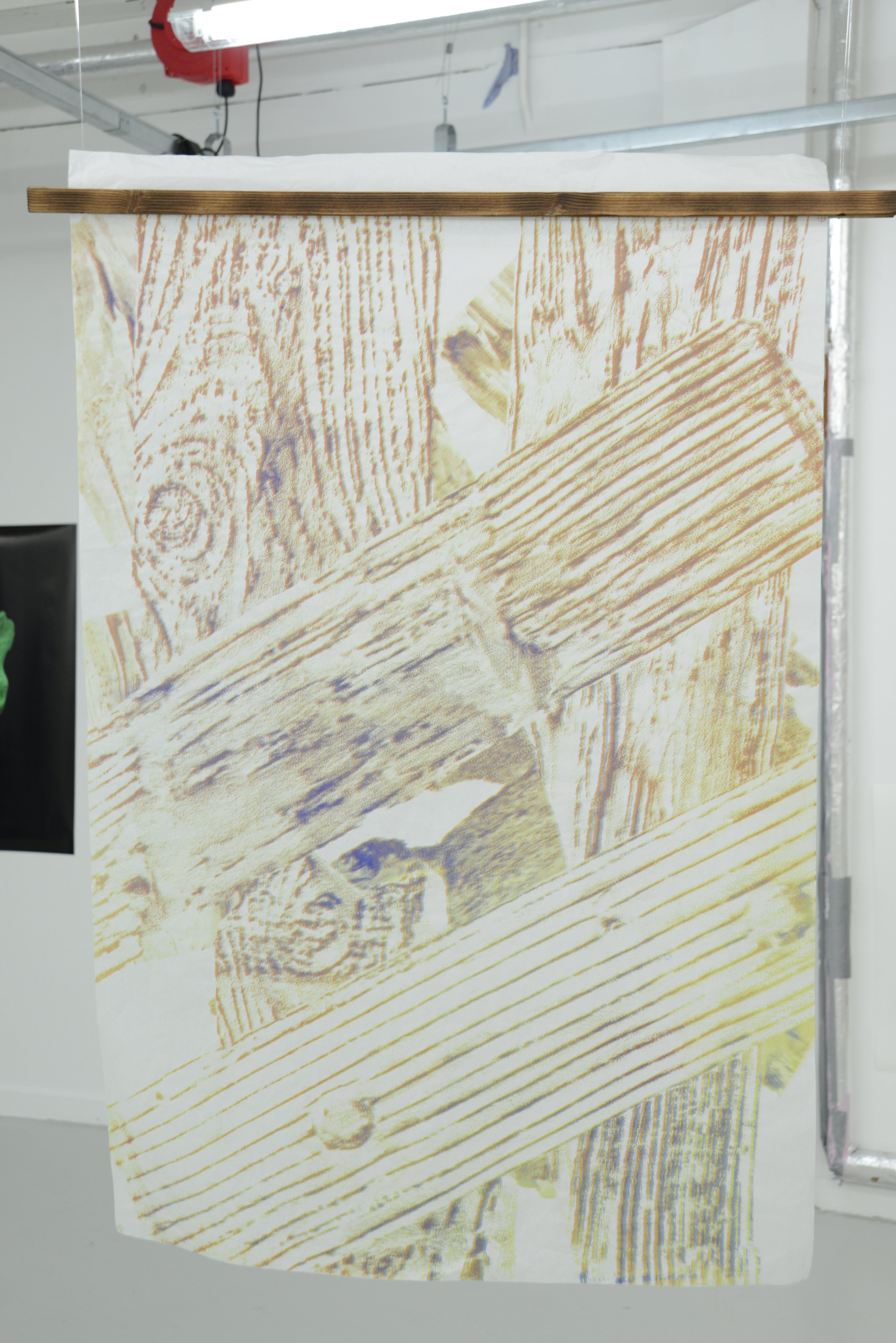 The artwork is made up of images of fence wood screen printed onto both sides of Kozo (Japanese paper) then suspended so it can be viewed from both sides.