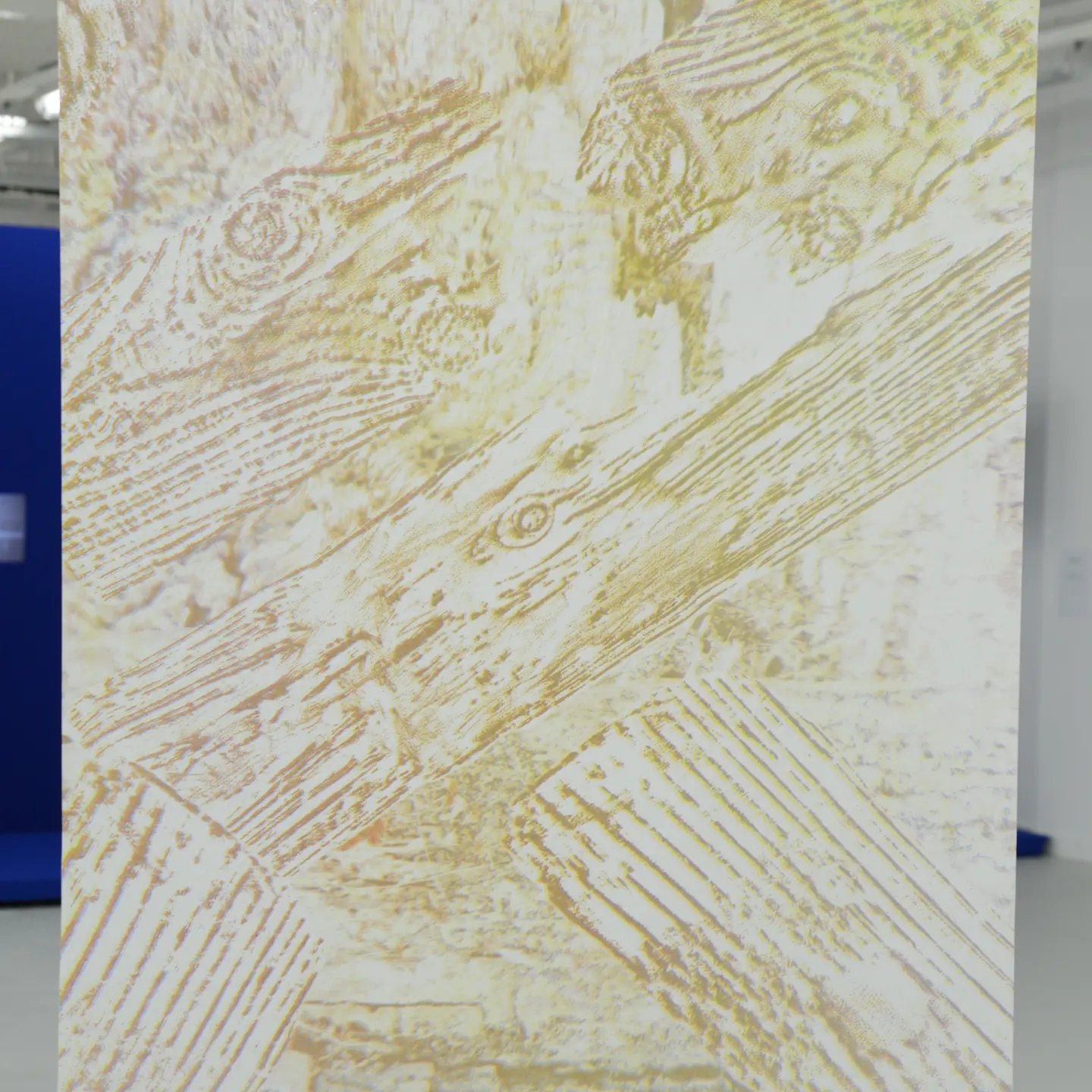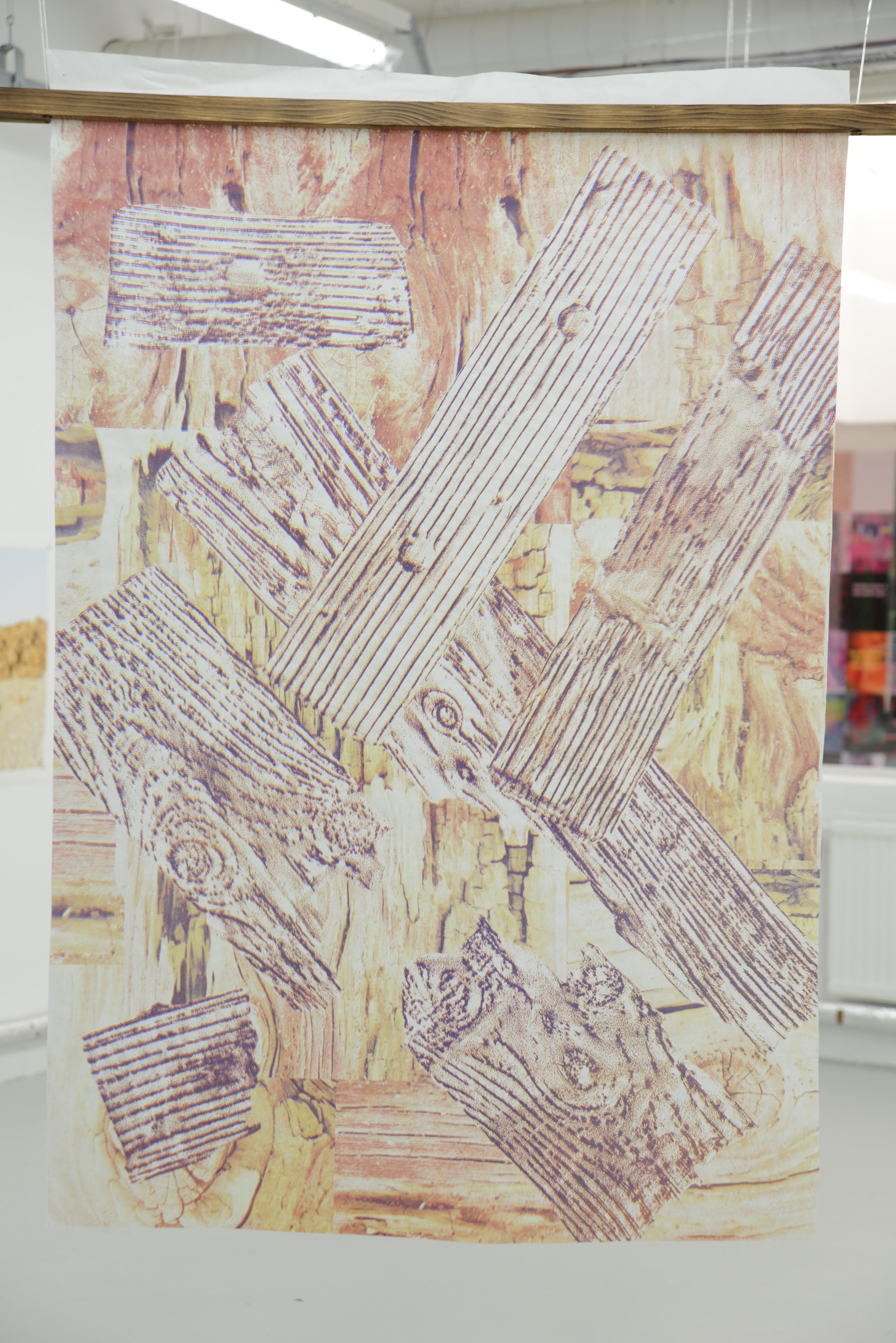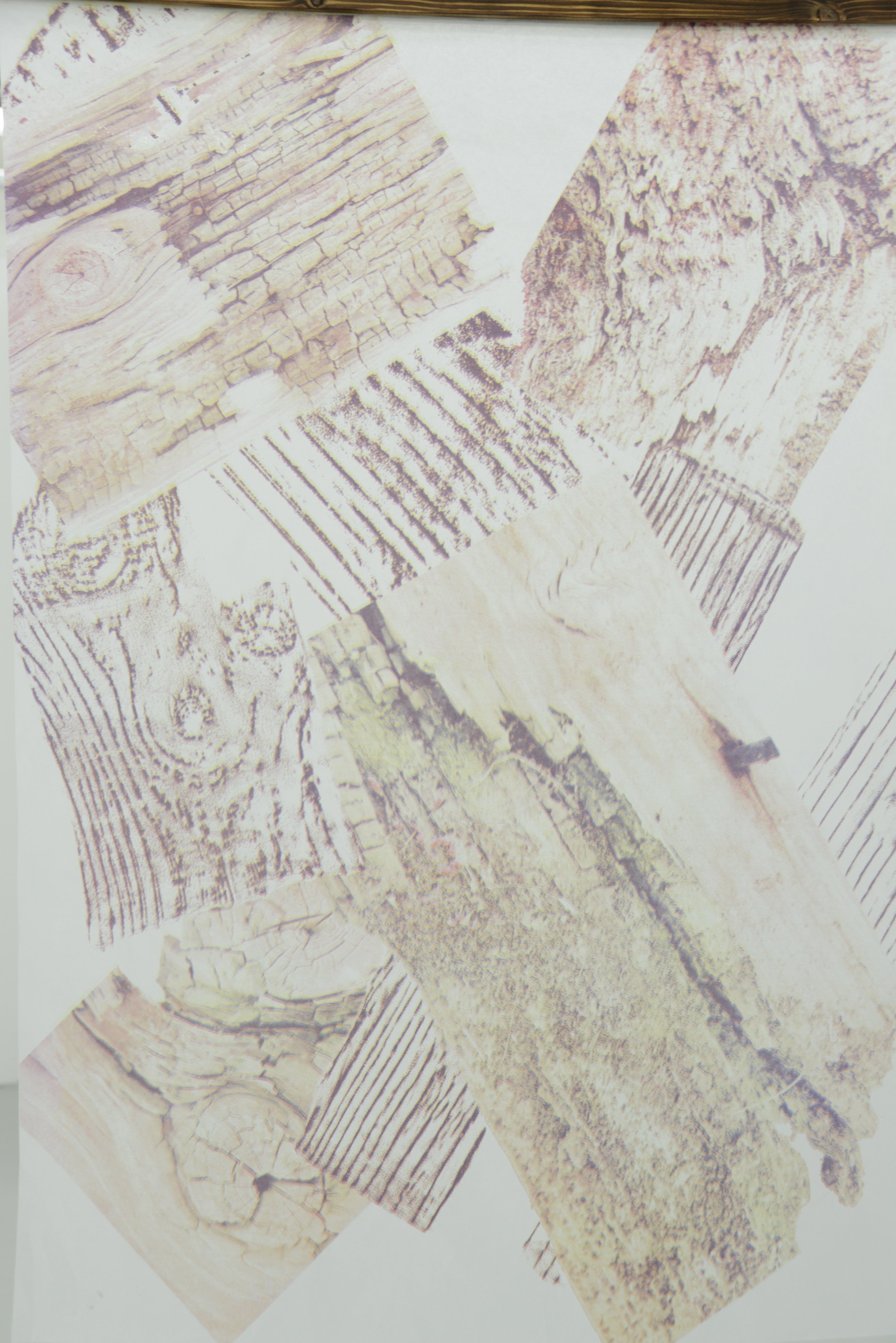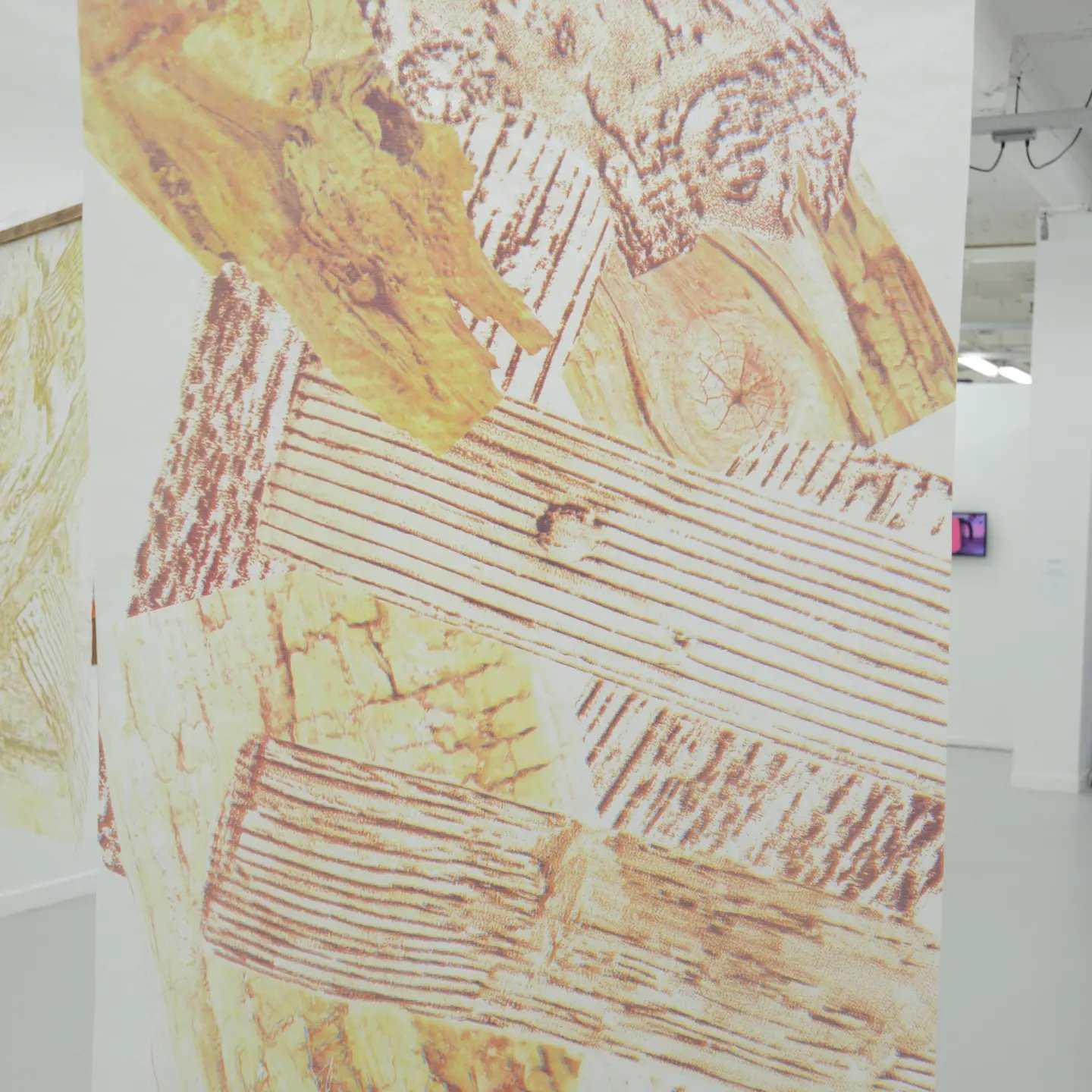 The artwork is made up of images of fence wood screen printed onto both sides of Kozo (Japanese paper) then suspended so it can be viewed from both sides.