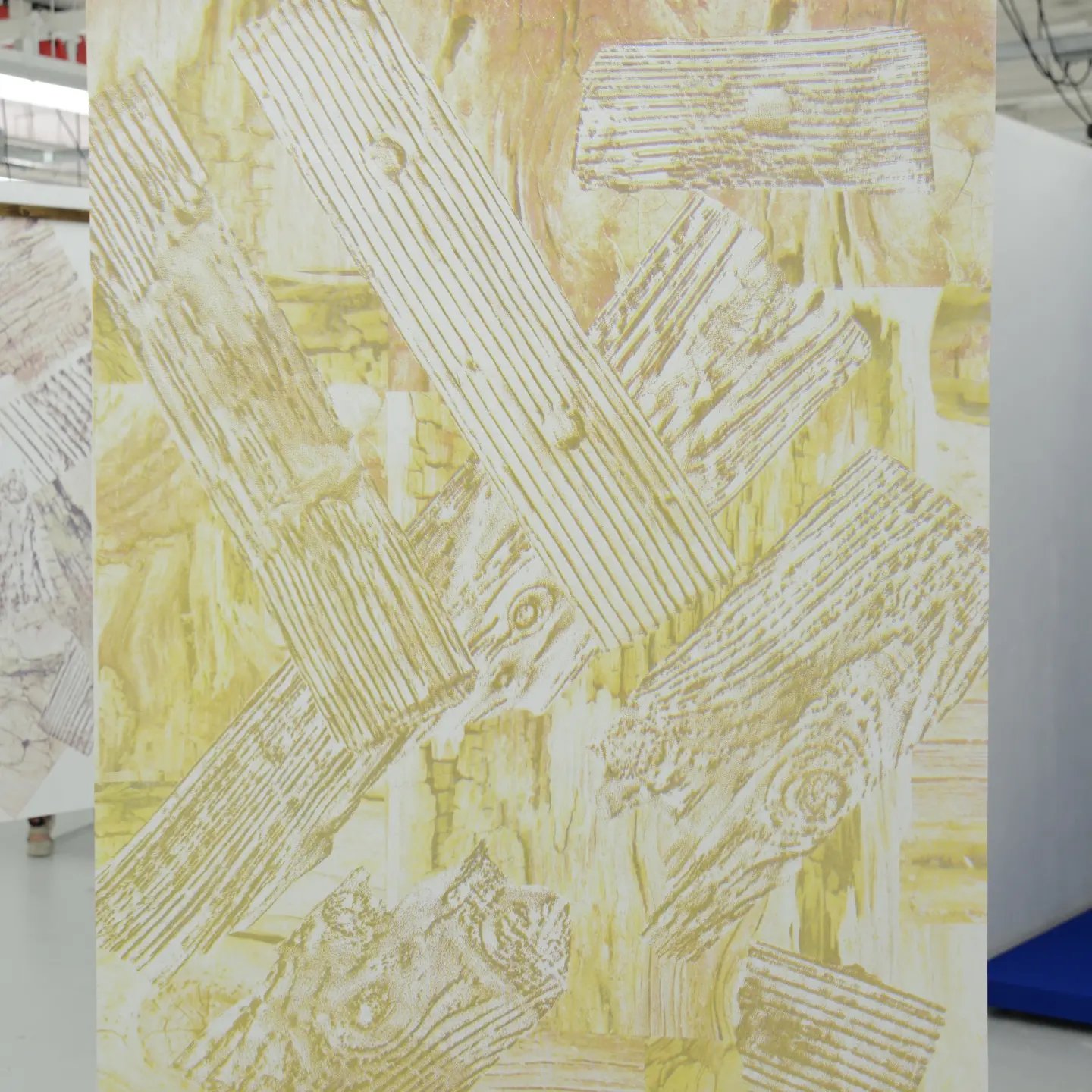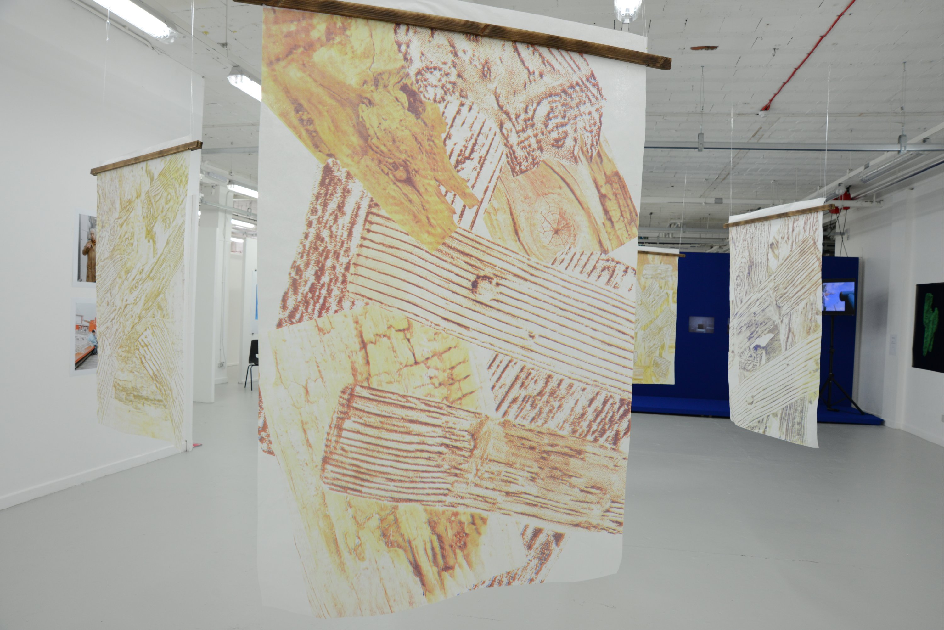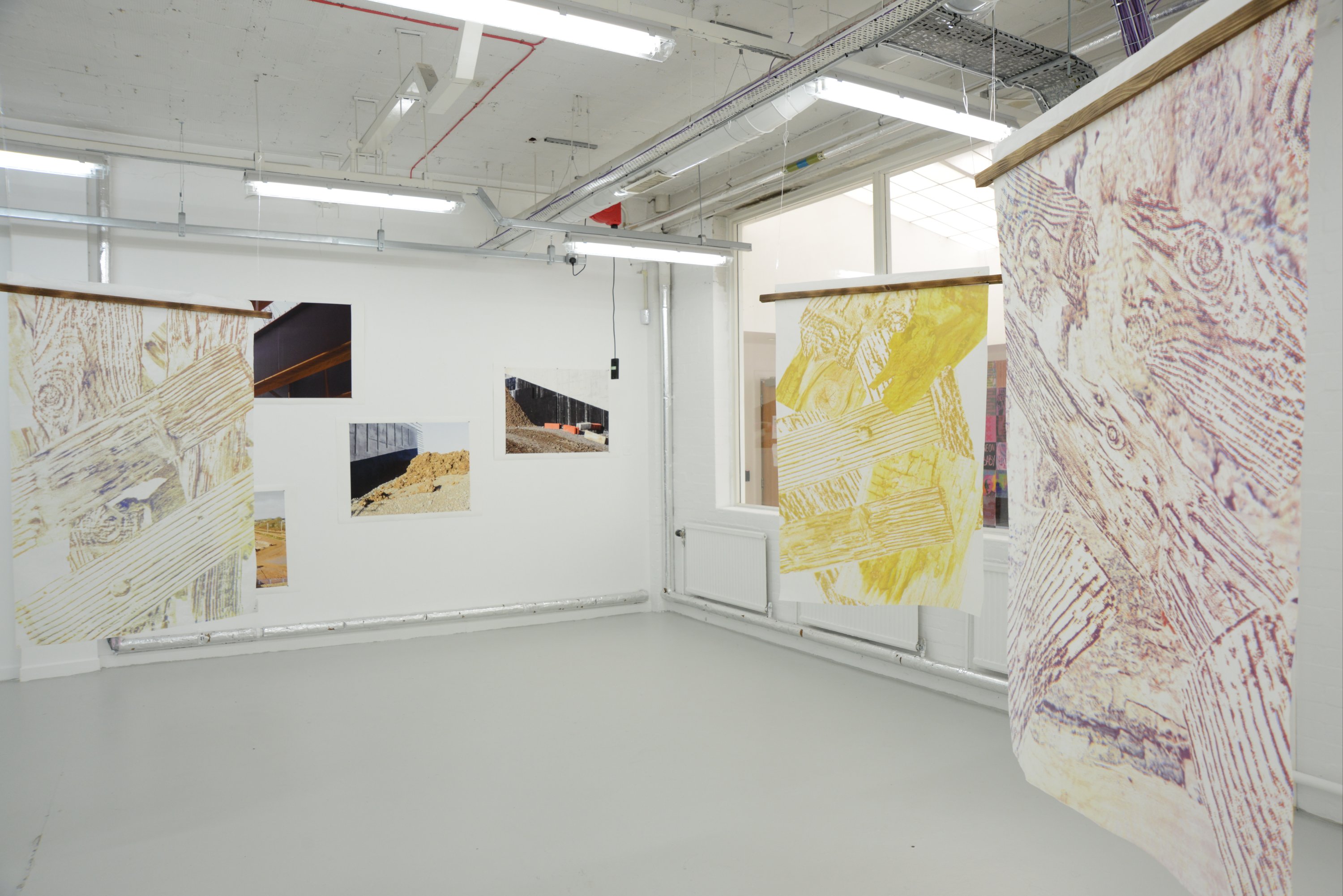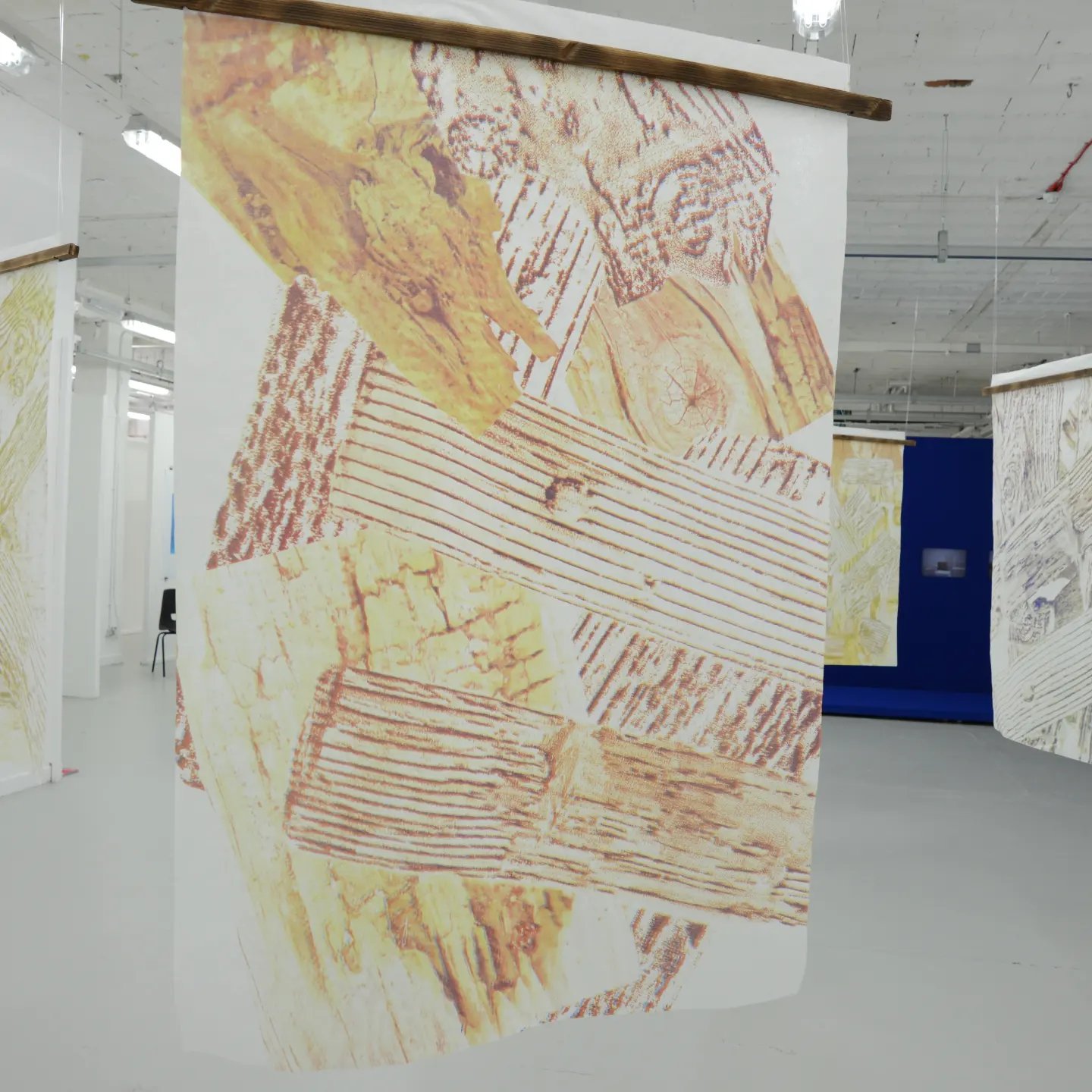 The artwork is made up of images of fence wood screen printed onto both sides of Kozo (Japanese paper) then suspended so it can be viewed from both sides.