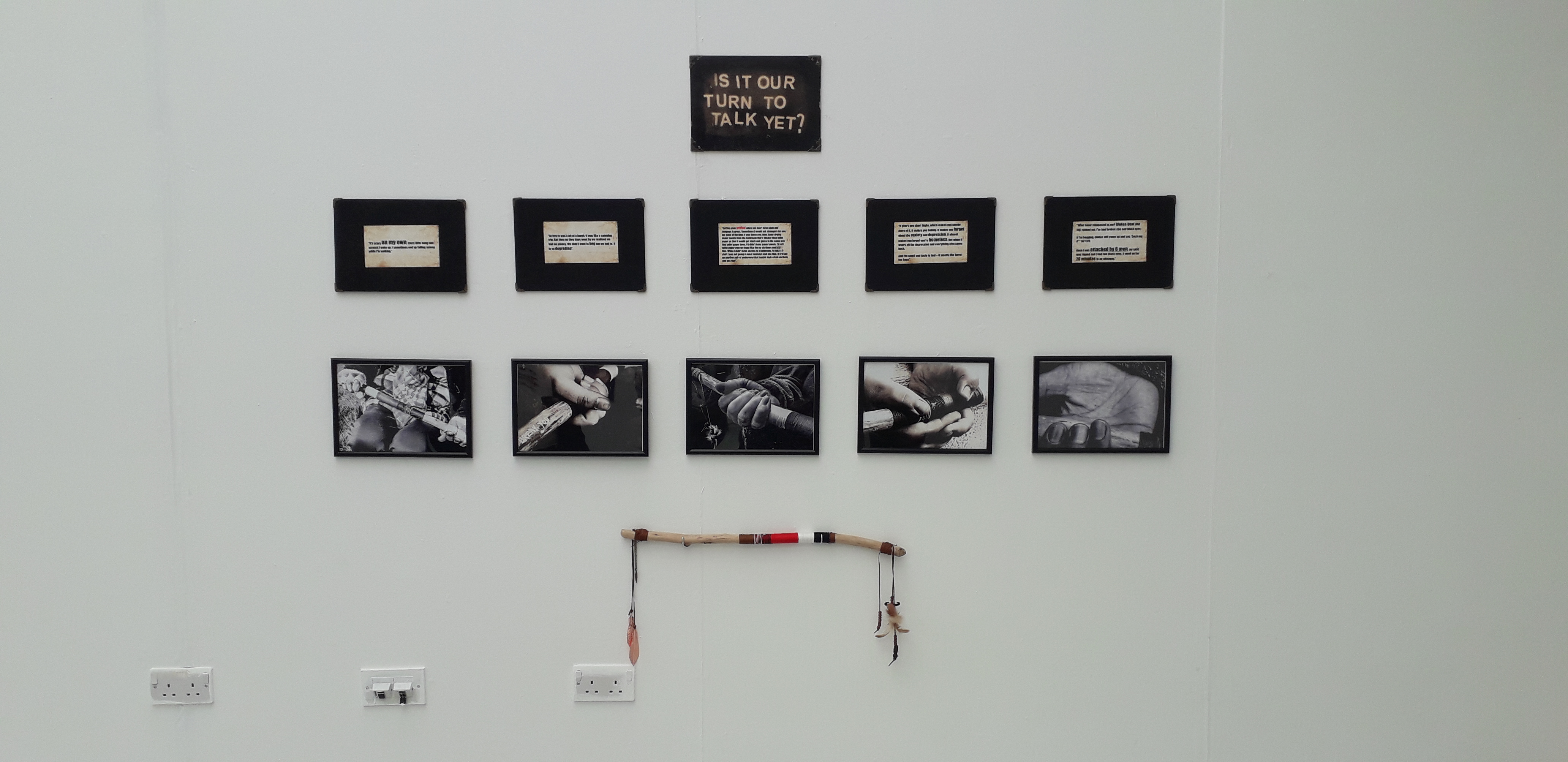A photograph of a pond taken by the artist has been over painted with oil representing his memories of extreme weather and how it made him feel. It is a large painting which dominates the wall it is displayed on the paint has been added with energy and in different thicknesses only part of the photo shows through.