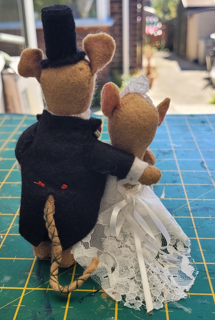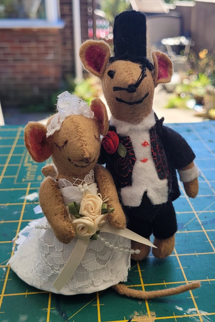 Special commission for a friends wedding day, she provided the basic mouse pattern and materials to use along with instructions to make the male mouse taller. They have been fun to make.