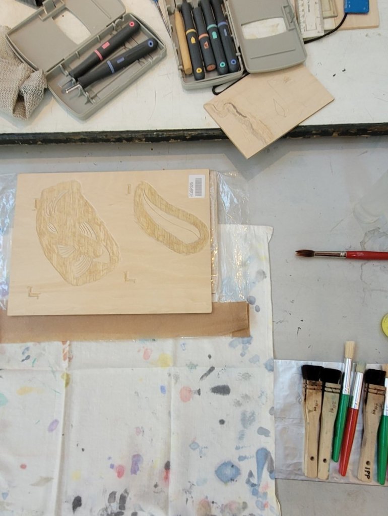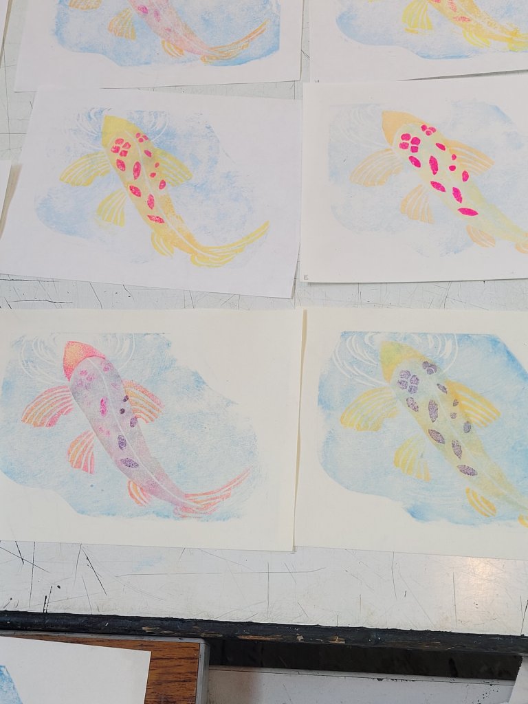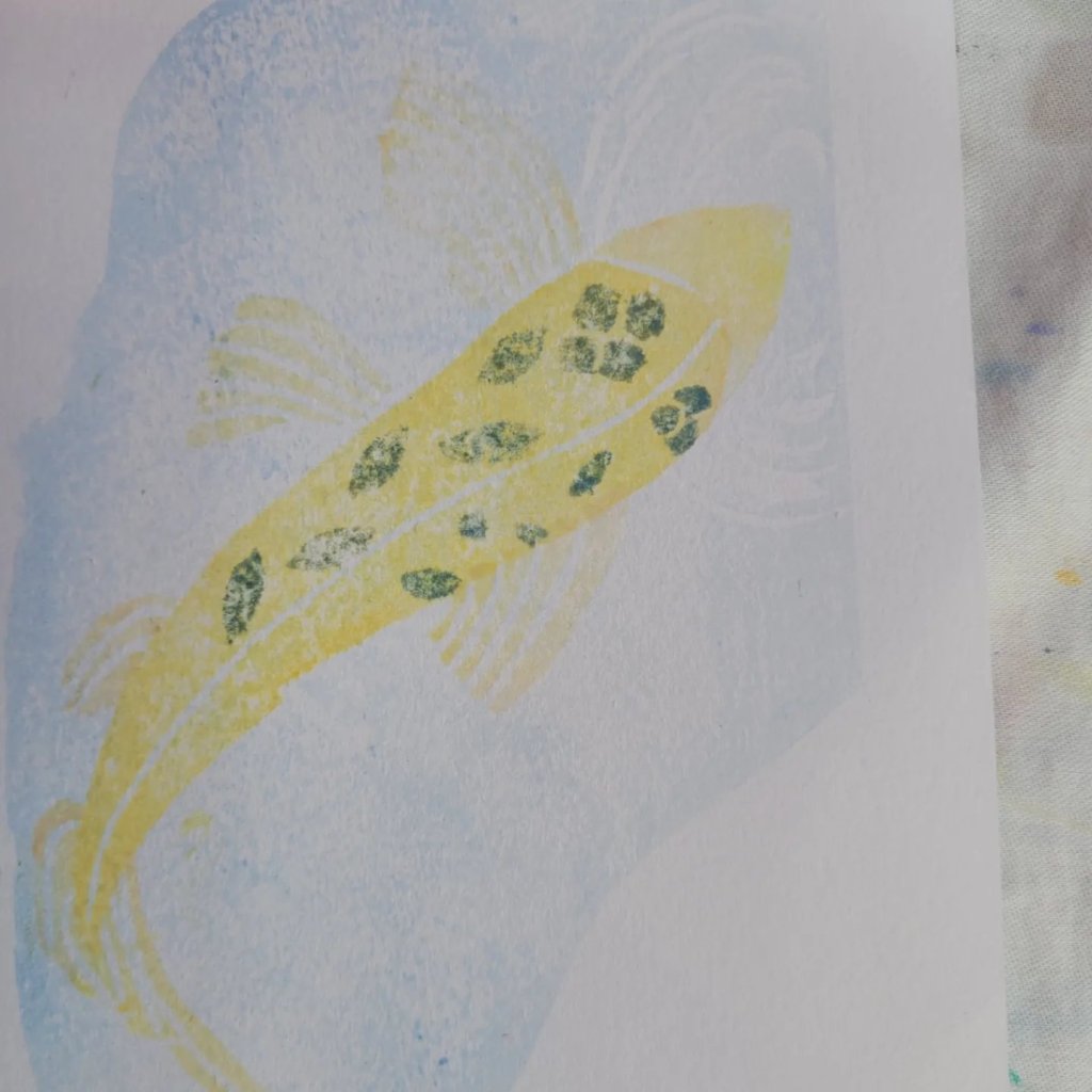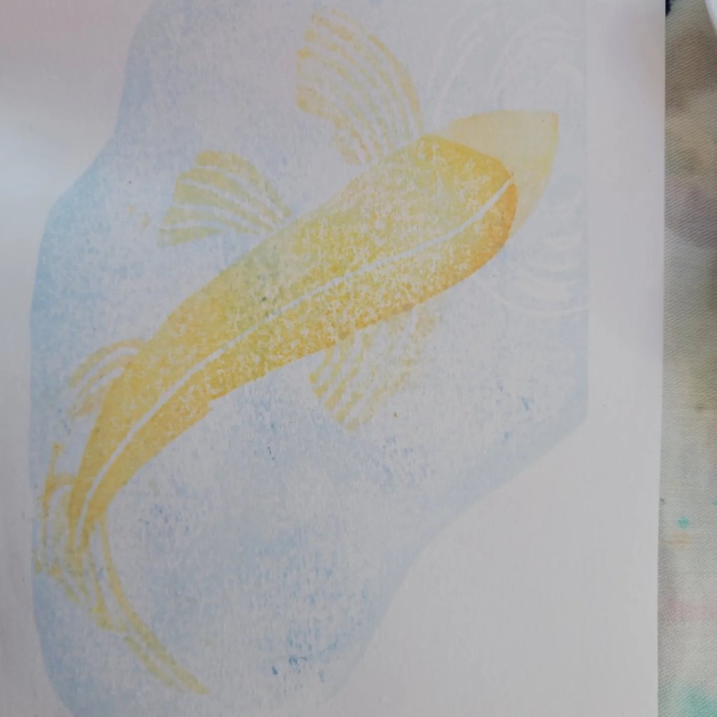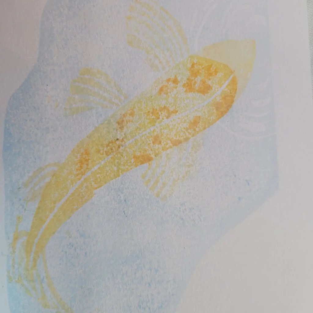 This is my first attempt under the instruction of Julie Evans who is our tutor for the weekend. I was told to create an image 11cm x16 cm I’ve chosen a carp as it feels like a Japanese image.