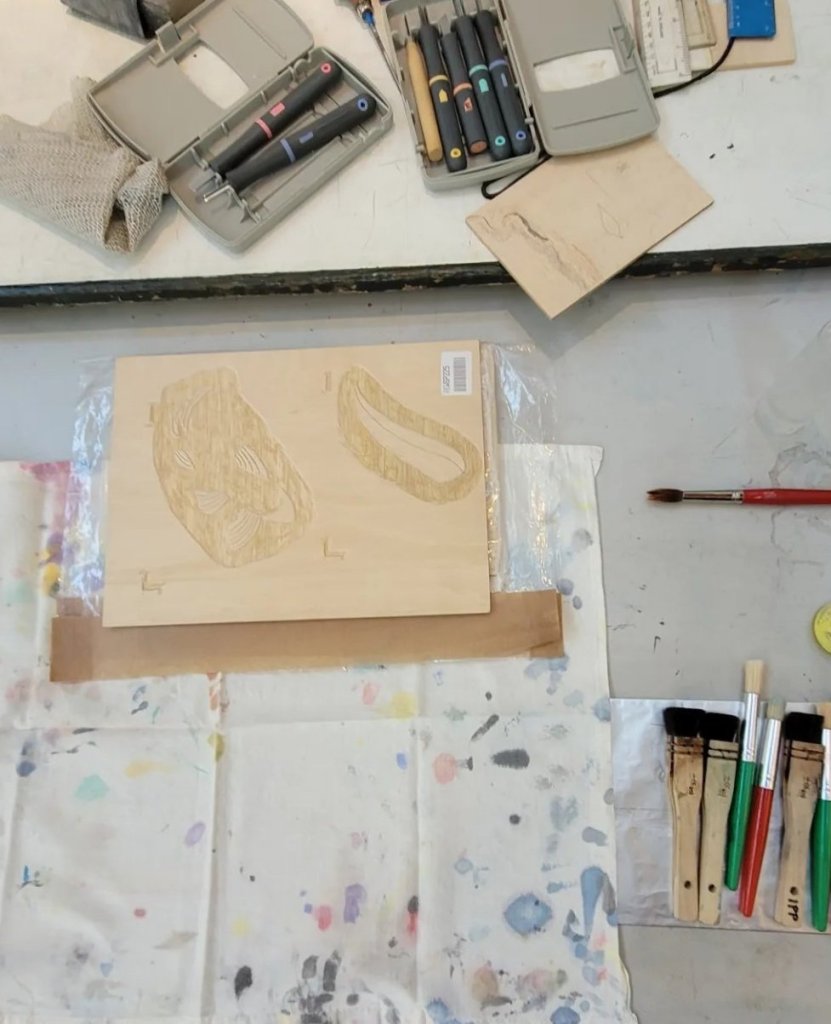 The background is carved first on one image then the body of the fish then the fins and tail and finally flowers which decorate the body.