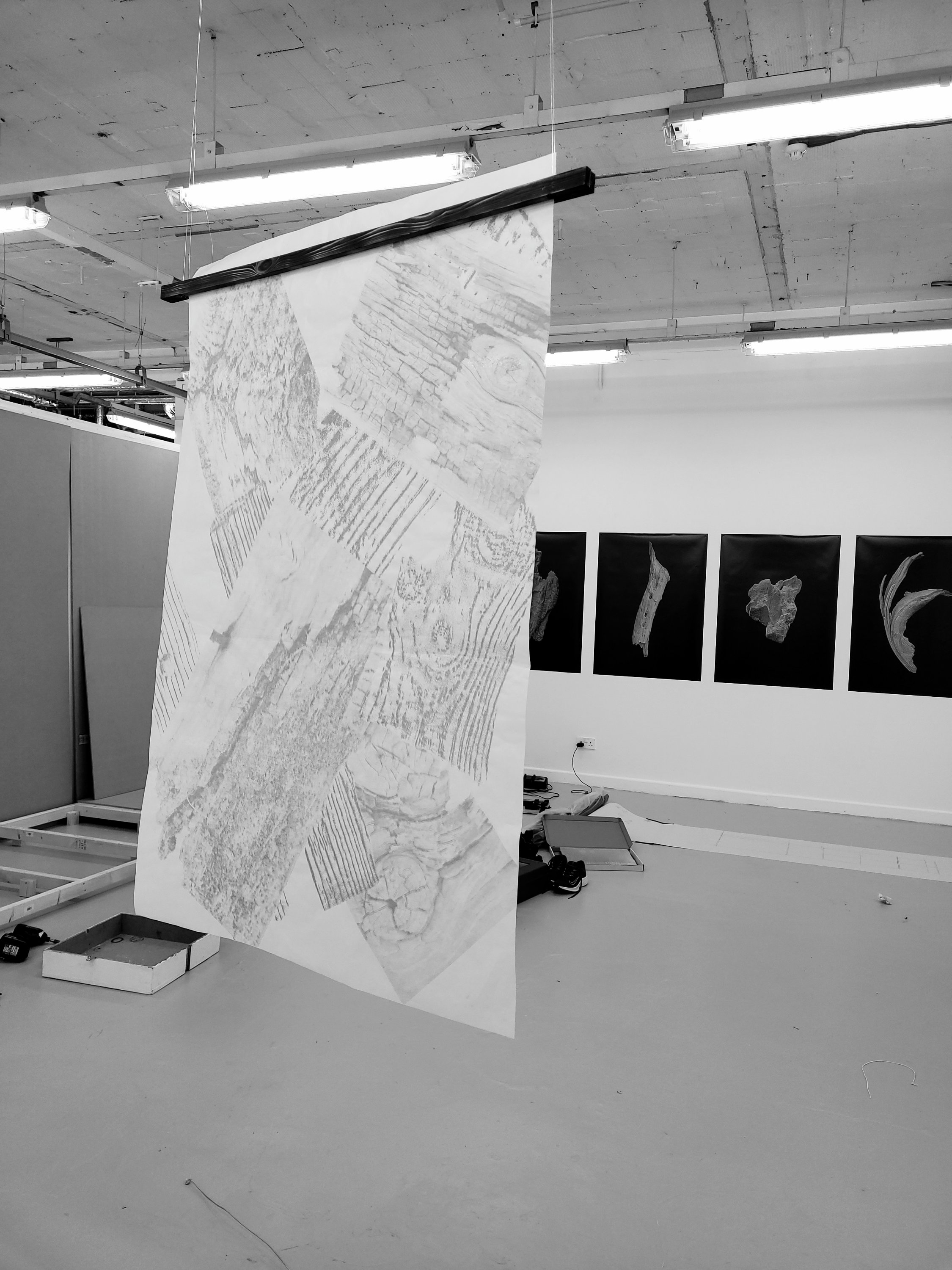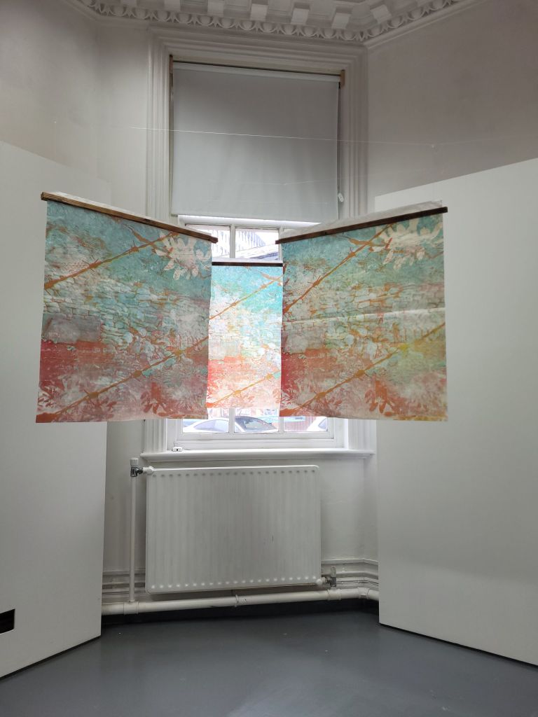 This is hung using pine brackets, which have been burnt they are held together using magnets, then hung on fishing wire. I hung them so the light from the window shone through, I also wanted people to walk around the back of the prints.