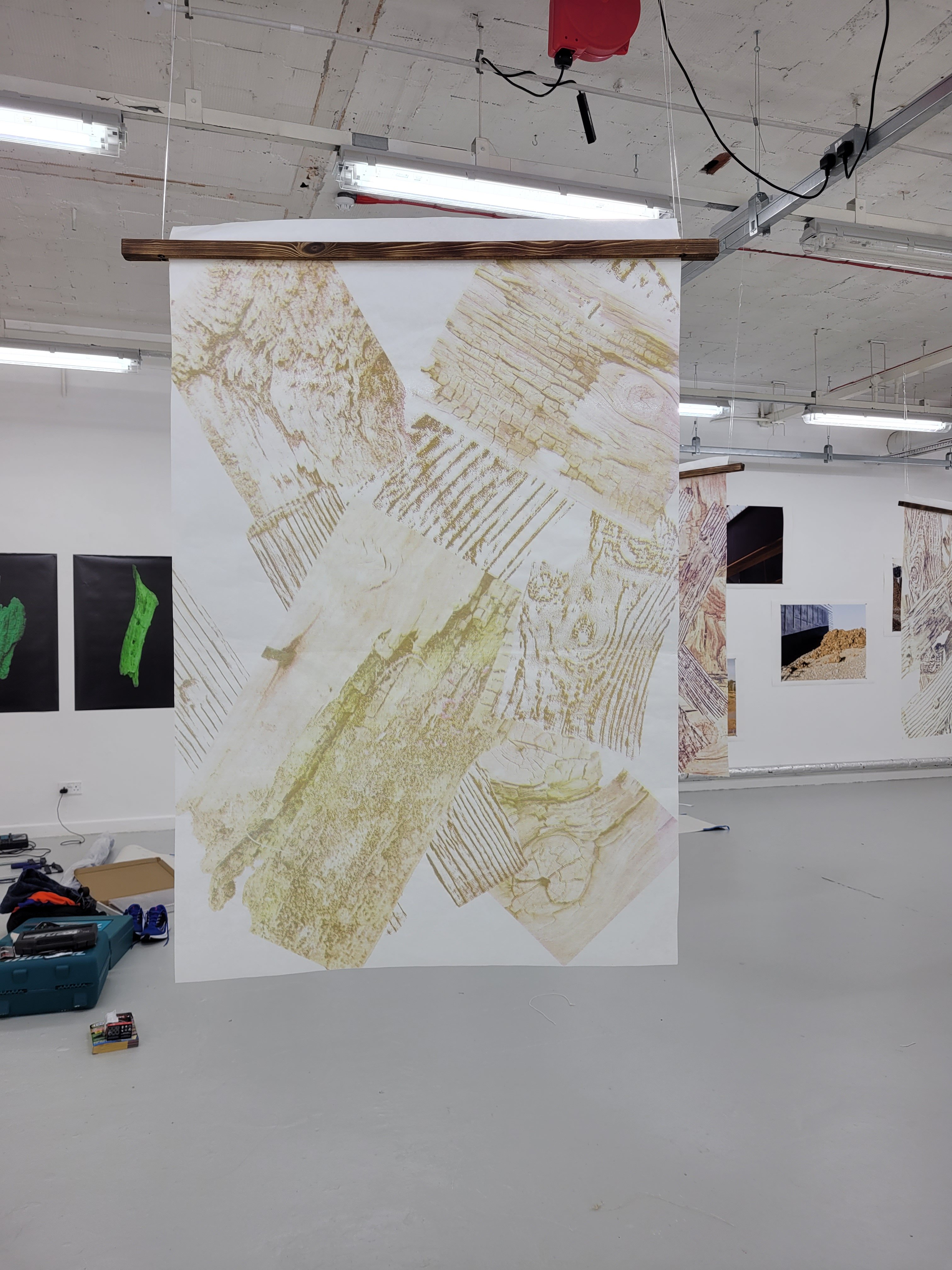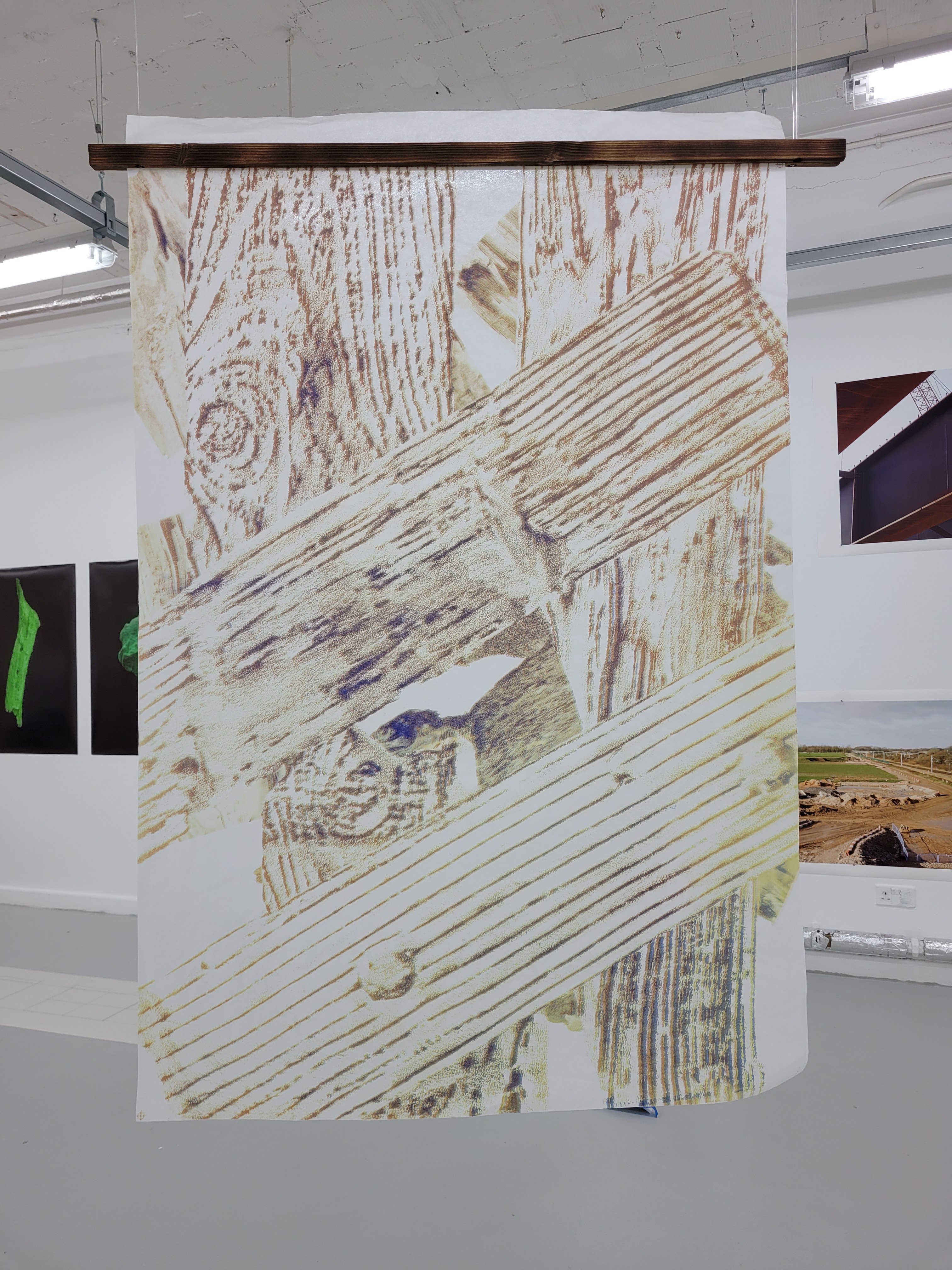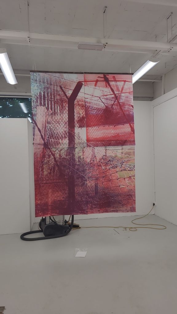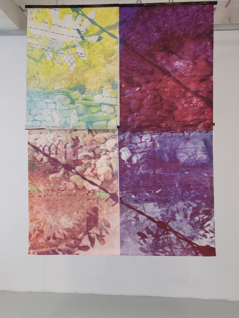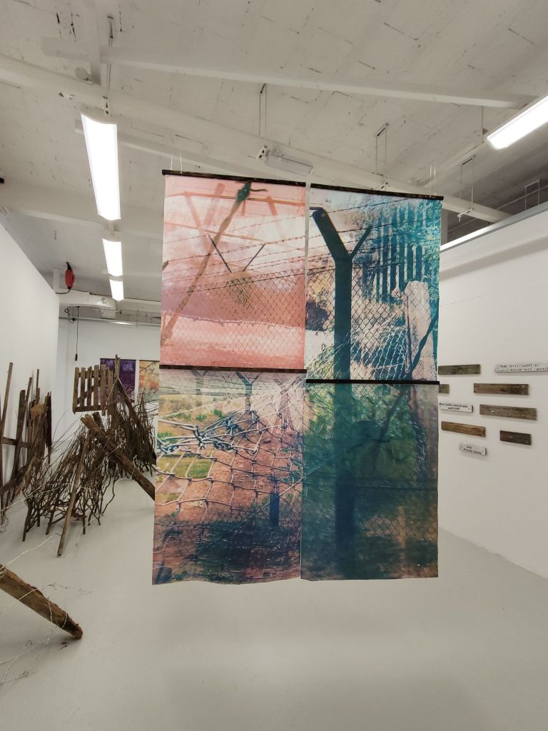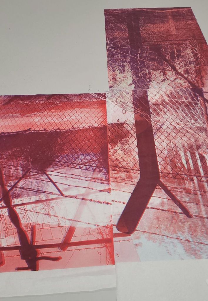 The image is made up of multiple photographs of fences or barriers collaged in procreate to create a new image then printed using four layers with two printed on one side of Kozo 24gm and two on the other making the paper into a print sandwich.