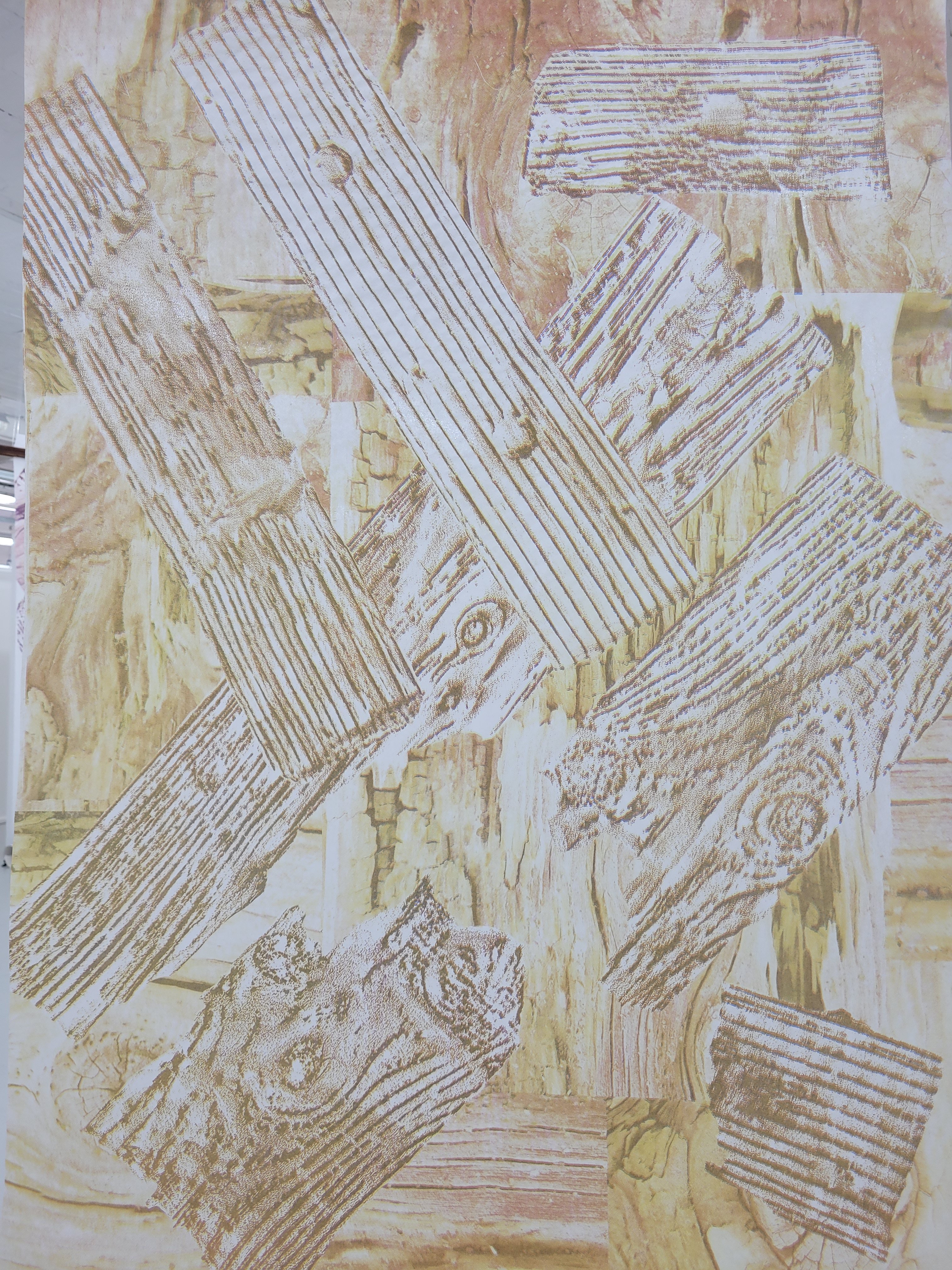 First, day of installation, very warm and sticky in the studio, so hard work. Started by laying out the large images, just as well as we have a duplicate, so we need to do another print. Thankfully, it’s not my error, so the acetates won’t incur an extra charge. Good job it was the first thing we checked.