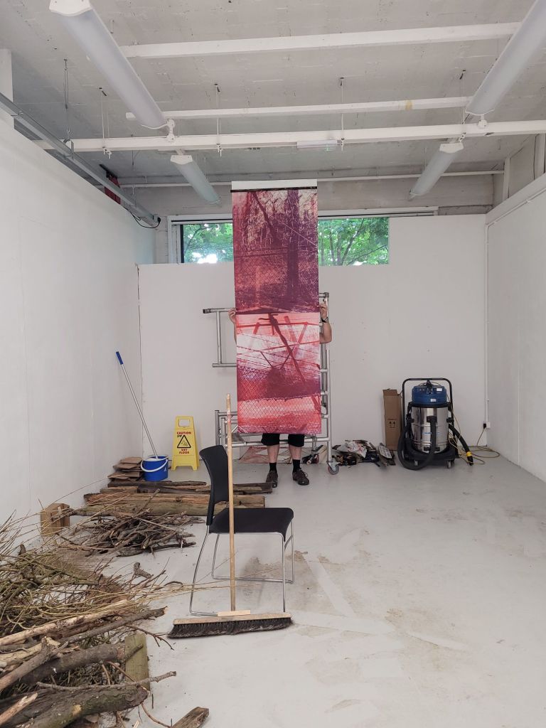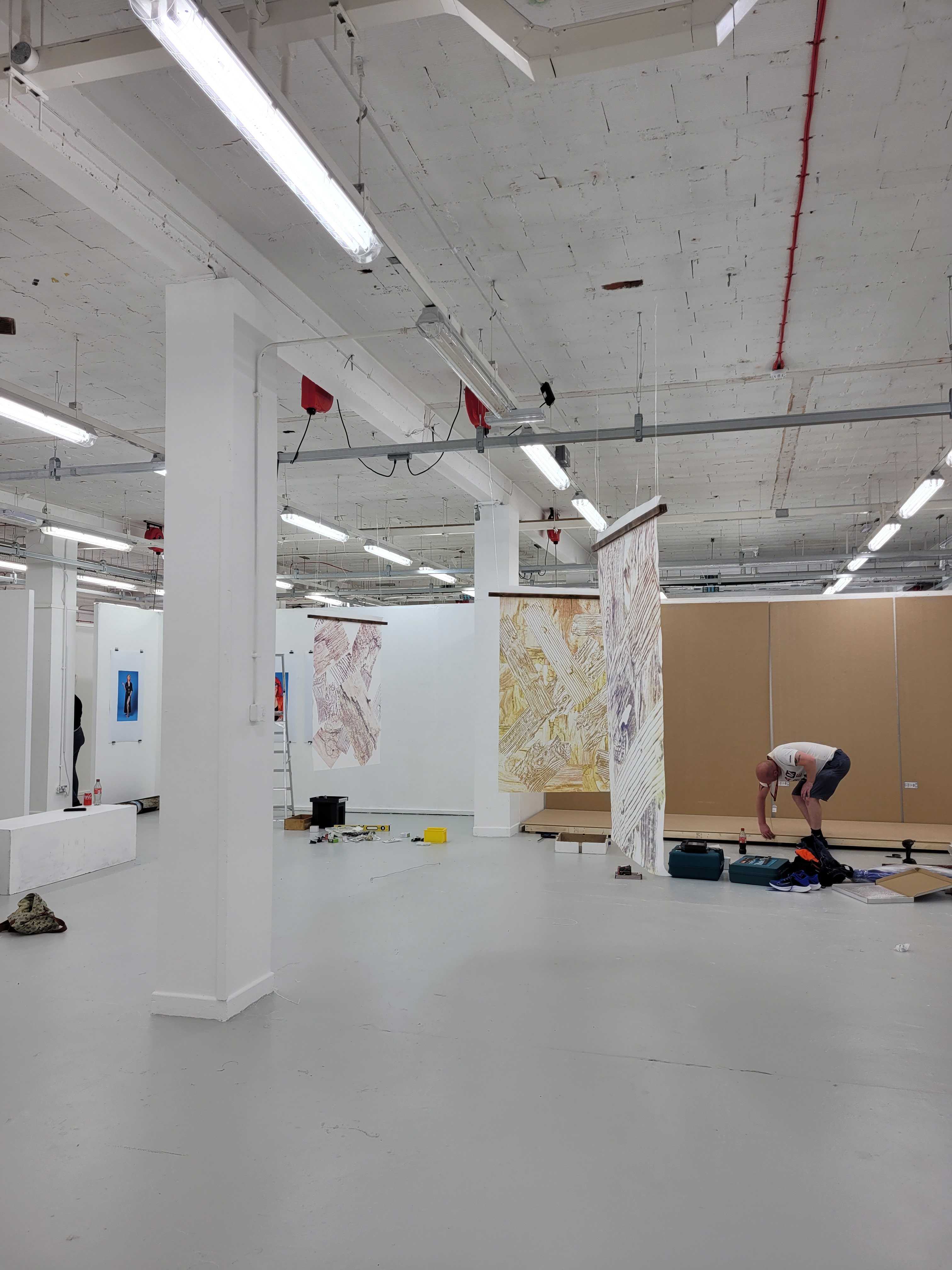 I arrived the next day carrying more prints and brackets to go on the wall but one of the technitions and my tutor had been ‘thinking’ and the hanging was to be moved out of the space and split into four individual hangings. It took four people to get that wall perfect, two tutors a technical support worker, and myself.