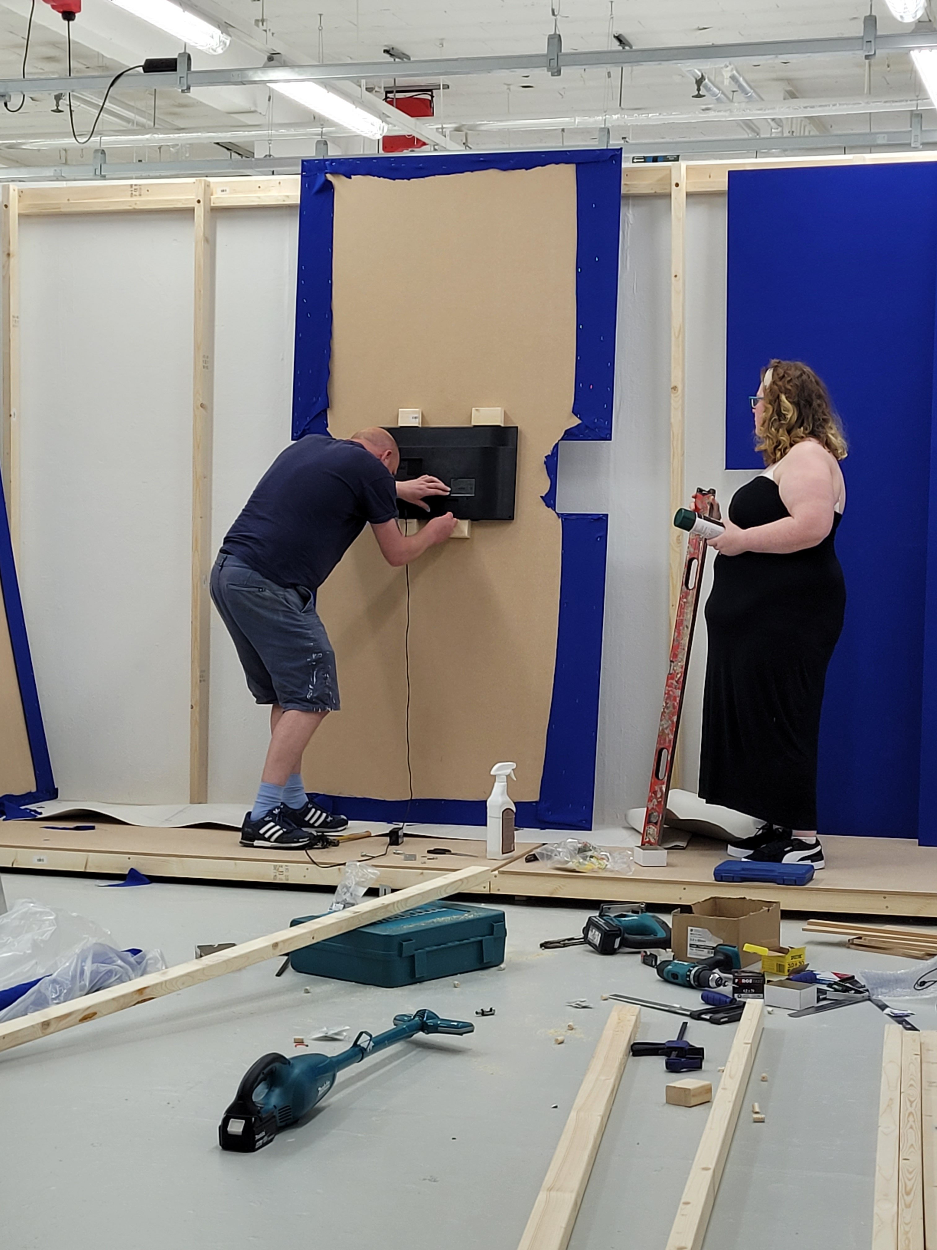 First go round, the problem is the multi colour hanging, it is too far out into the corridor. I said we could put it against the wall but that wasn’t right either so we moved it into the space.