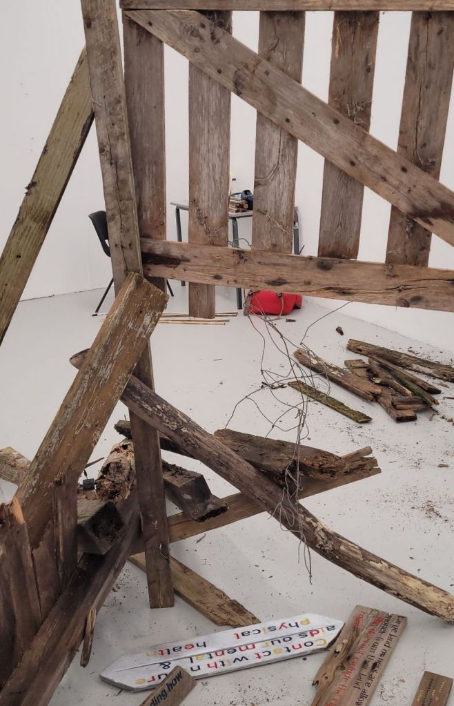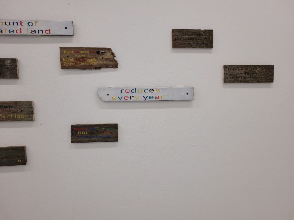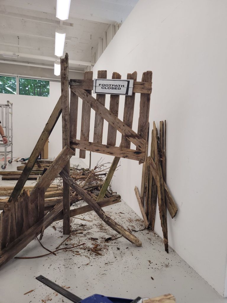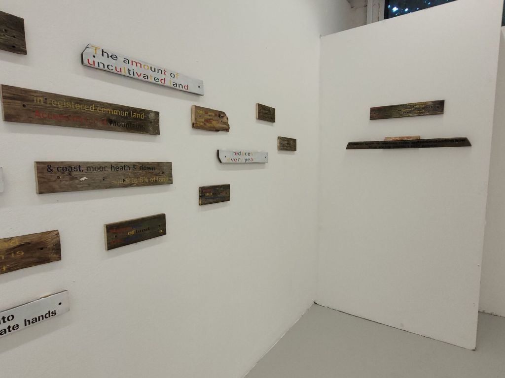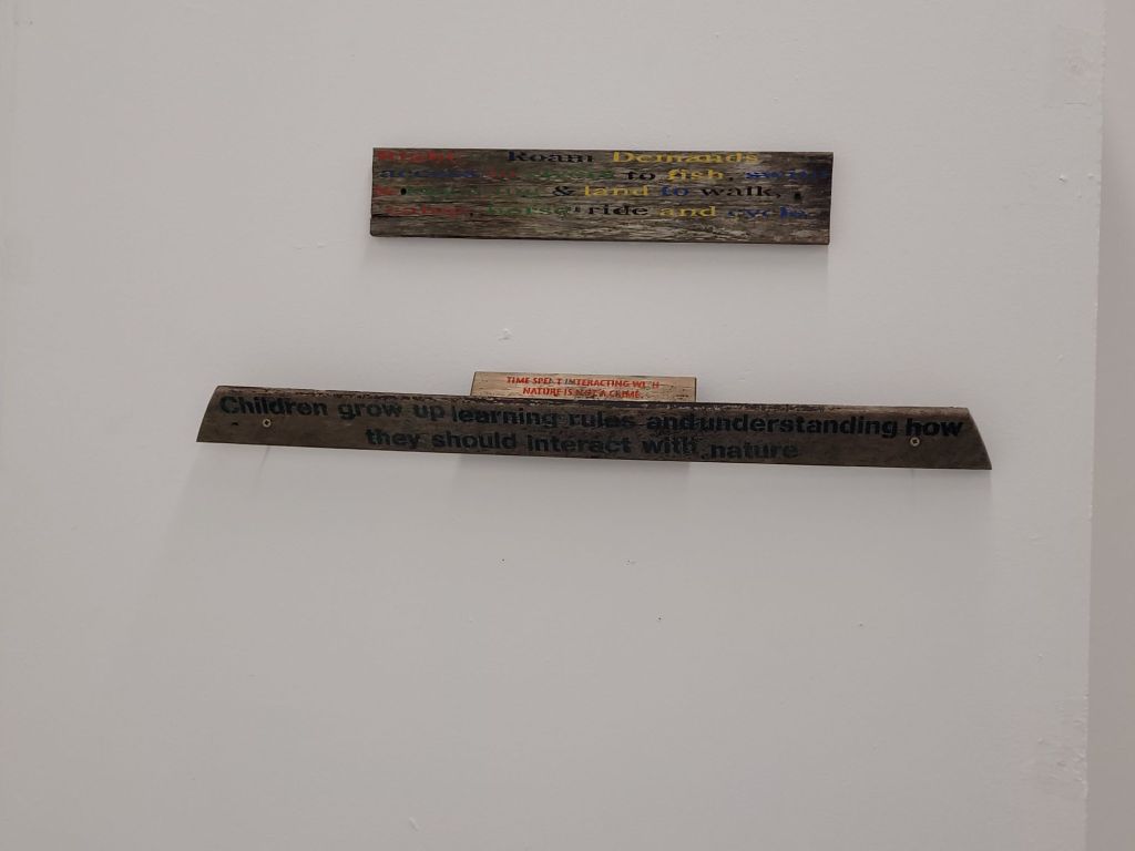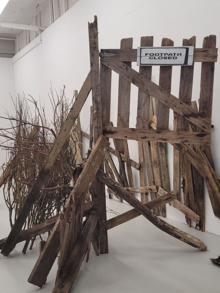 I thought it detracted from the other hanging and I worried about people tripping over the wood as they tried to walk round it. The other problem was it left one wall bare. The suggestion was made that I move some of my signs but they are a narrative and moving some would not work.
