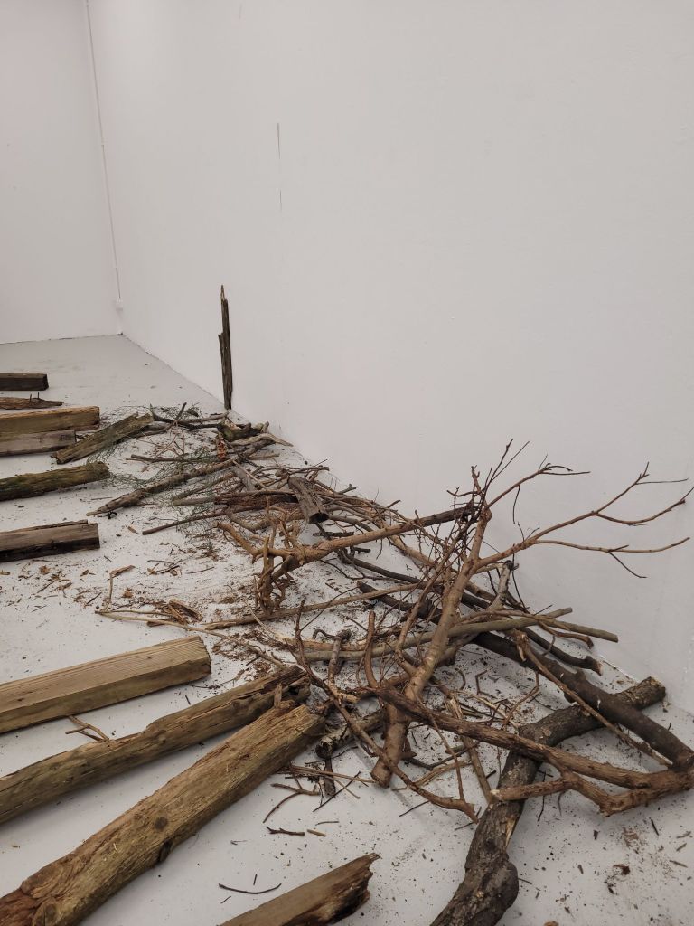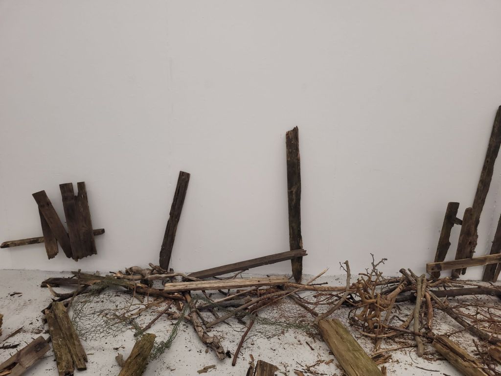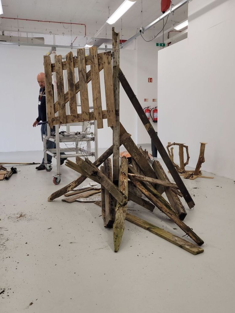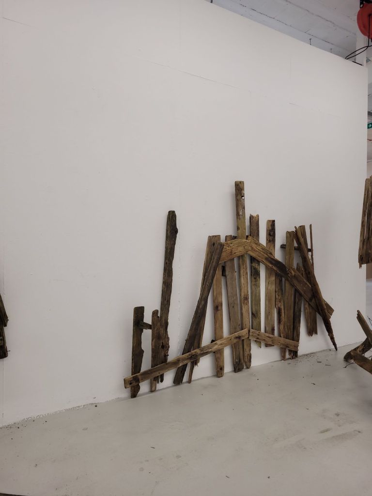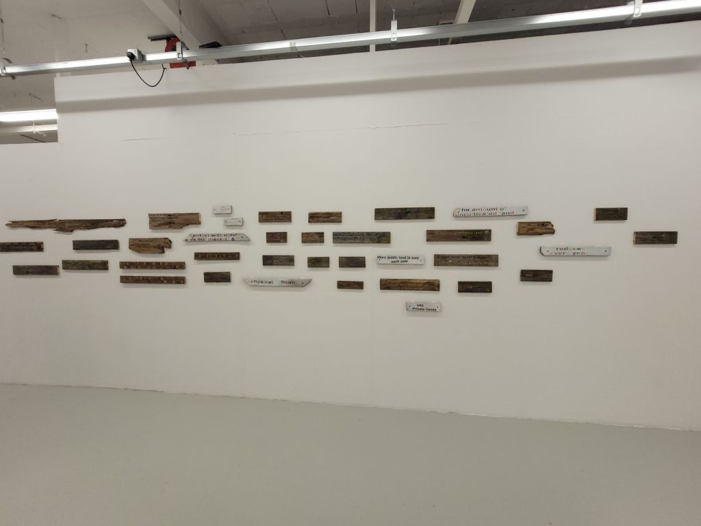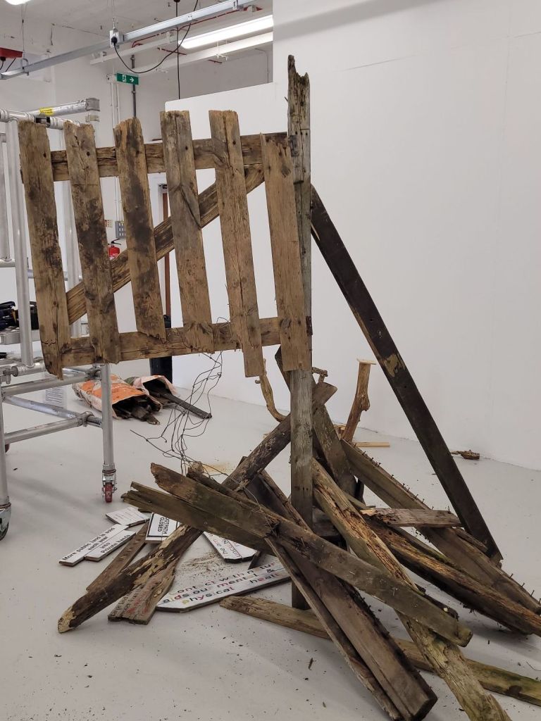 I thought it detracted from the other hanging and I worried about people tripping over the wood as they tried to walk round it. The other problem was it left one wall bare. The suggestion was made that I move some of my signs but they are a narrative and moving some would not work.
