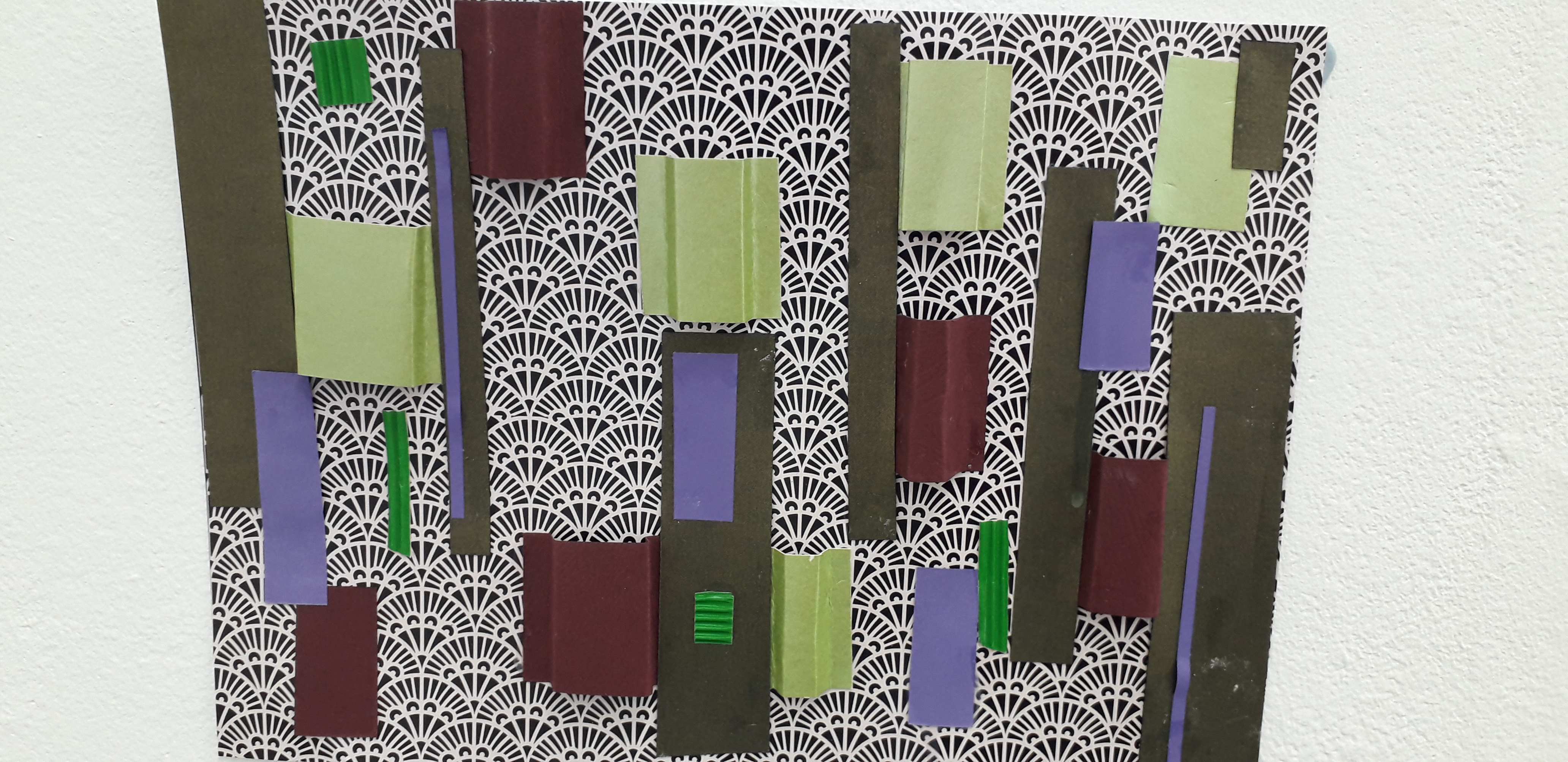 Working out where to put the wallpaper to form my fields the sky template was used as a negative to cut the ground template then pieces of textured wallpaper were ripped to form the fields.