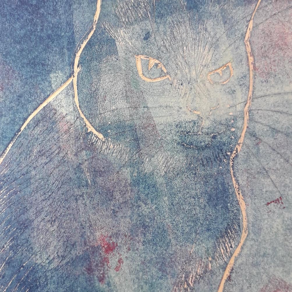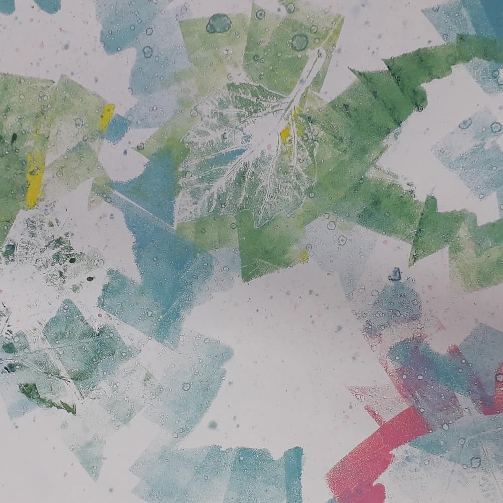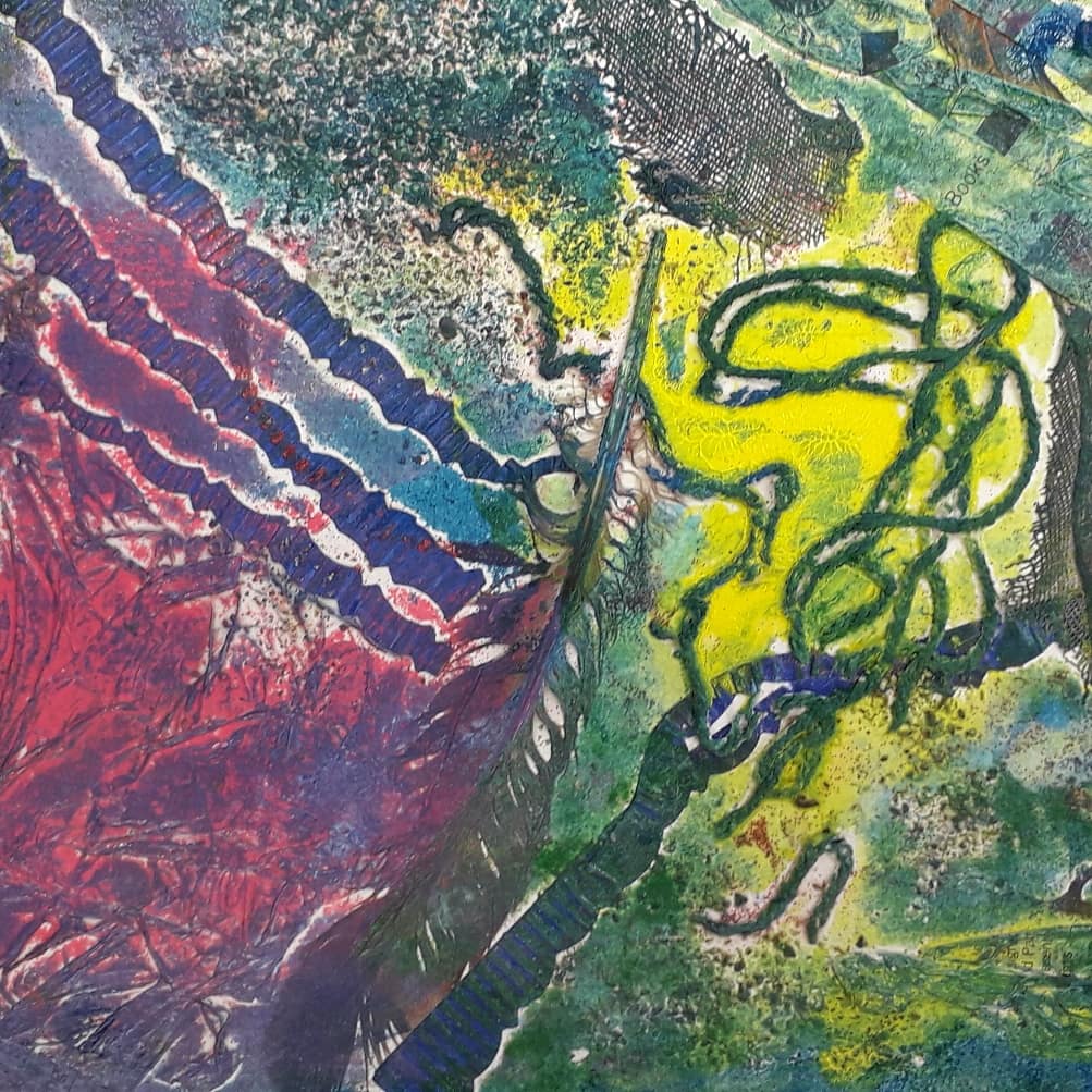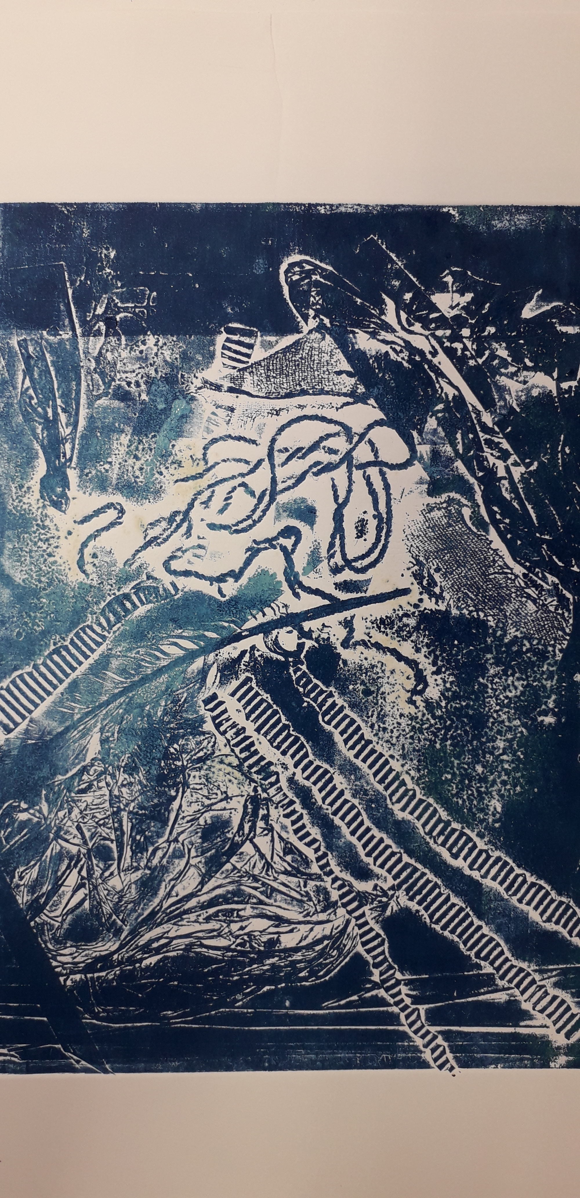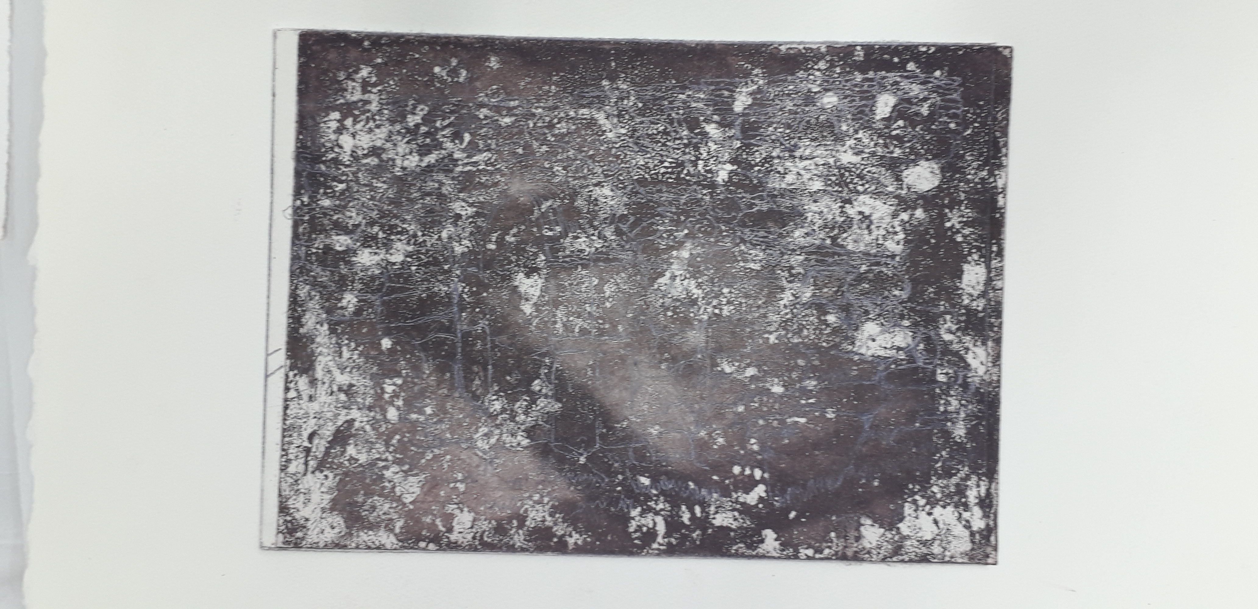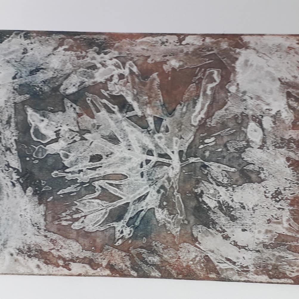 Good day started by removing the scratches with straw hat varnish. Then putting my first hard ground into the etching solution. Whilst that was etching I worked on one of my mono prints.