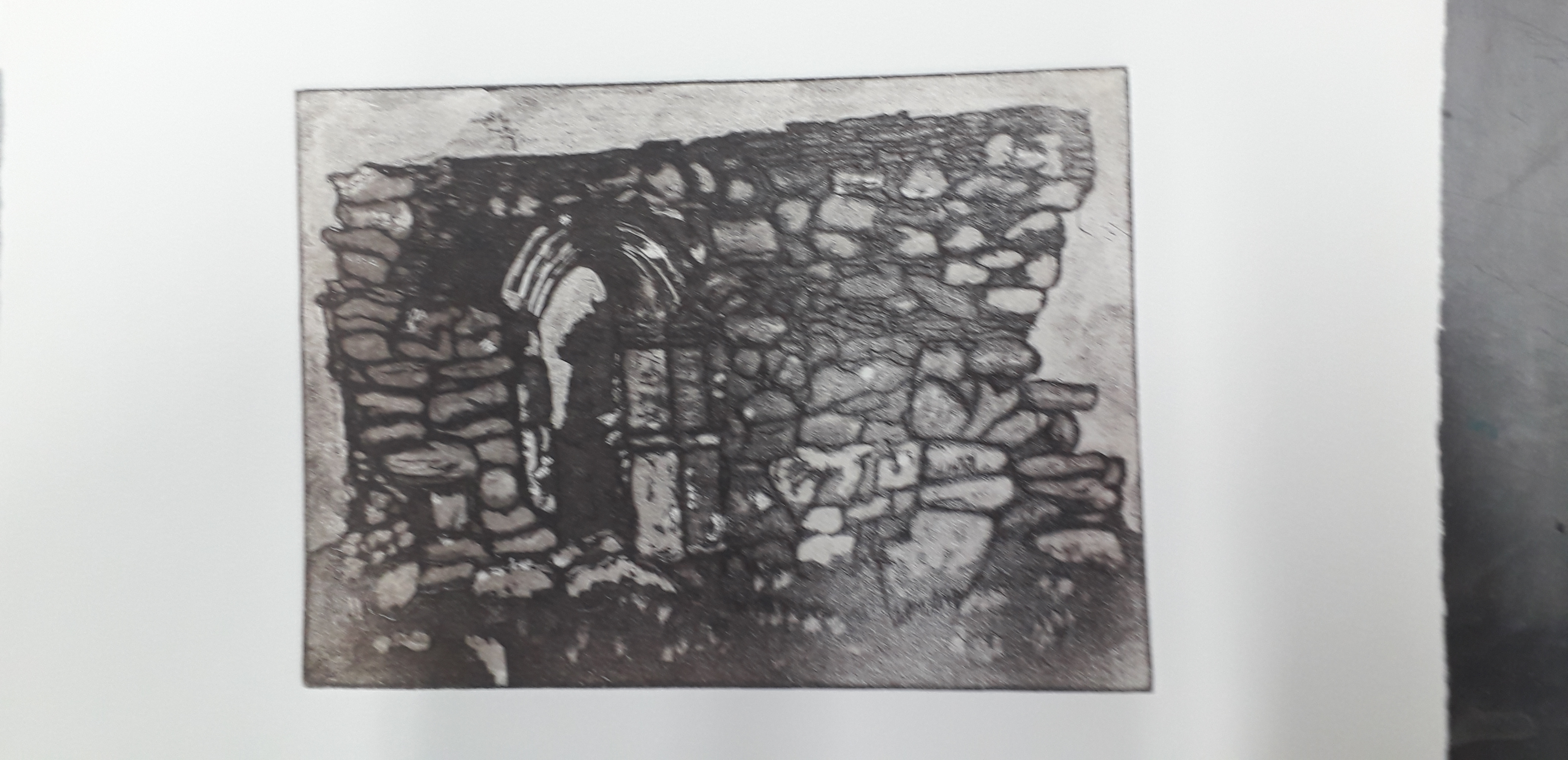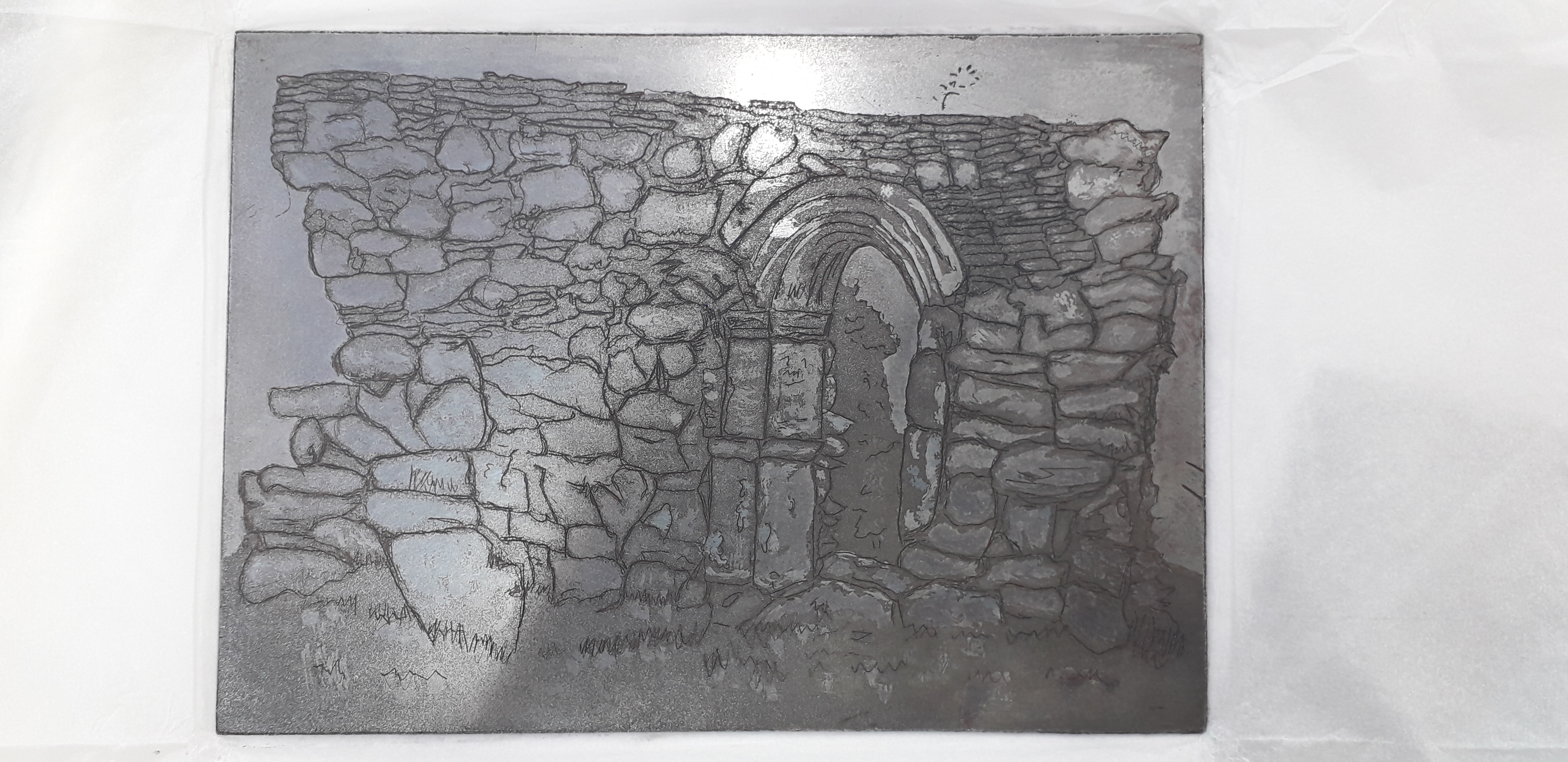 Monday in the print room I decided to make the sky colours lighter and continue with the fabriano. by accident we have descovered a new way of adding the second plate the first plate is removed and the second plate placed on top of the paper then run through the press this indents the plate into the paper making it easier to keep the registration when the plate and paper are turned over and run through the press a second time.