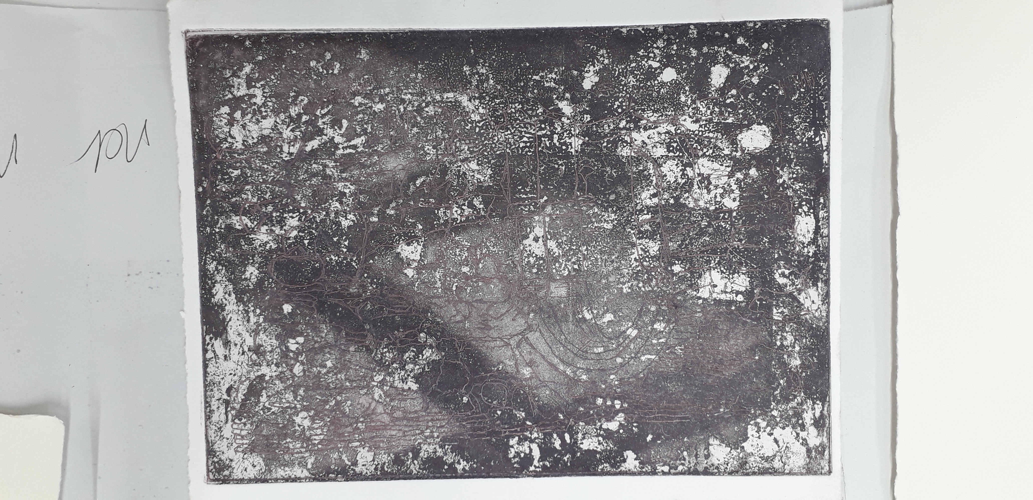 Marks made onto the plate and new print pulled on cartridge paper