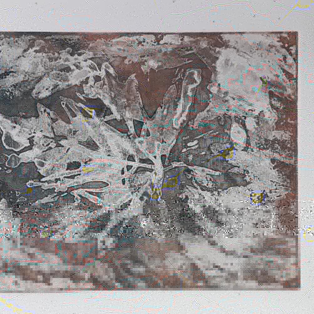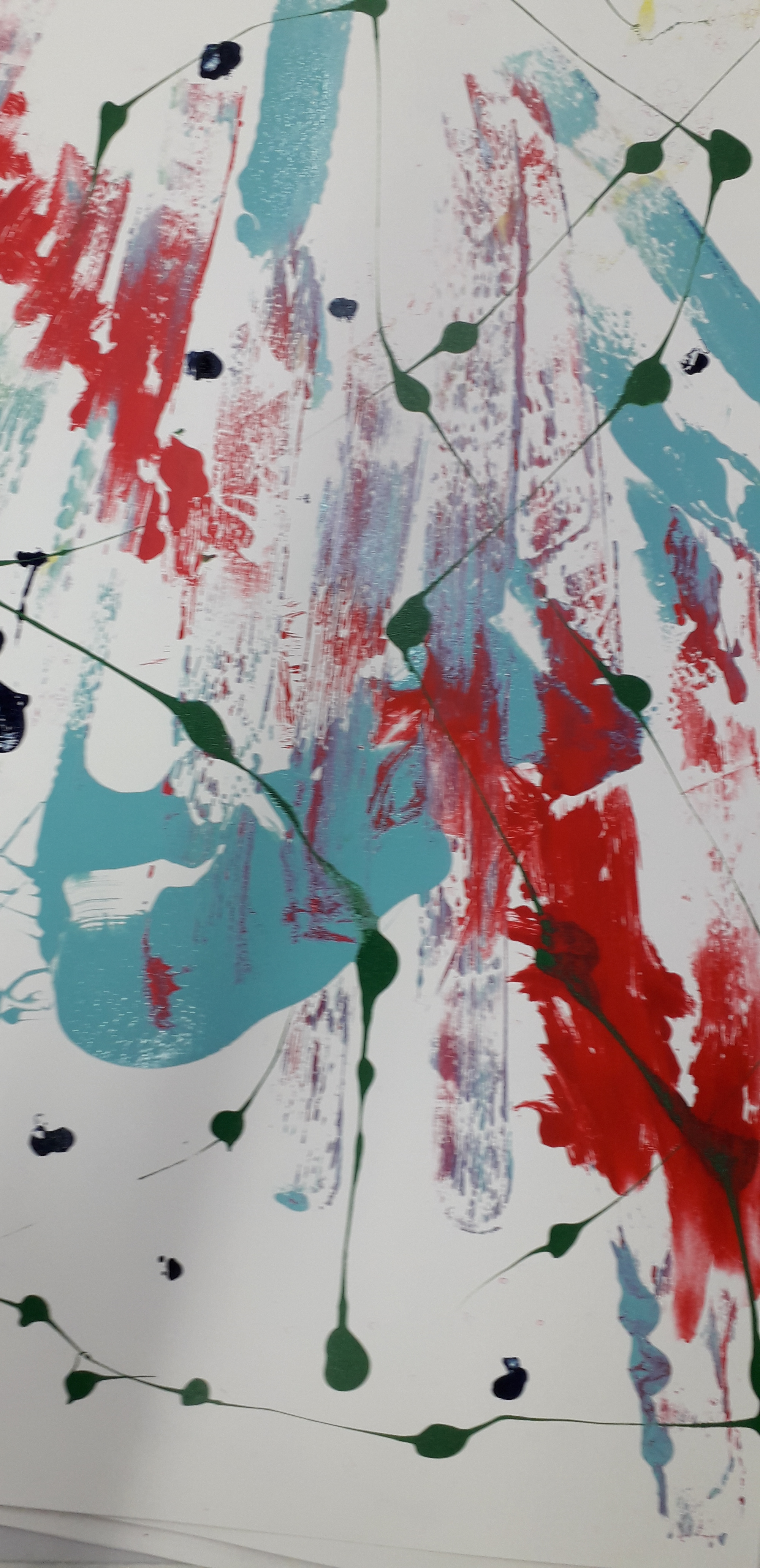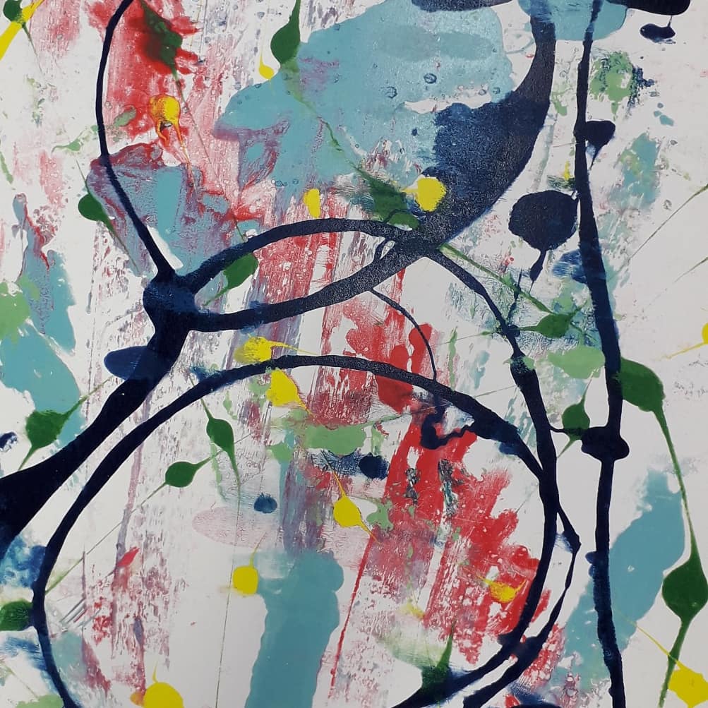 A photograph of a pond taken by the artist has been over painted with oil representing his memories of extreme weather and how it made him feel. It is a large painting which dominates the wall it is displayed on the paint has been added with energy and in different thicknesses only part of the photo shows through.