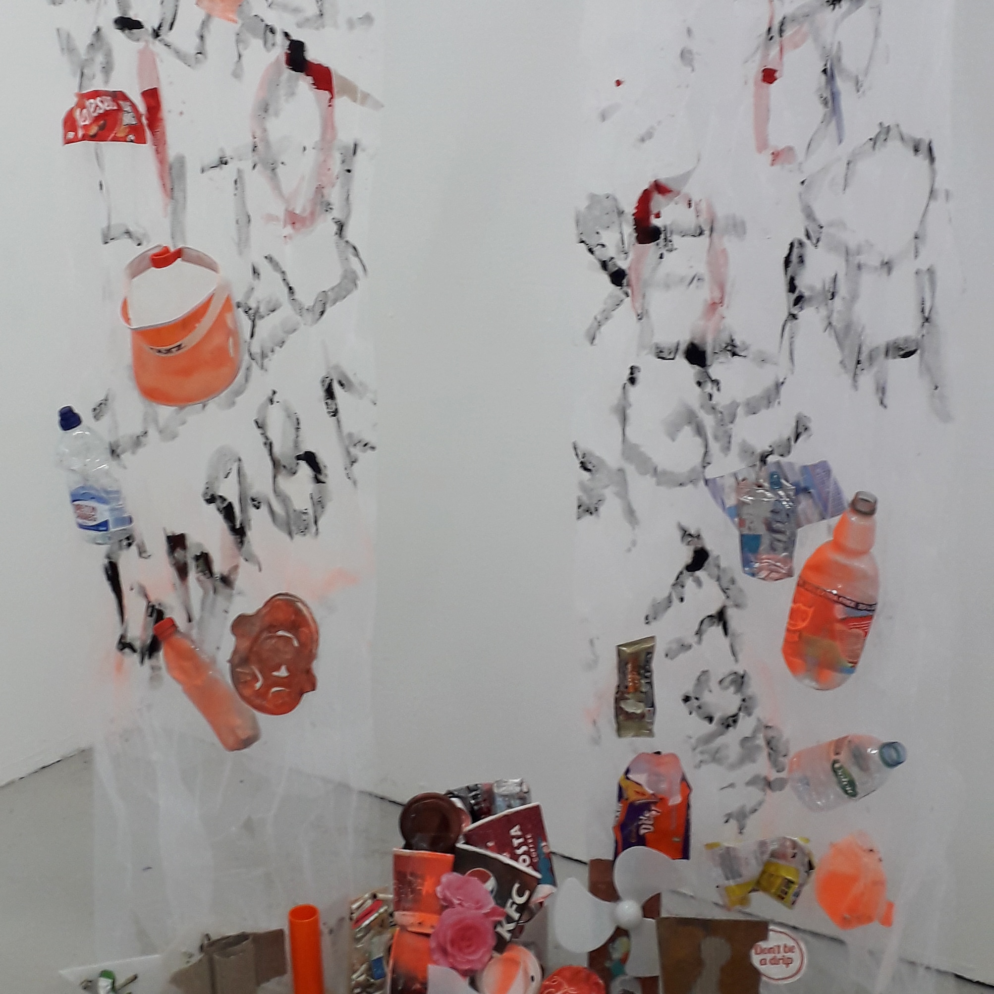 I started by writing a book or two using photos of rubbish taken by me on a short walk. This lead on to me asking my husband to pick up rubbish on his walk to work, poor man!, which I attached to net curtains covered with various words for rubbish.