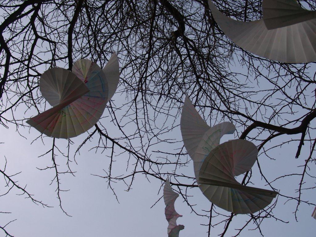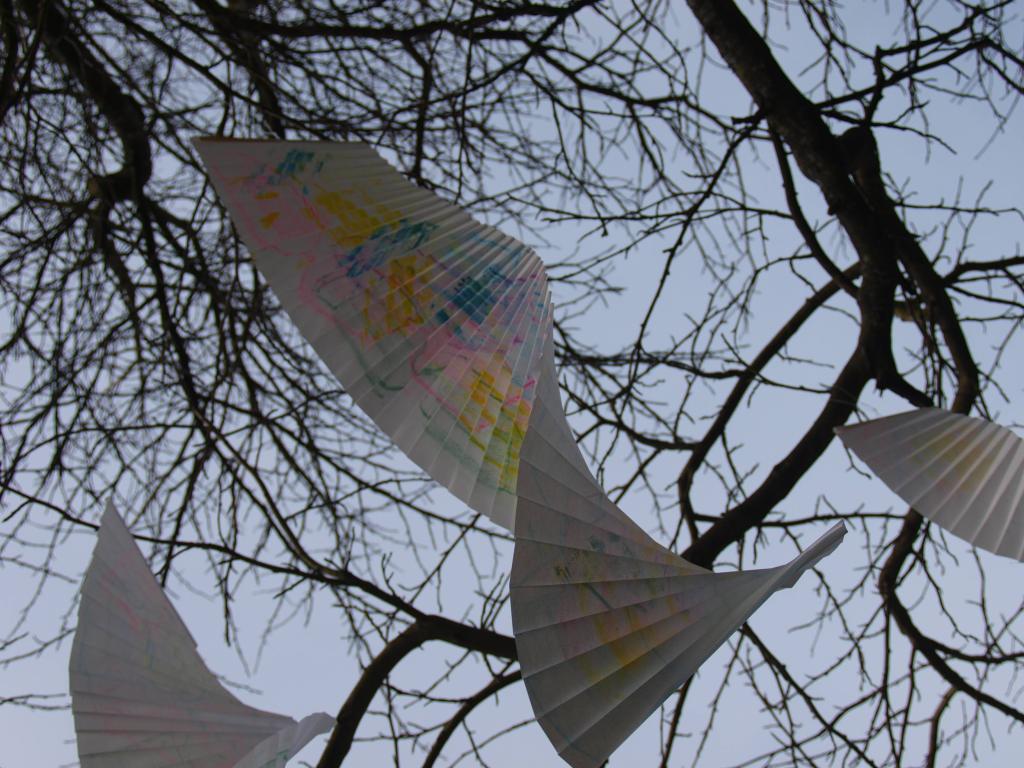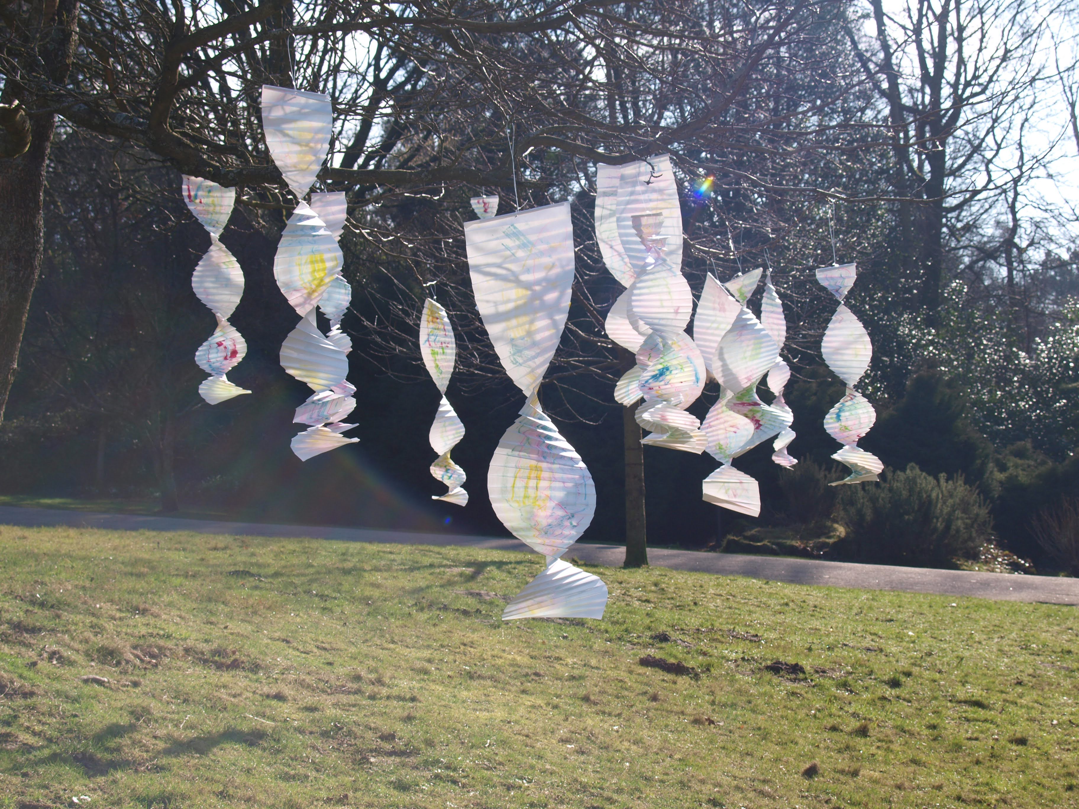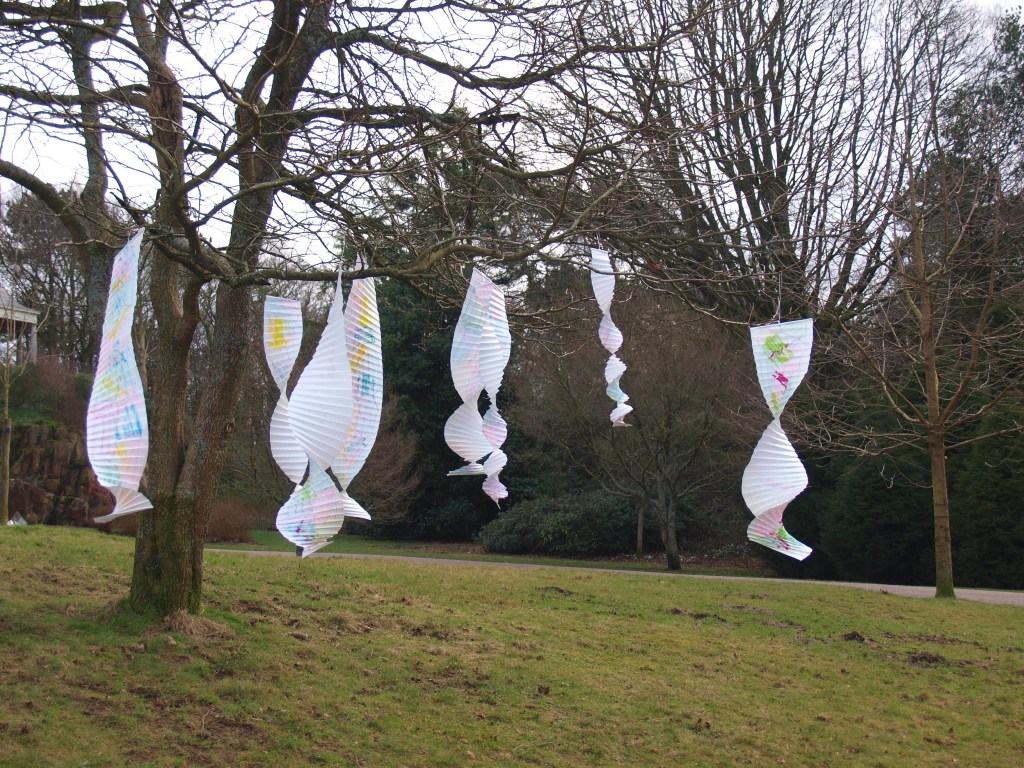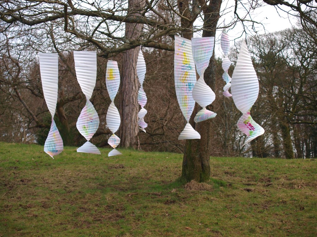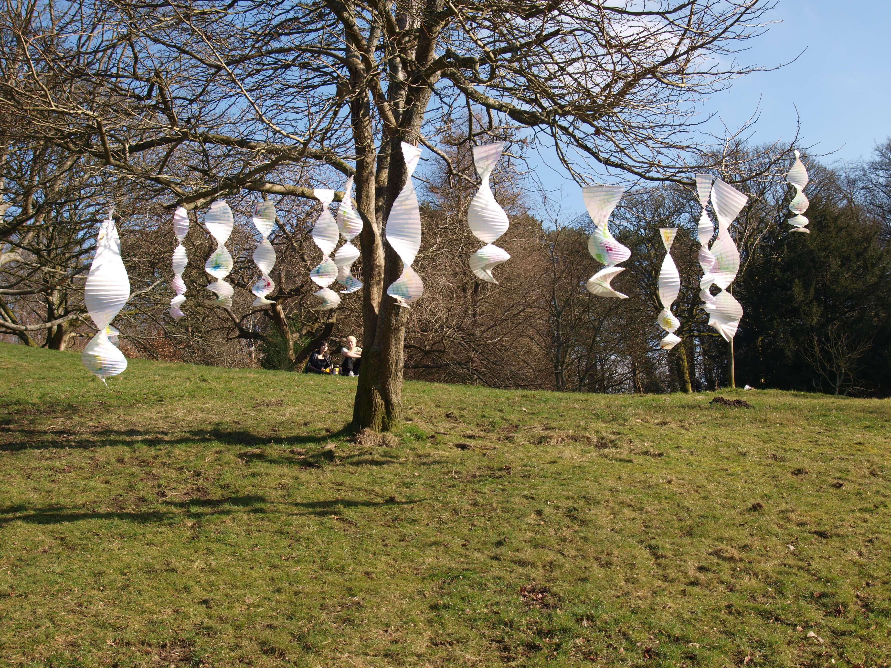 I have been back to the park with yet more of my structures and my boys who act as my helpers (slaves). I think this shows what I was after masks falling from trees. The problem is you can’t see the printing, I think maybe I should have used more of the deeper colours in the print. I may well do another larger one with lots of dark colours.
