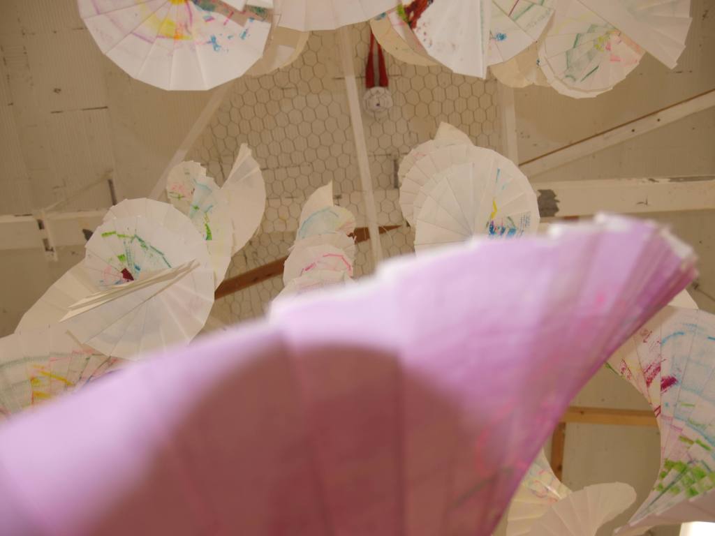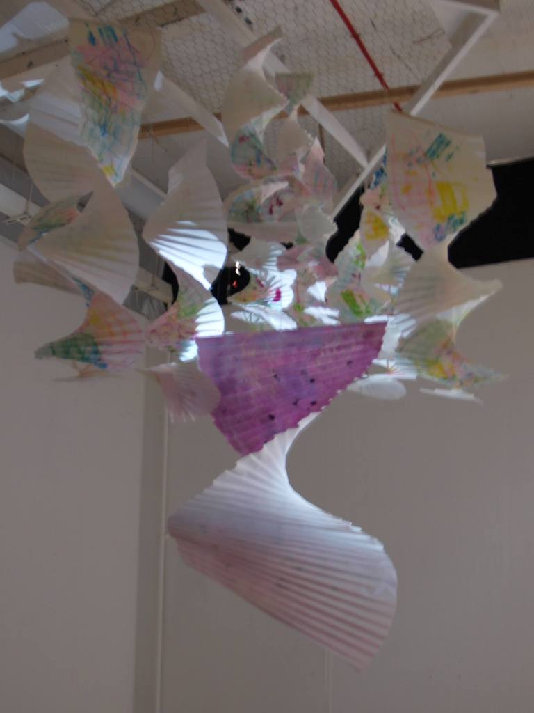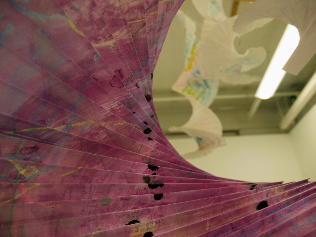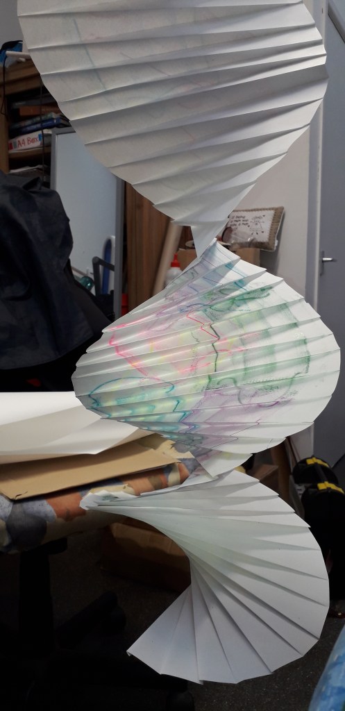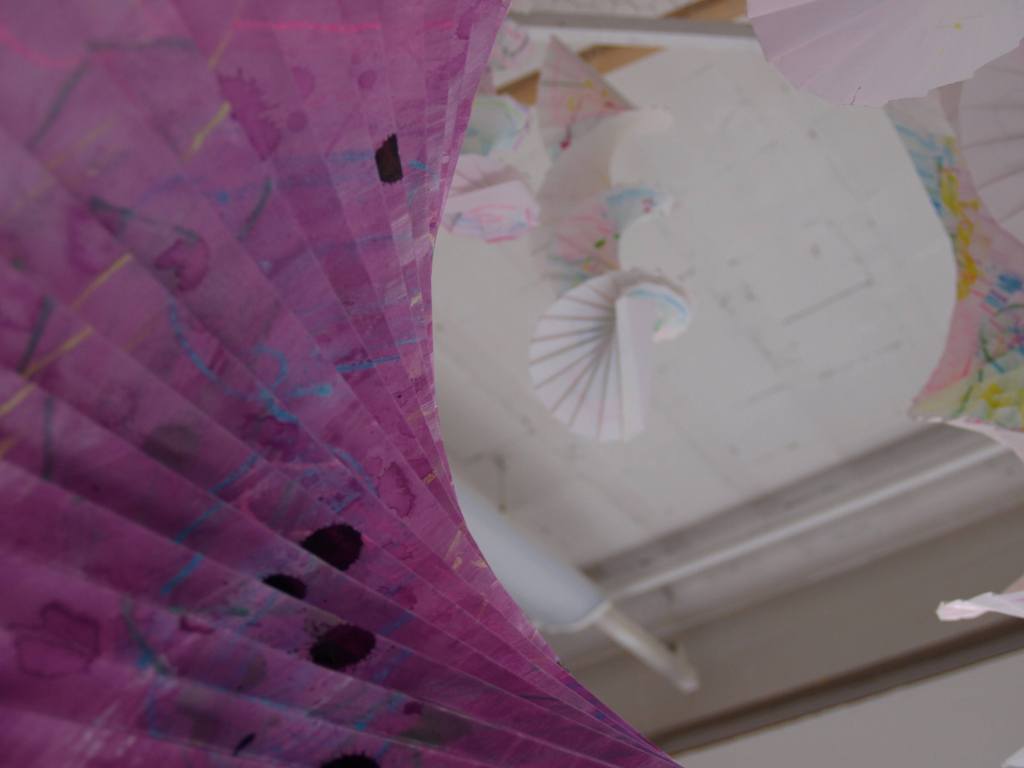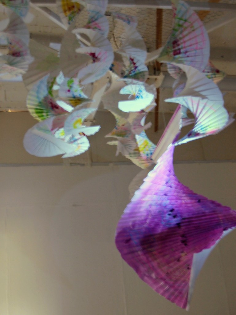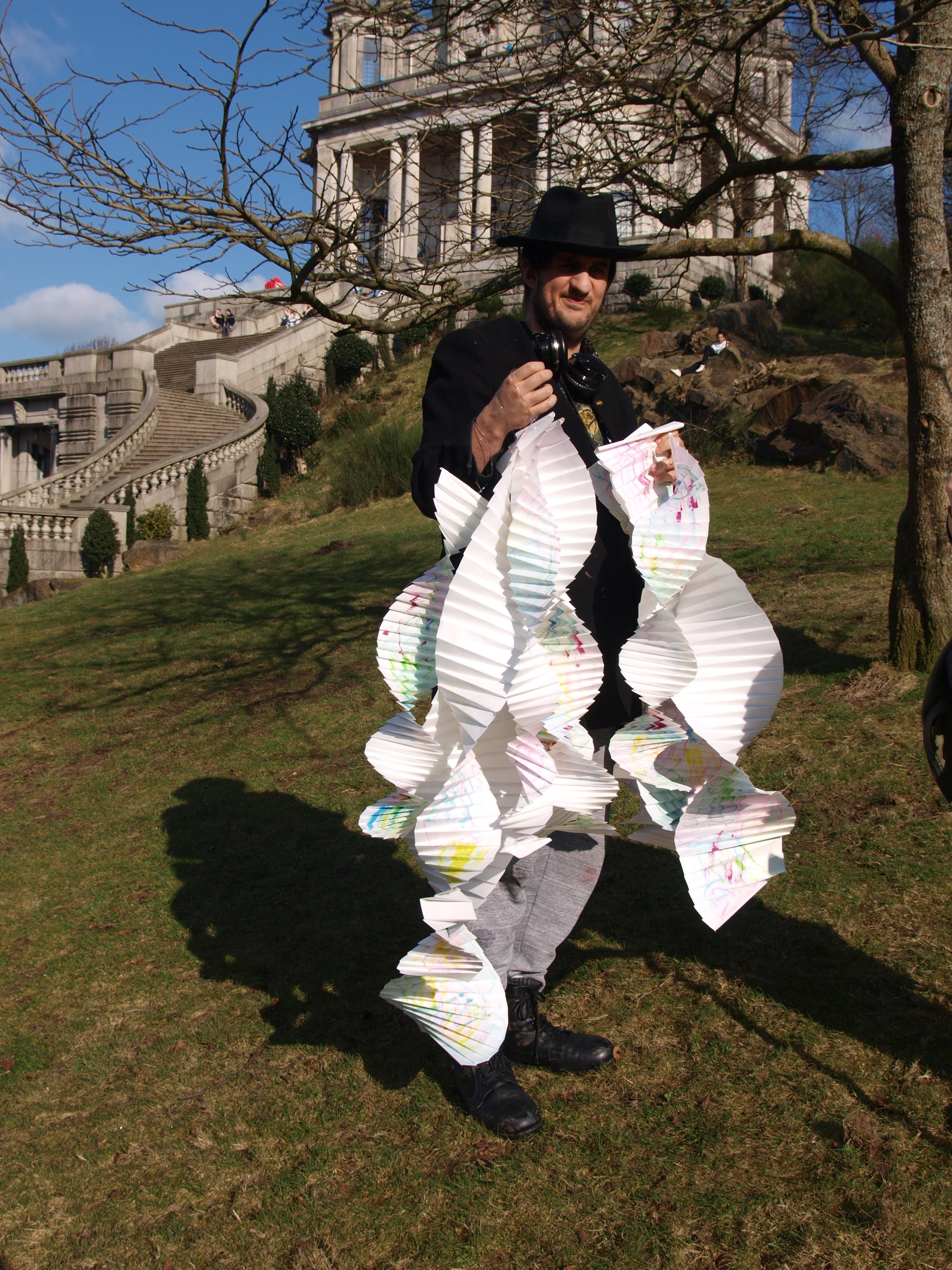 I have been back to the park with yet more of my structures and my boys who act as my helpers (slaves). I think this shows what I was after masks falling from trees. The problem is you can’t see the printing, I think maybe I should have used more of the deeper colours in the print. I may well do another larger one with lots of dark colours.