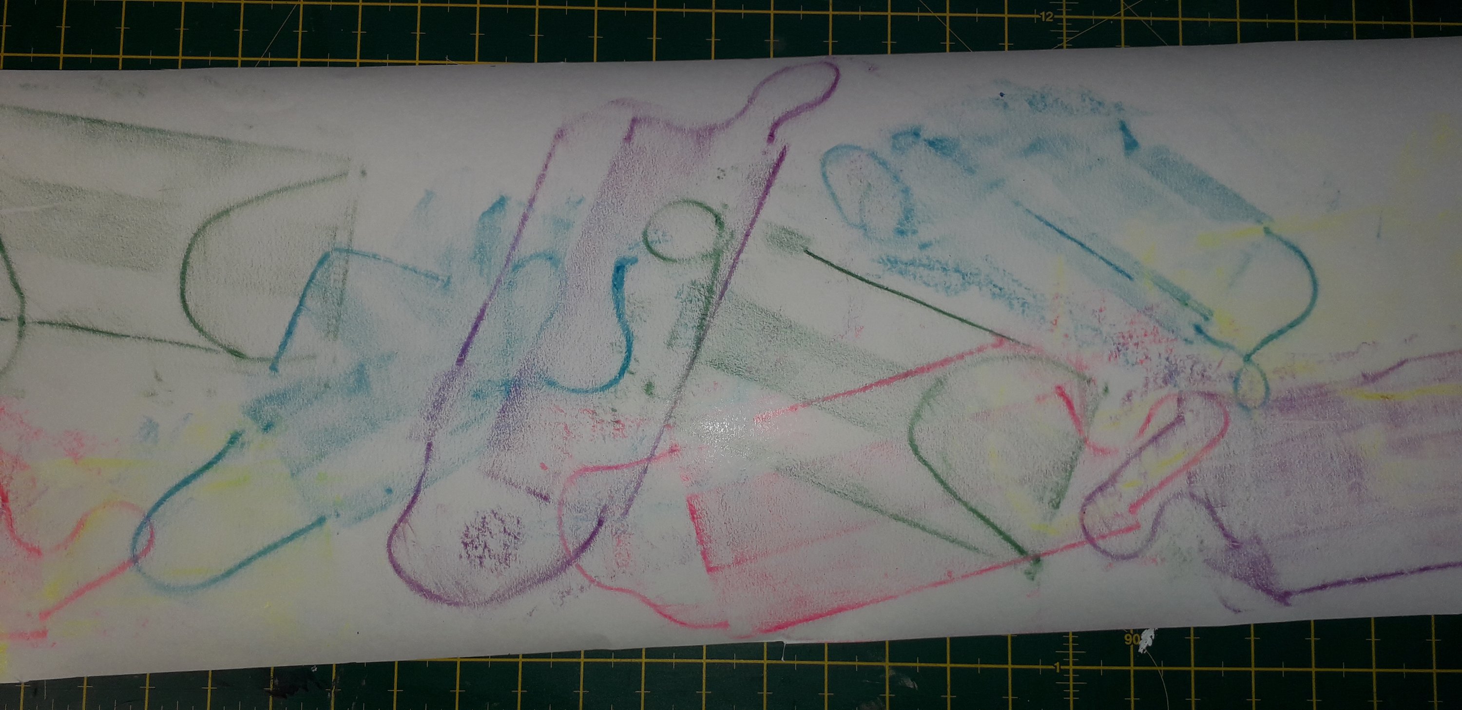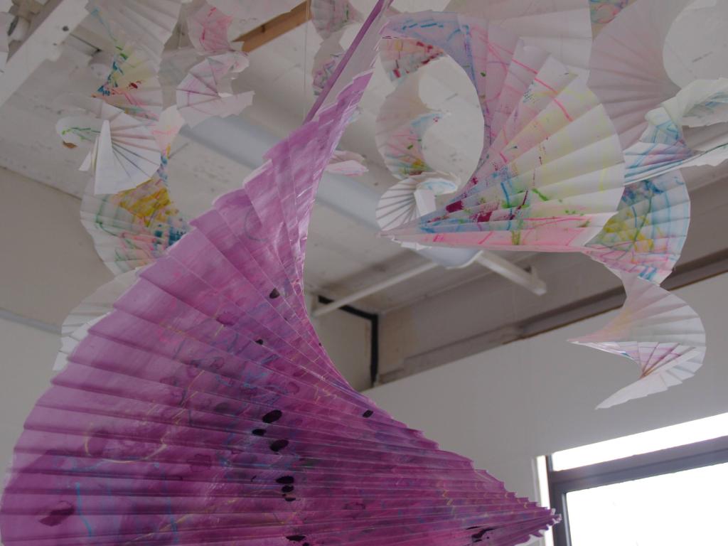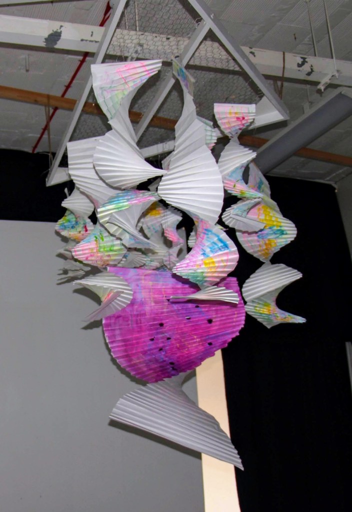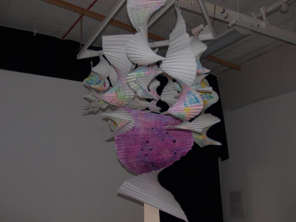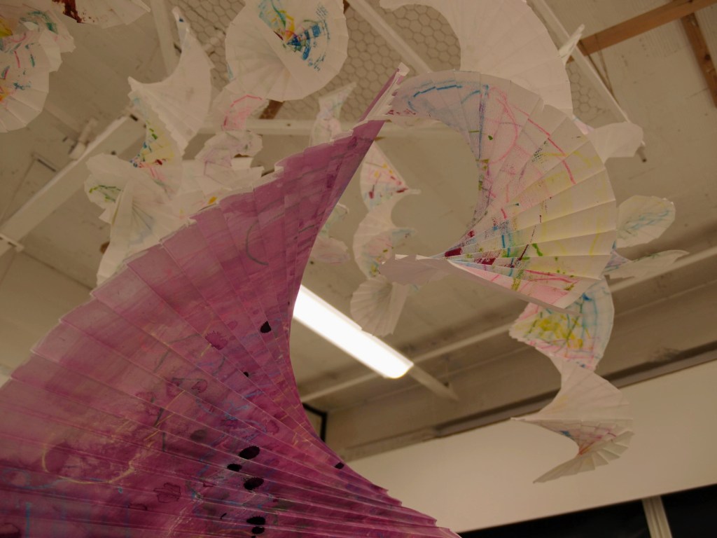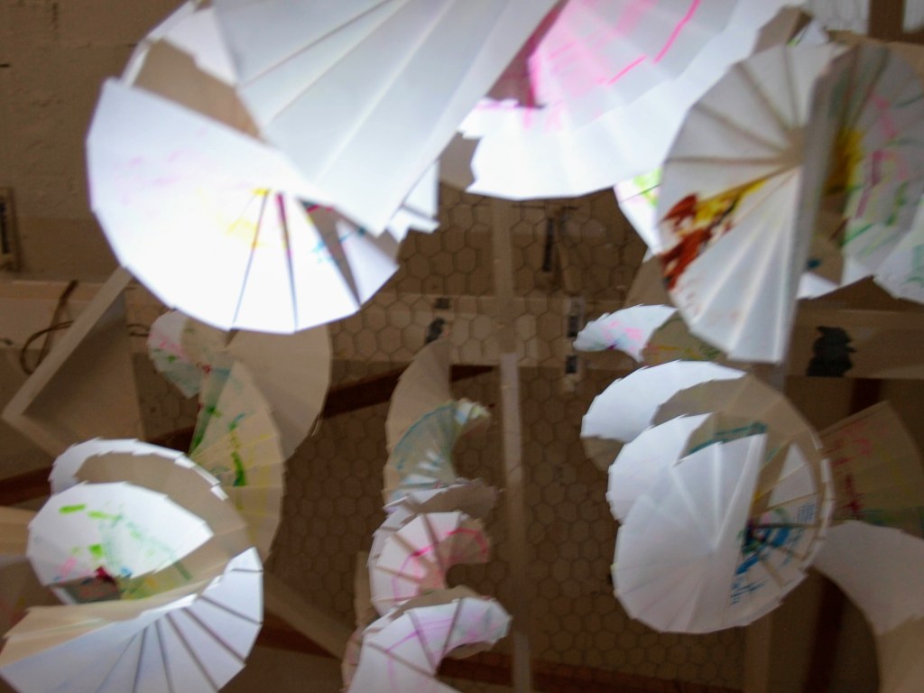 I have been back to the park with yet more of my structures and my boys who act as my helpers (slaves). I think this shows what I was after masks falling from trees. The problem is you can’t see the printing, I think maybe I should have used more of the deeper colours in the print. I may well do another larger one with lots of dark colours.
