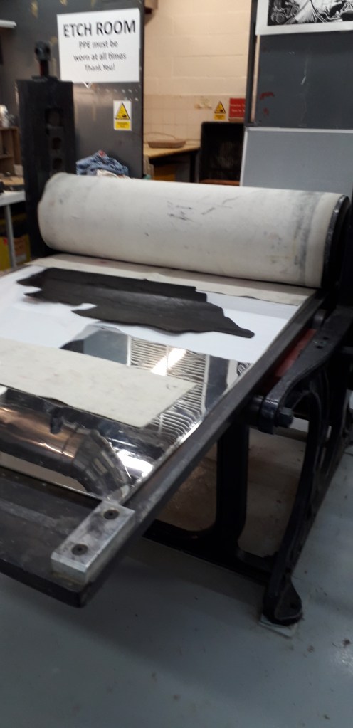 Second print on cartridge paper didn’t work very well not enough tooth to hold the ink but did help with measuring the plates. The size difference removed from the larger plate
