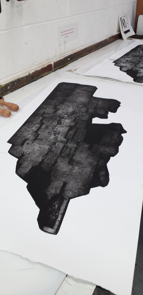 As before I am inspired by mans effect on the planet, this time thinking about colonisation and land enclosure. Using wood from an old fence I frottaged images then laser cut them into wood to use for relief printing. Below are some of my practice prints, starting with free screen print in colour then a relief print over. The paper is newspaper.