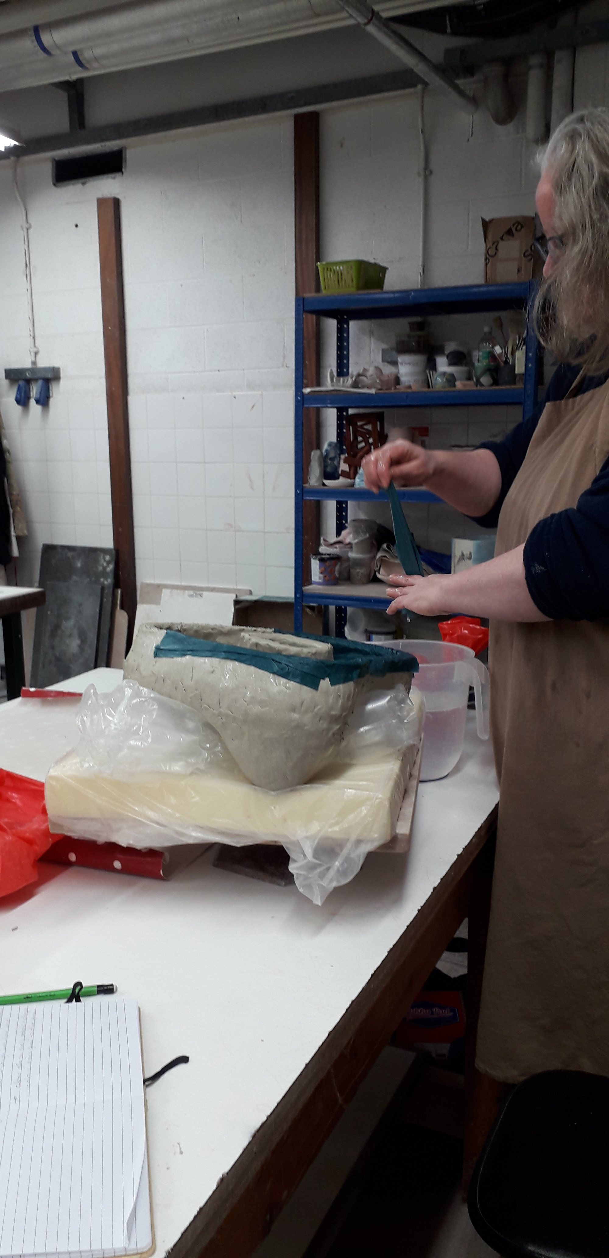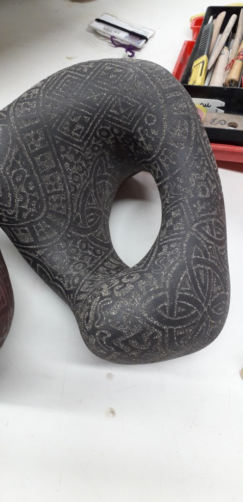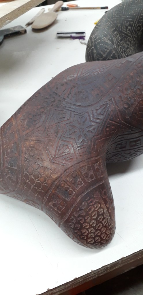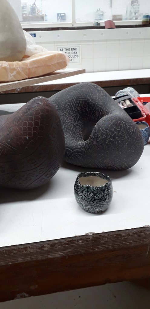 Lovely morning watching Micaela Schoop create one of her art pieces. It is all about communication it is very tactile. Her finished pieces and heavily decorated with patterns the patterns are carefully chosen to communicate the meaning of the piece using braille, binary code symbols and traditional design from lots of different cultures. The body grows quickly with the clay impart dictating the final shape. But the patterns on the surface are carefully added taking many hours. All are hand drawn initially some are then etched.