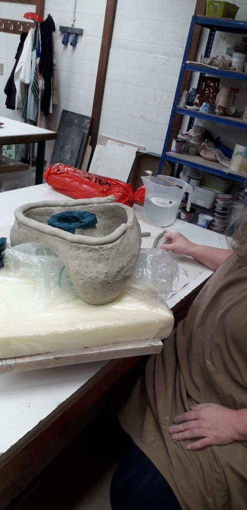 Thursday collected some clay from the workshop I decided to do some practice bowls clay is quite dry and firm making it difficult to manipulate easily. I tried making small slabs and pressing my lino cut into them they are interesting but I could do with putting them through the slab press. I think it will work. I made a coiled pot the lino doesn’t press into that at all so I’ve just decorated it with my leaf patterns. It looks ok. I will let it dry and sand off the rough bits next week. Have to leave early for another Drs appointment. My BP is still high apparently they don’t do the 24 hour reading any more I have to call into reception whenever I get the chance and take it with the machine. Does that reduce stress?? Bloods also taken.