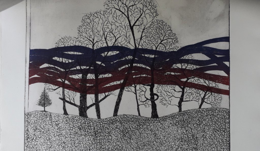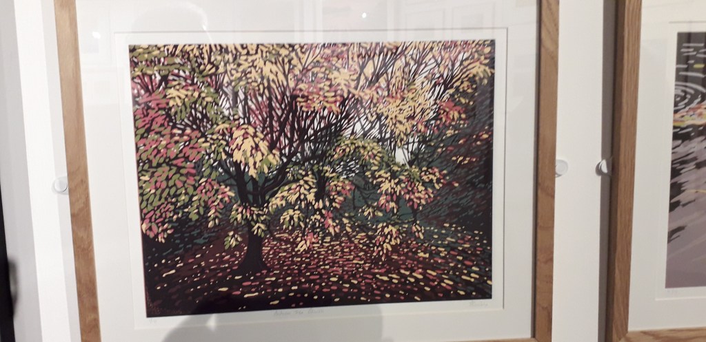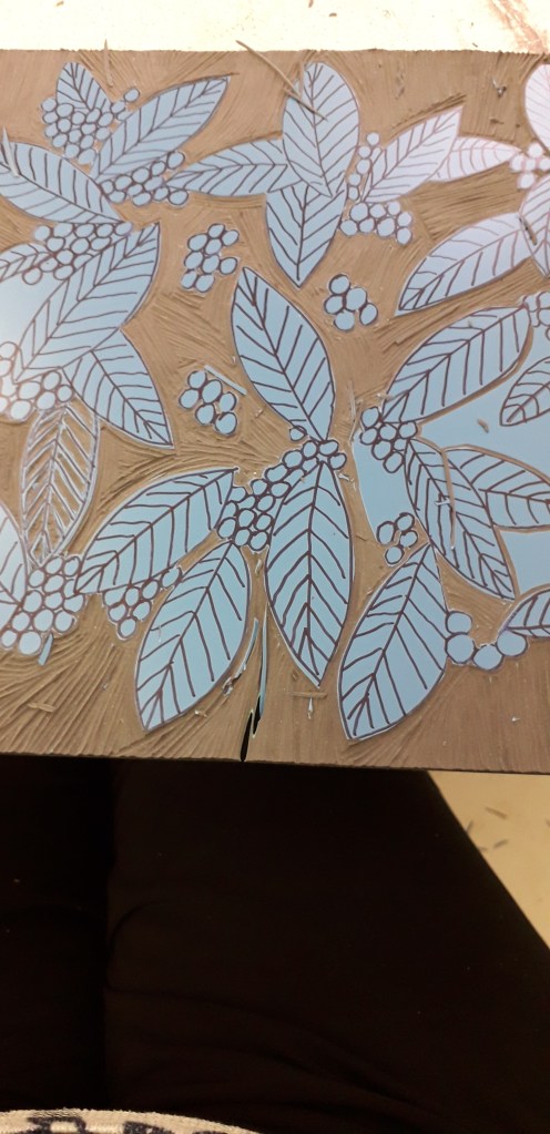 The seal on our kitchen window has broken and patterns are forming between the panes I’ve drawn a picture using some of them and cut them into lino. I’m relatively new to lino printing so doing 3 layers was interesting. I do like the final images though and it has excited me, so expect more.