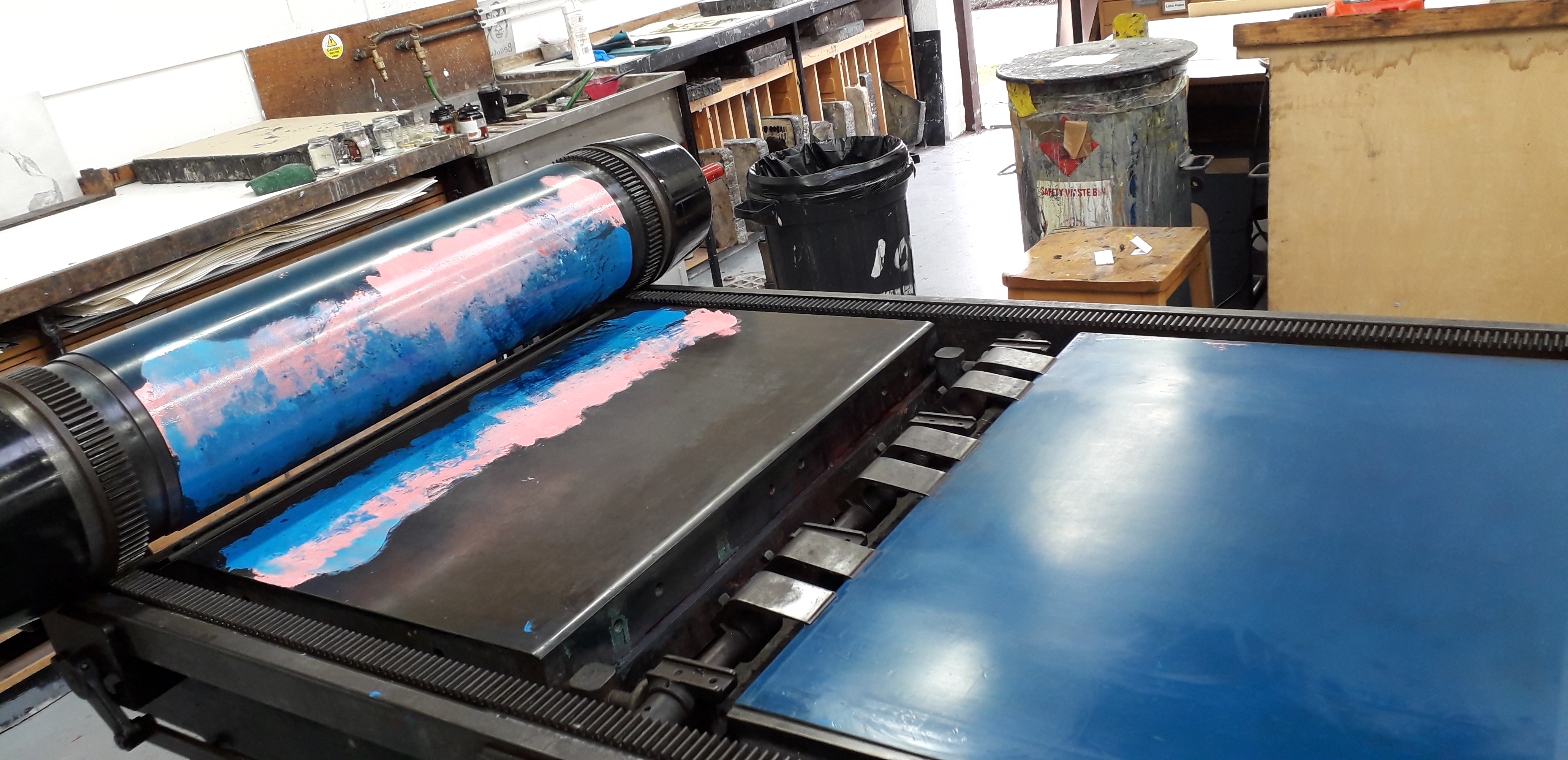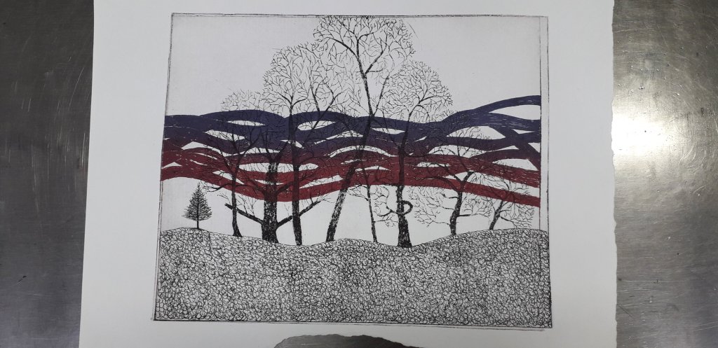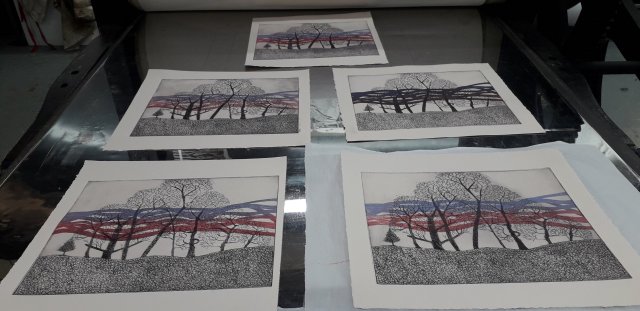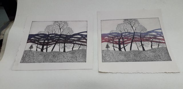 Monday in the print room I decided to make the sky colours lighter and continue with the fabriano. by accident we have descovered a new way of adding the second plate the first plate is removed and the second plate placed on top of the paper then run through the press this indents the plate into the paper making it easier to keep the registration when the plate and paper are turned over and run through the press a second time.