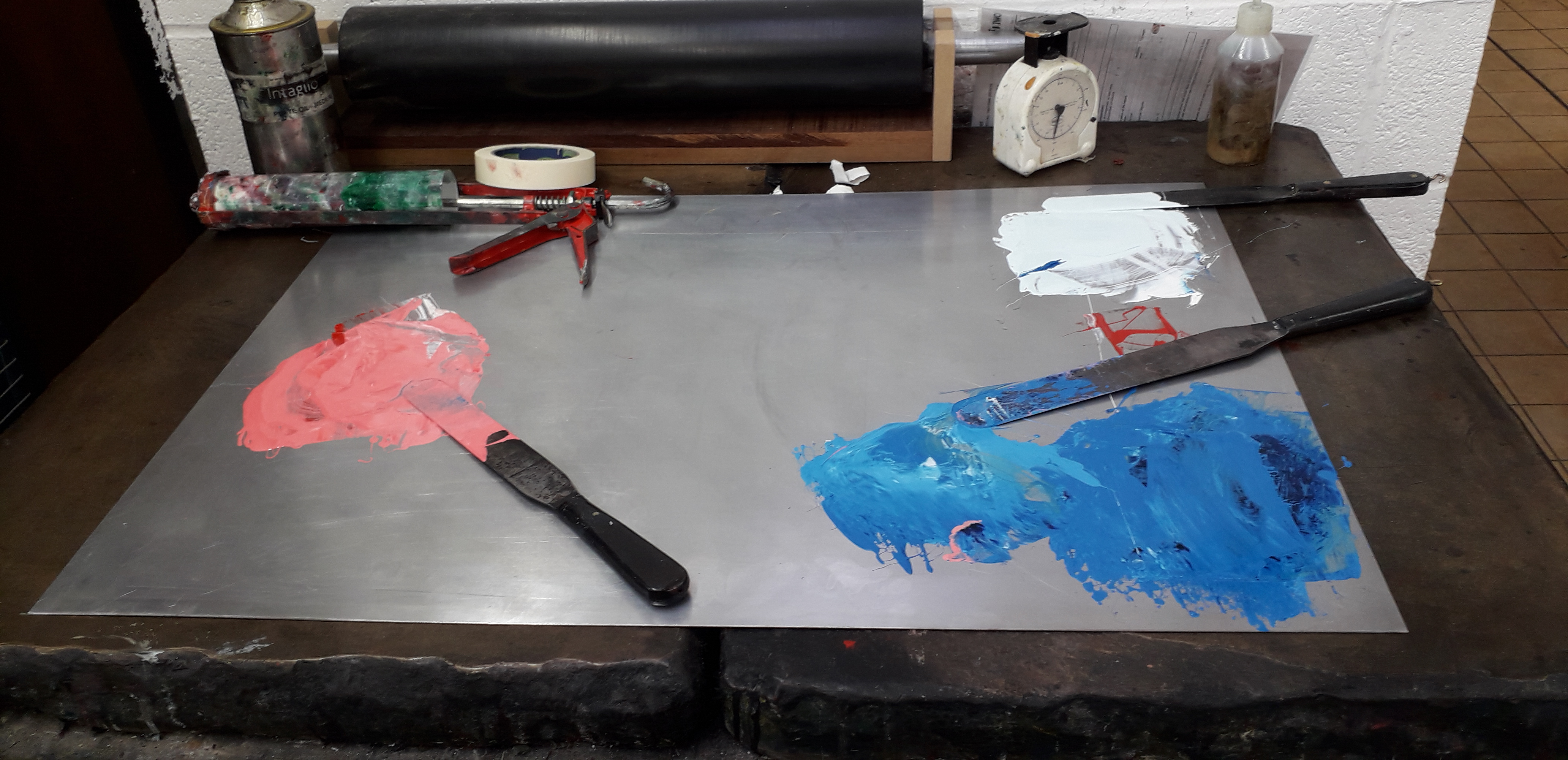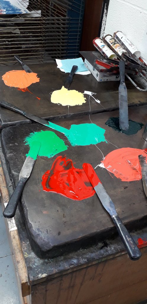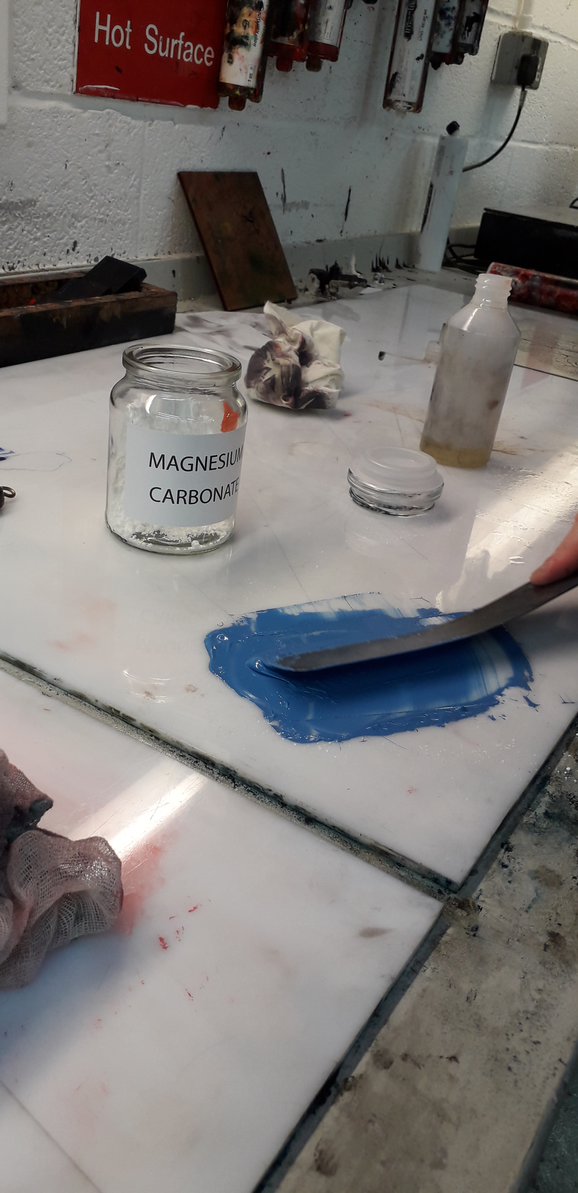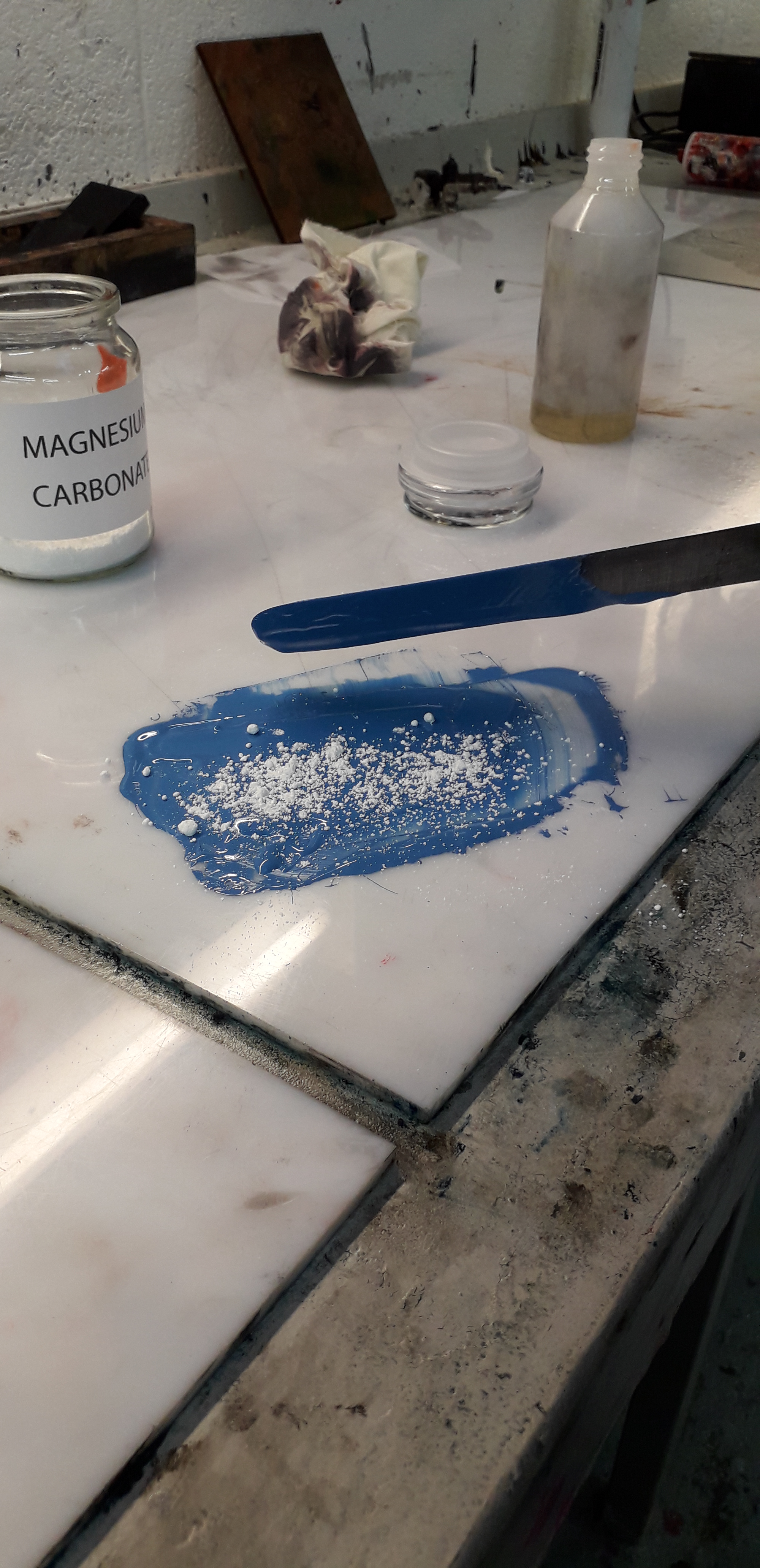 Colours applied nearly ready for the scrimFirst proofSecond proof chalk added to hide blemishesThe turquoise looked very gray so ultramerine to be added.No ultramerine available in etching ink so magnesium carbonate added to make the ink flow better into the etched grovesThe second plate I mixed prussian blue and bone black.