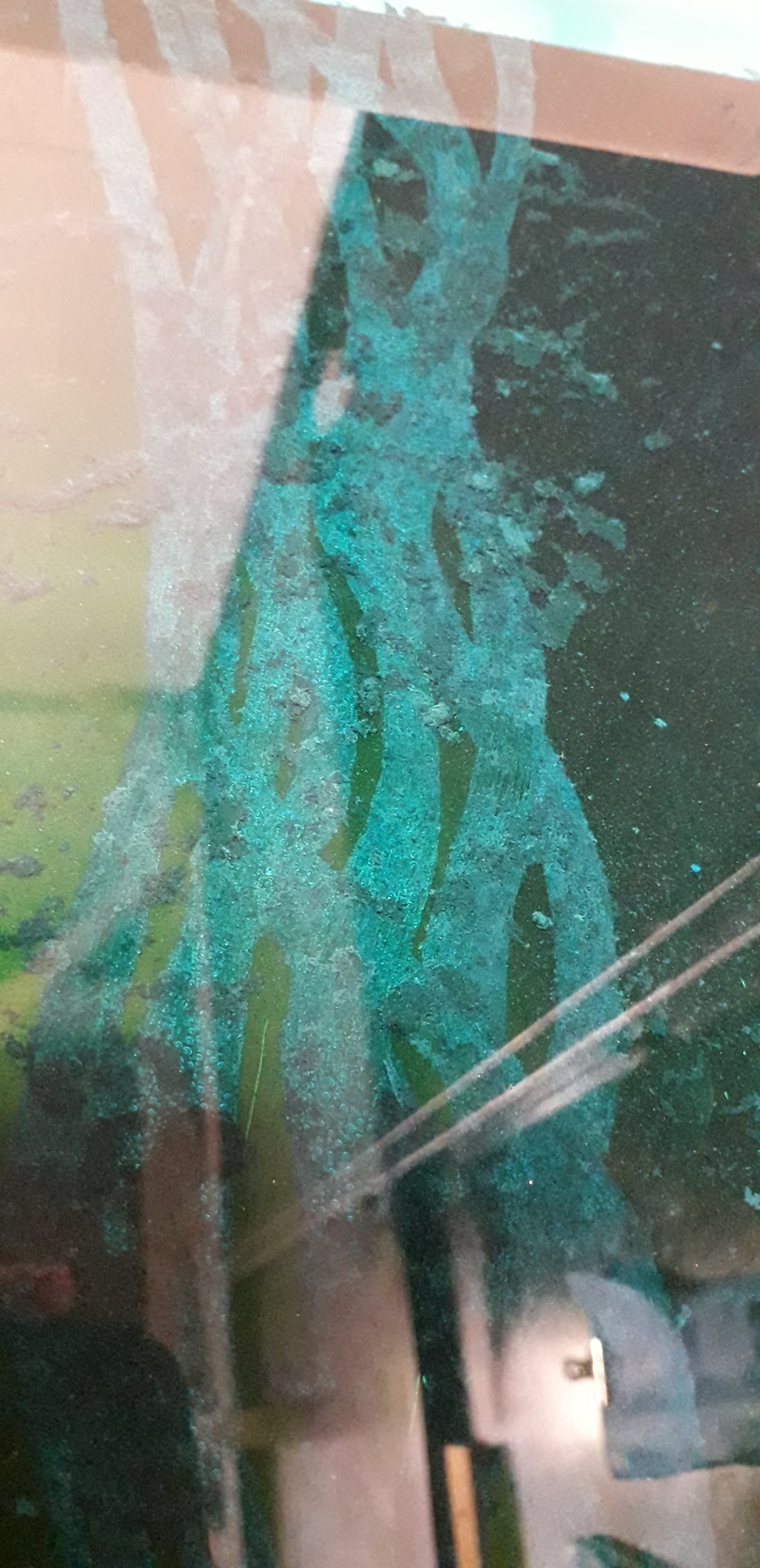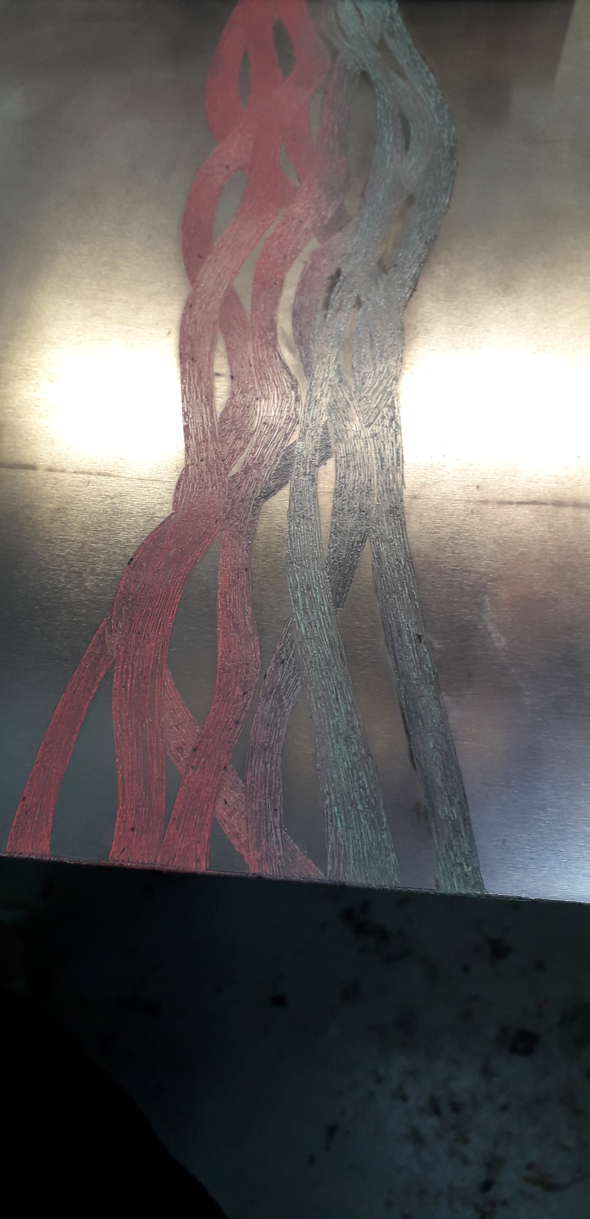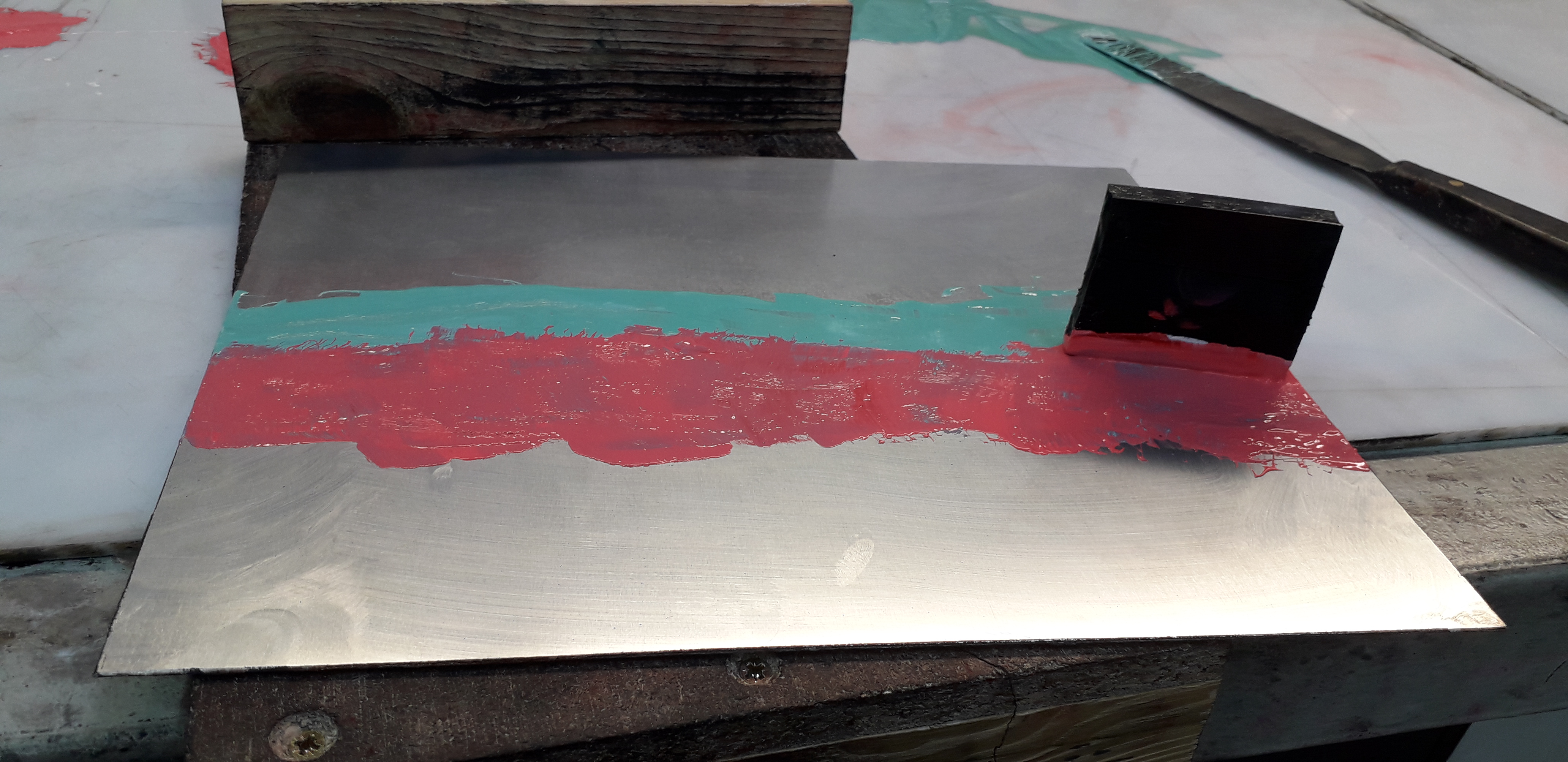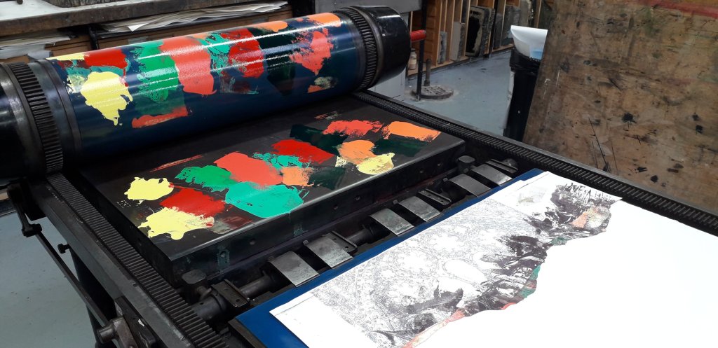 Colours applied nearly ready for the scrimFirst proofSecond proof chalk added to hide blemishesThe turquoise looked very gray so ultramerine to be added.No ultramerine available in etching ink so magnesium carbonate added to make the ink flow better into the etched grovesThe second plate I mixed prussian blue and bone black.