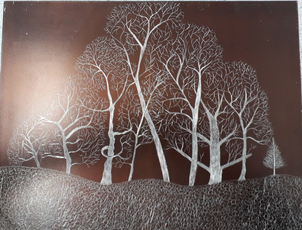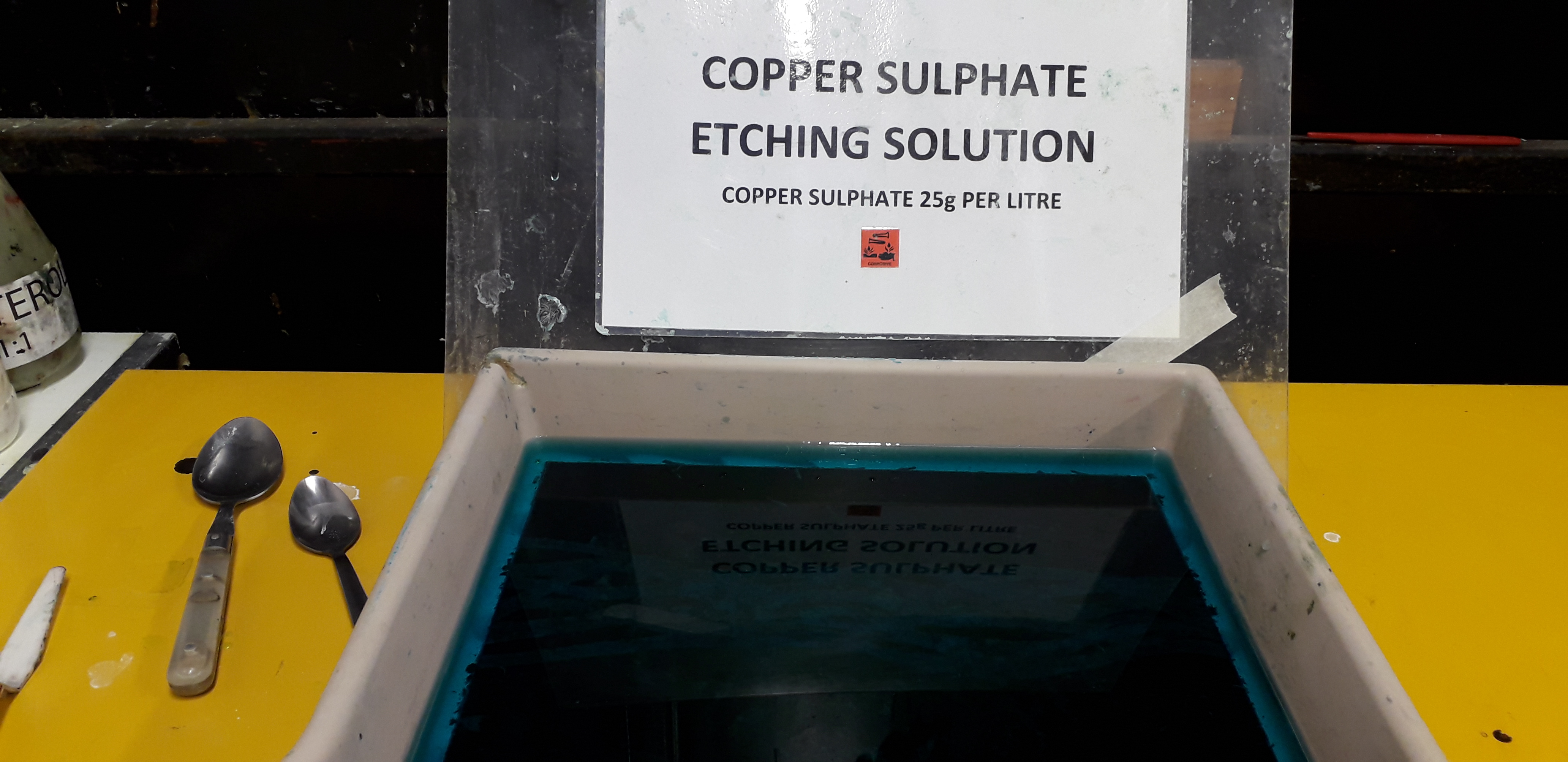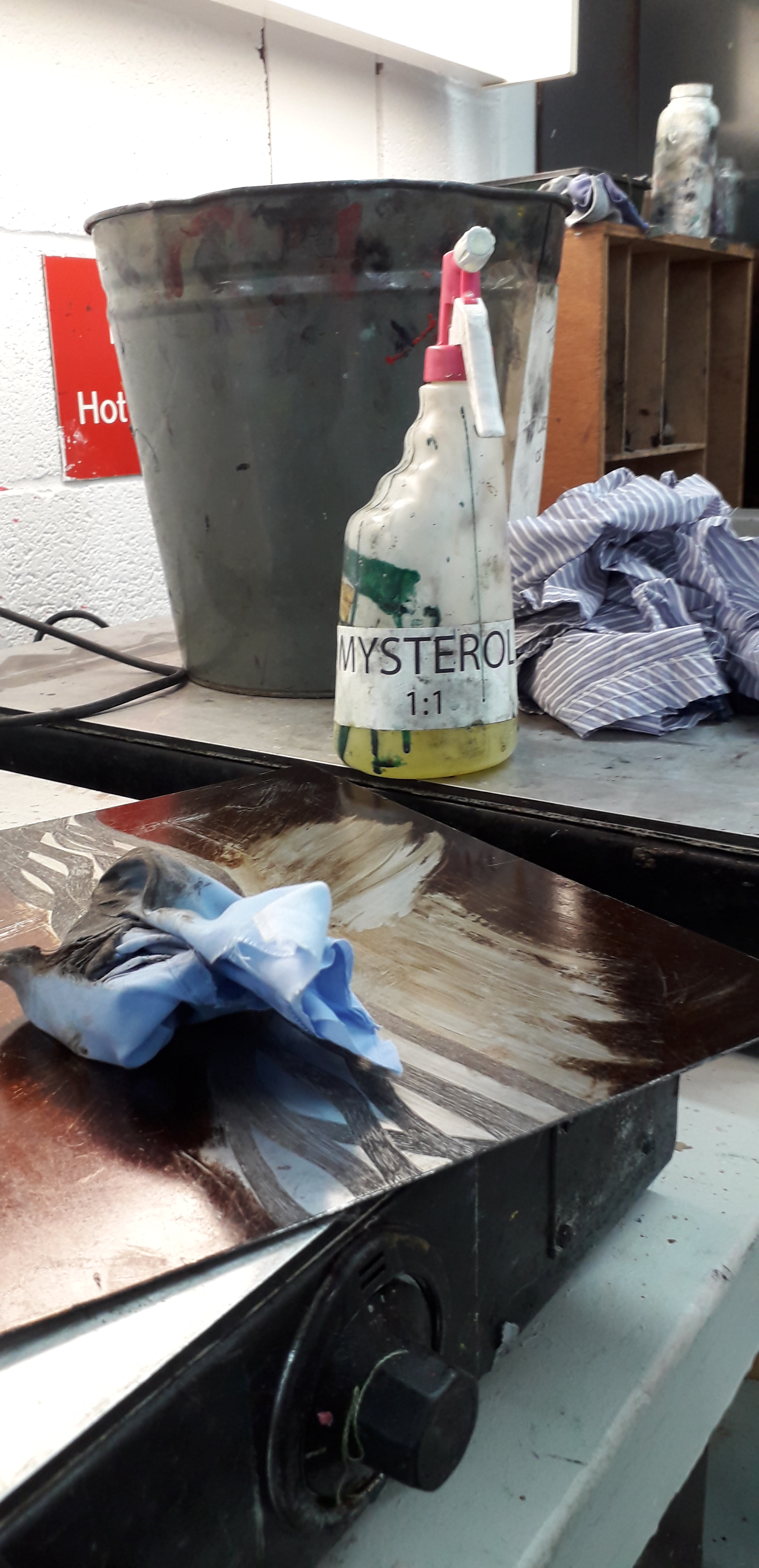 Straw hat varnish painted over scratches so the etching process doesn’t make them deeperWorking out where to put the wallpaper to form my fields the sky template was used as a negative to cut the ground template then pieces of textured wallpaper were ripped to form the fields.Sky with fields and field boundry first attemptPlate in solution for 30 mins checked then another 30 minutesEtching in progress Plate placed on the hot plate and sprayed with mysterol and wiped with a clean rag to remove the wax resist