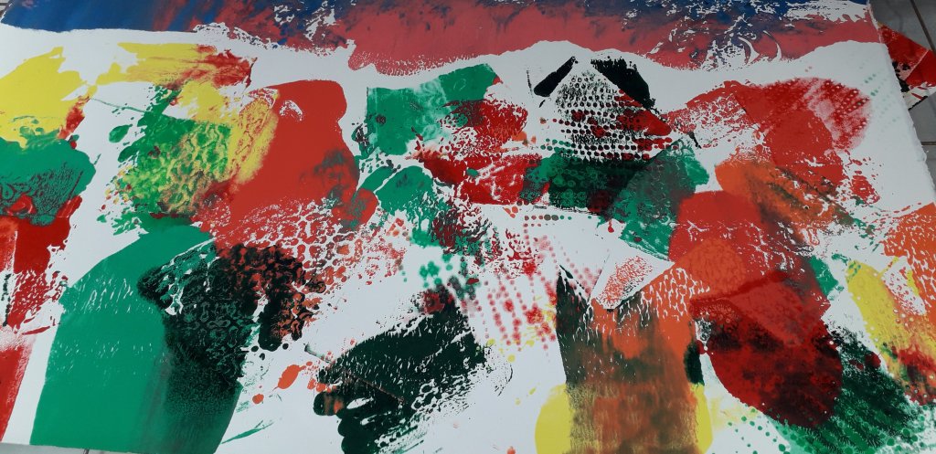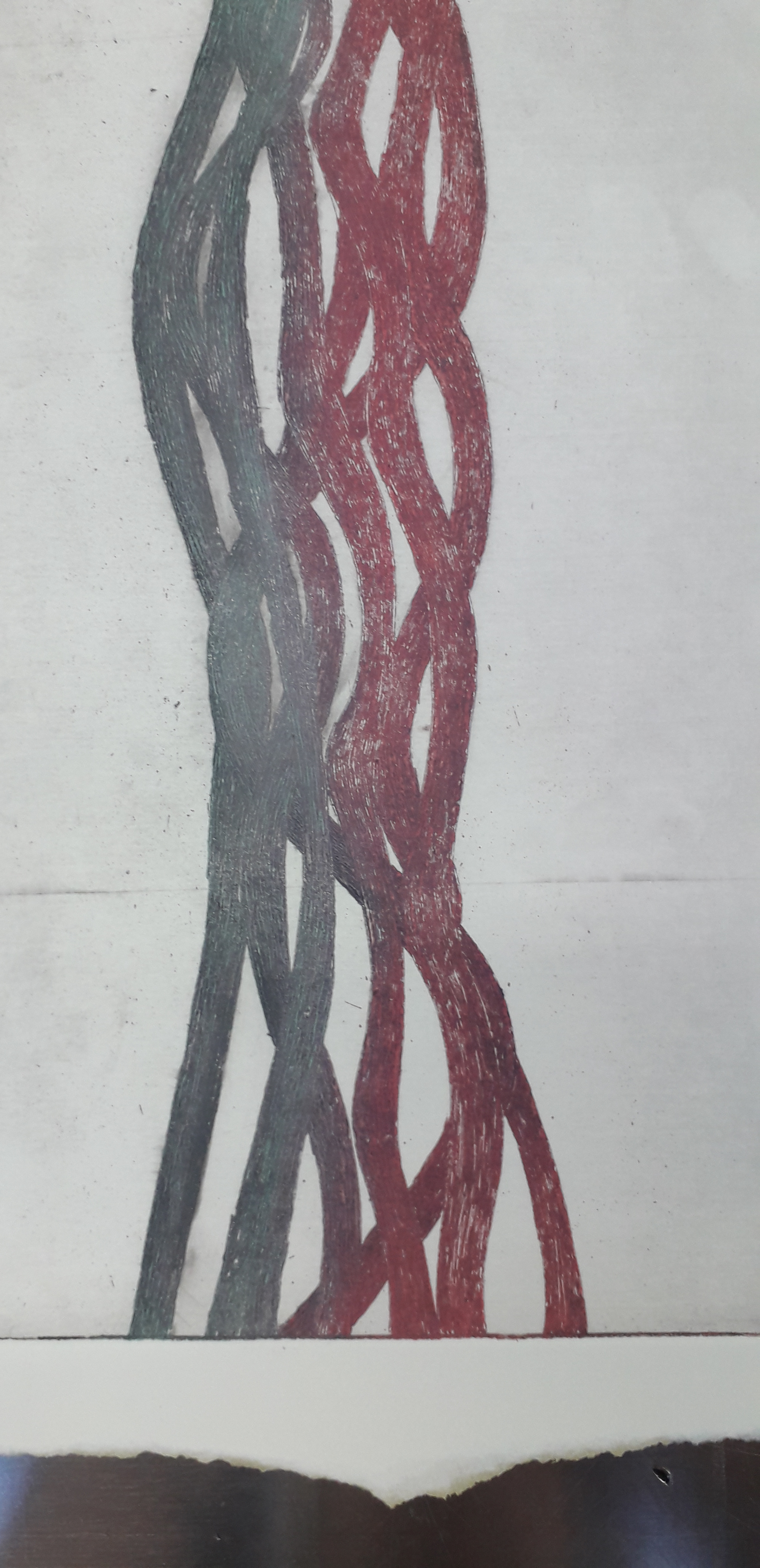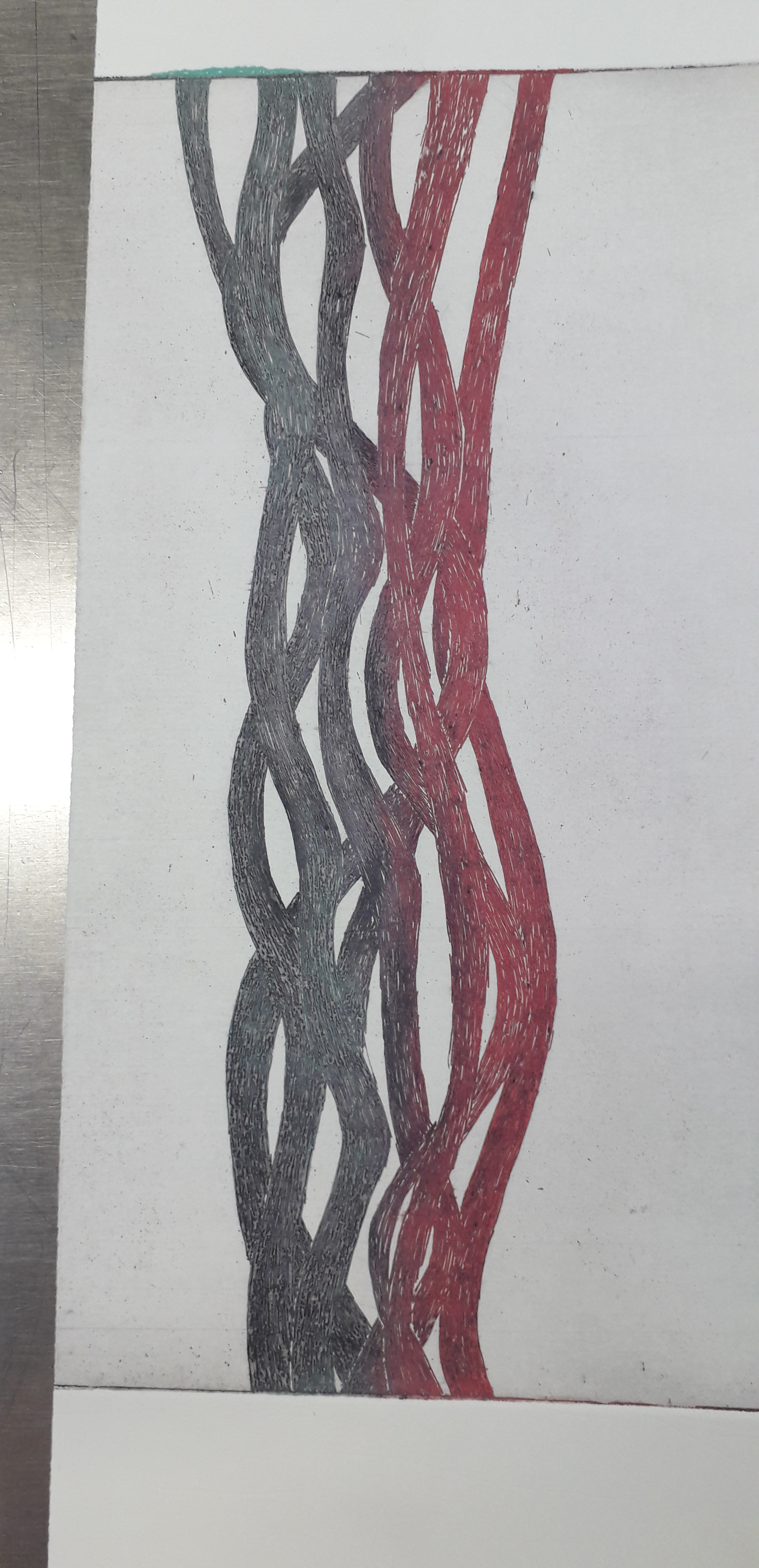 Good day started by removing the scratches with straw hat varnish. Then putting my first hard ground into the etching solution. Whilst that was etching I worked on one of my mono prints.